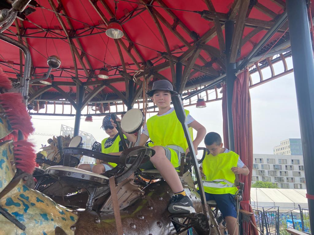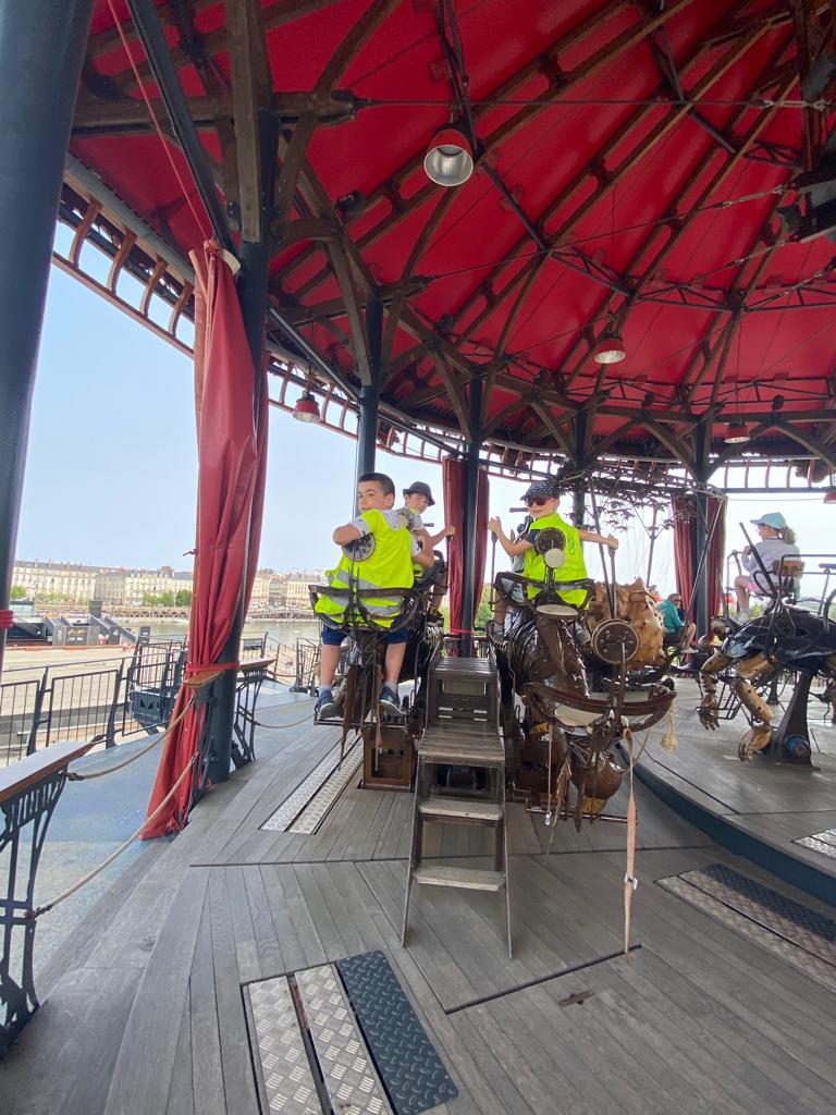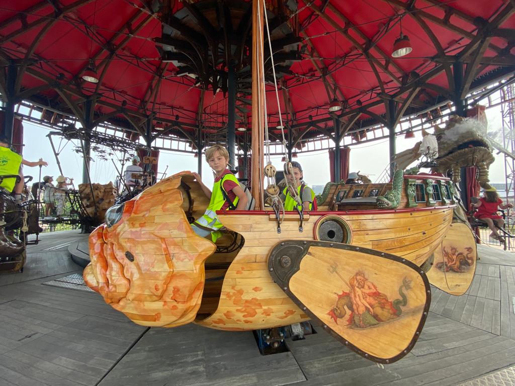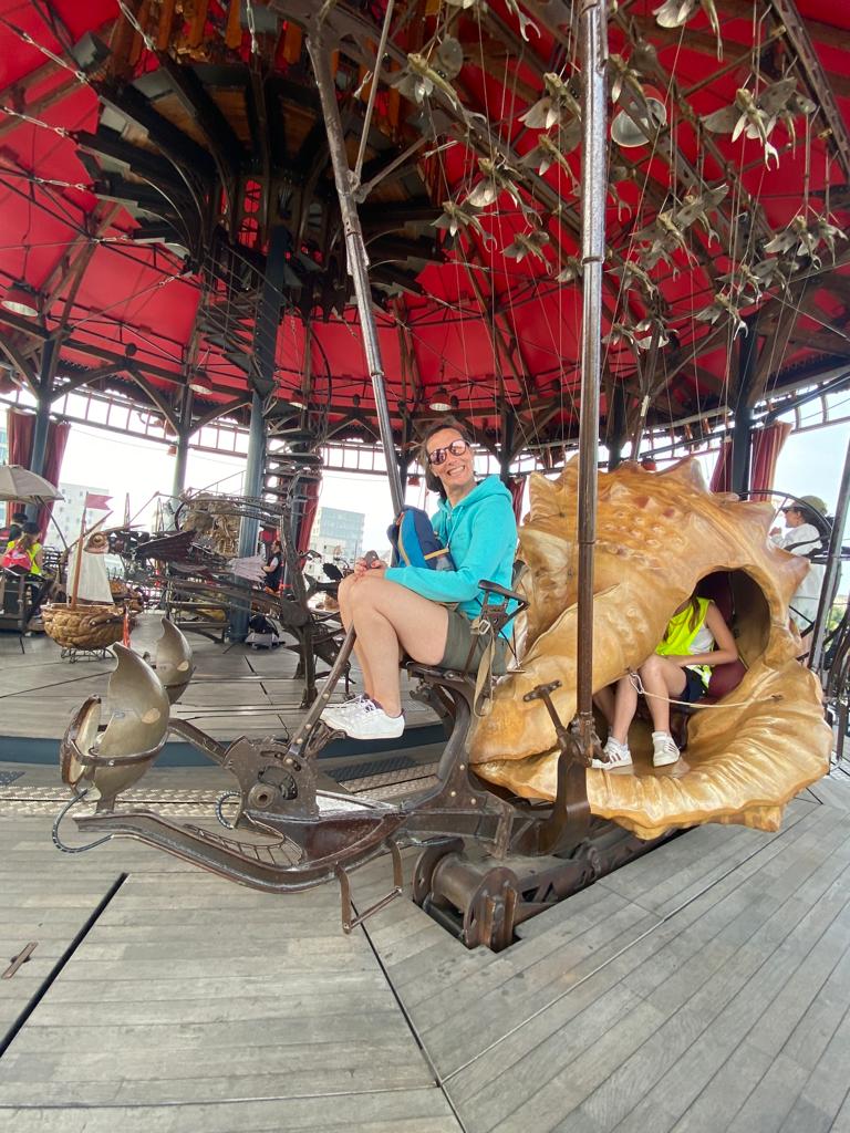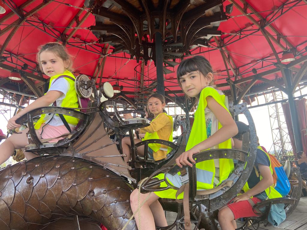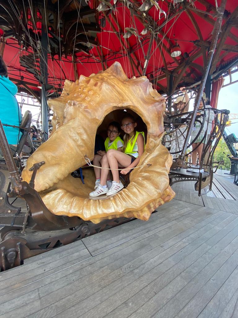 Ensuite, direction la Galerie des Machines pour en découvrir tous les fantastiques animaux. Chenille, colibris, héron, araignée, caméléon, paresseux, fourmis et nuée de papillons… Manon a même eu le privilège d’être choisie pour faire avancer la chenille! Puis, un petit tour aux Ateliers de la Galerie et un coucou à notre célèbre éléphant, avant de rejoindre le Carrousel des Mondes Marins pour une visite guidée très intéressante et… un tour de manège au dernier étage avec une vue splendide!