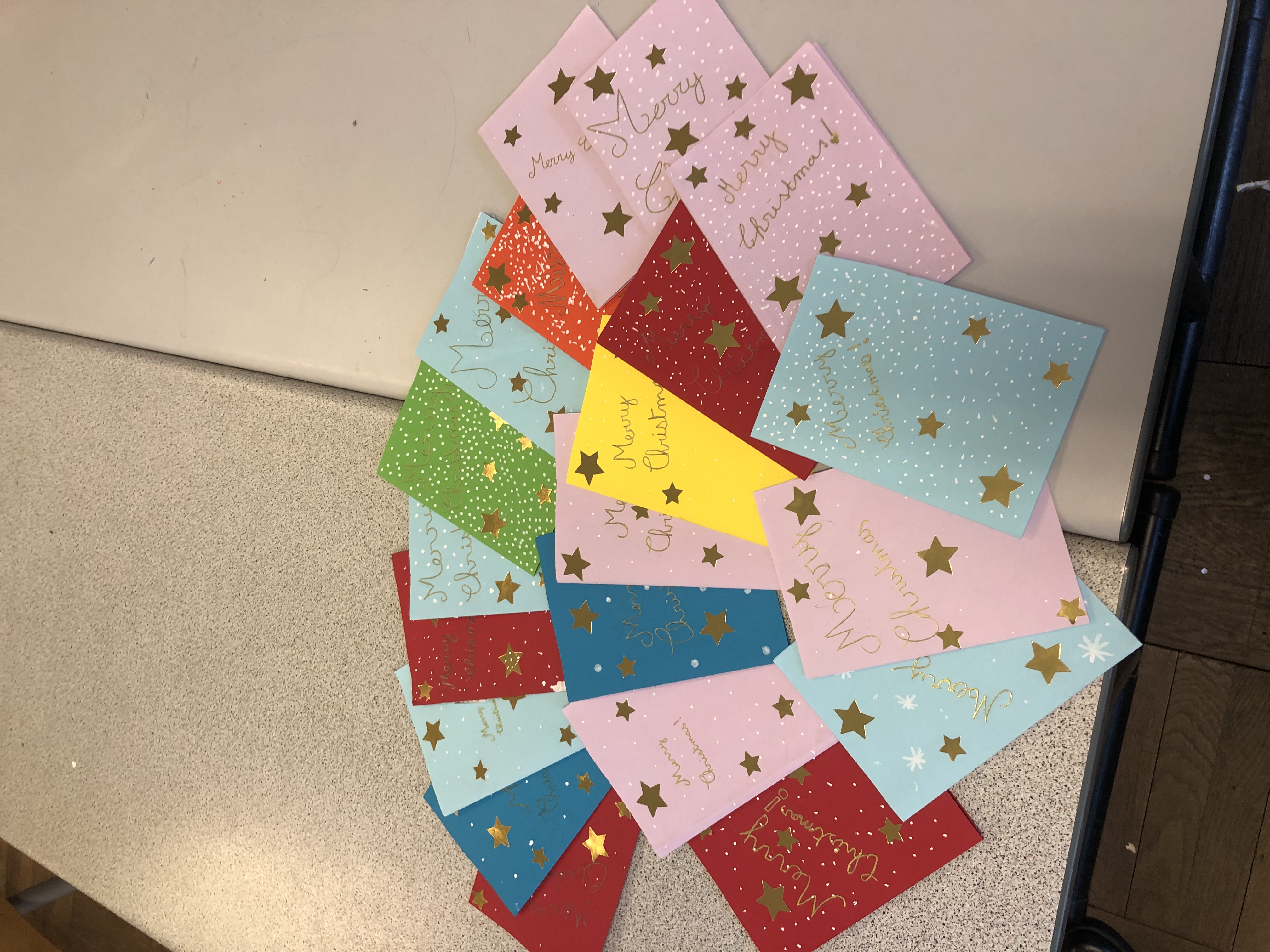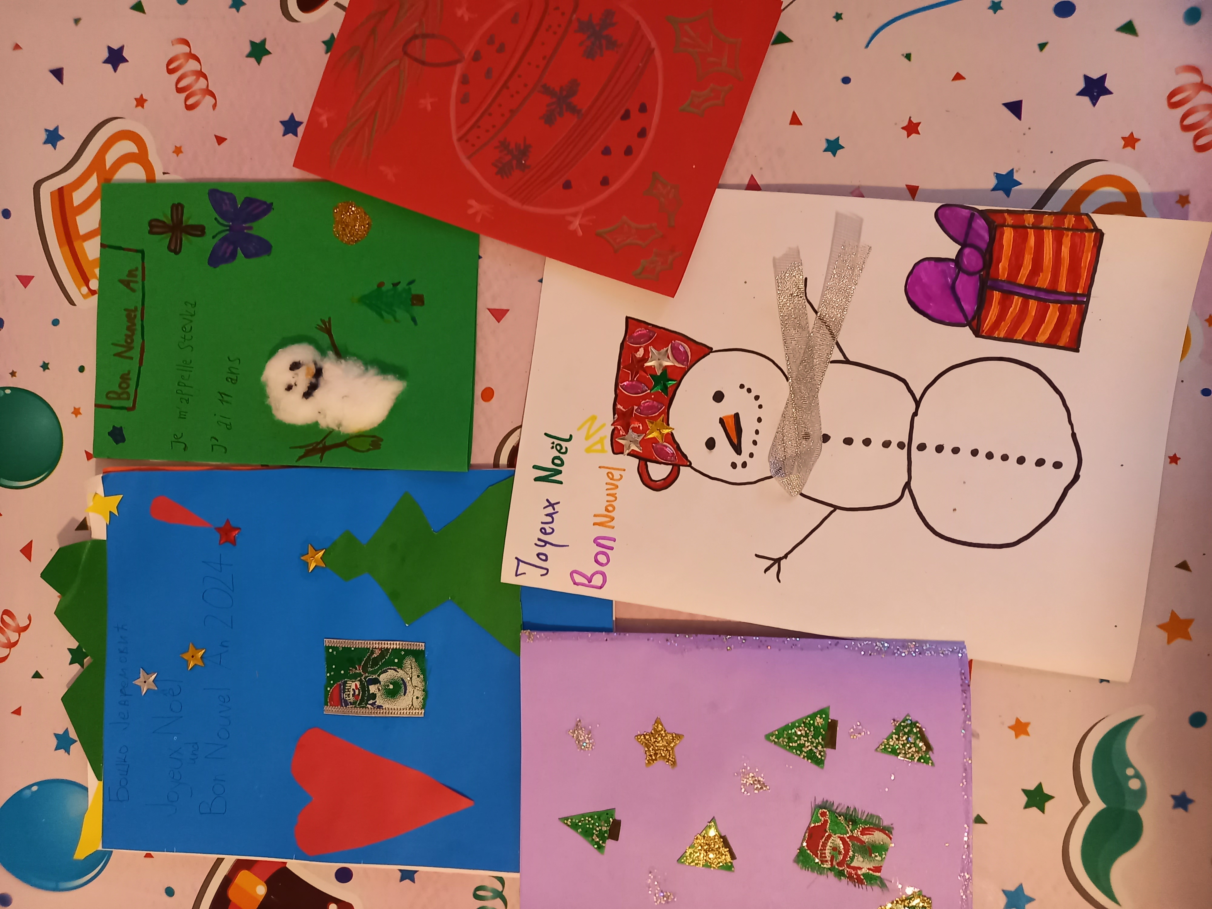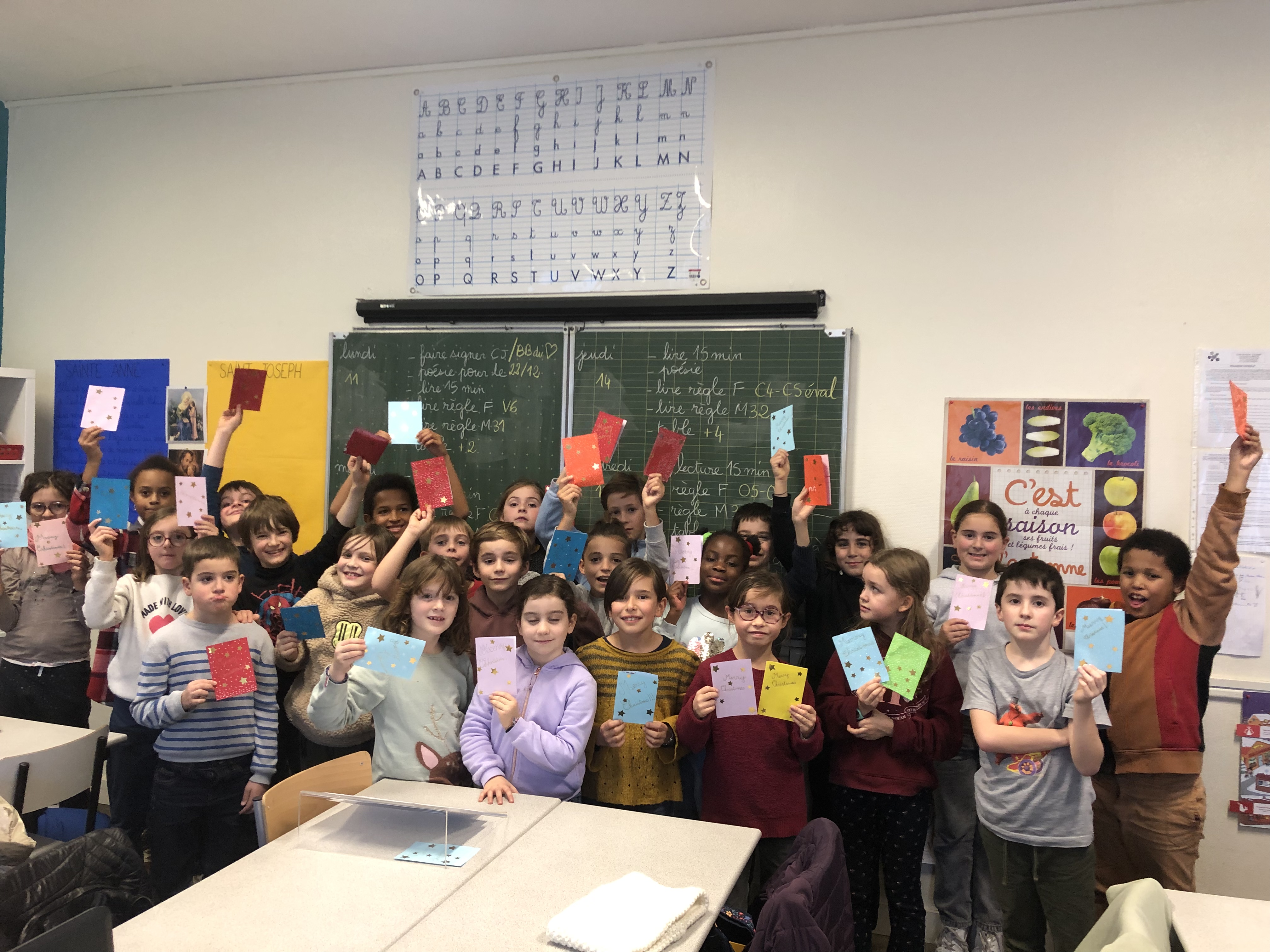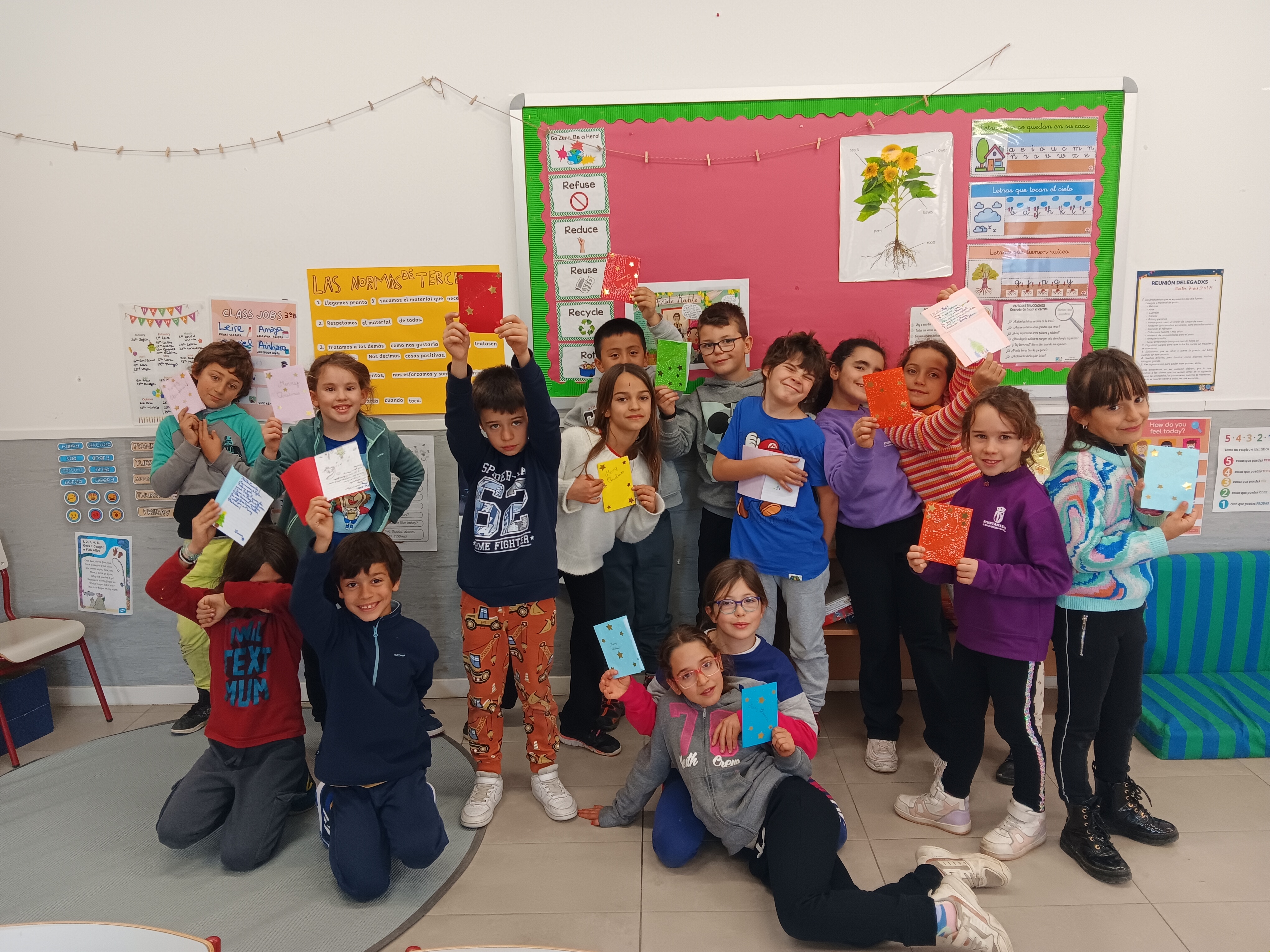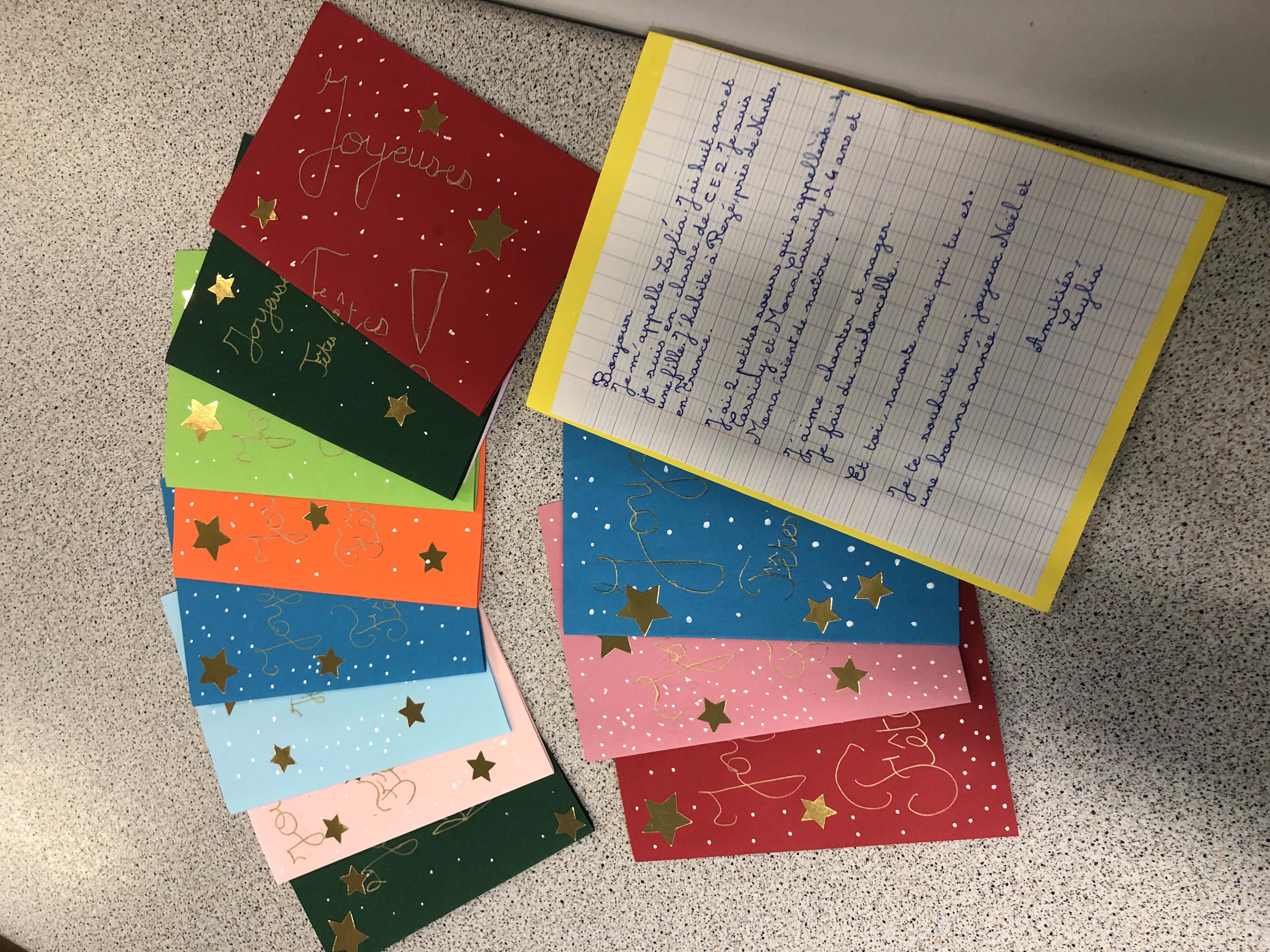 En décembre et janvier, ce sont les cartes de voeux (en anglais!) qui sont à l’honneur, avec quelques phrases pour se présenter aux élèves madrilènes. Nous leur avons envoyé une grosse enveloppe et avons reçu la leur avec beaucoup de joie et d’excitation.