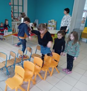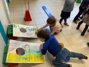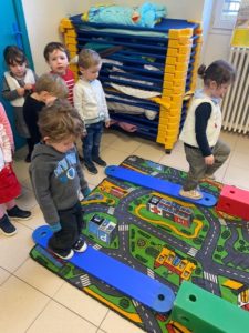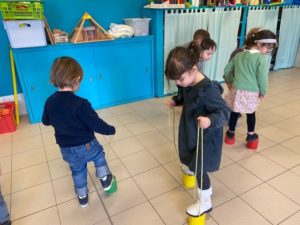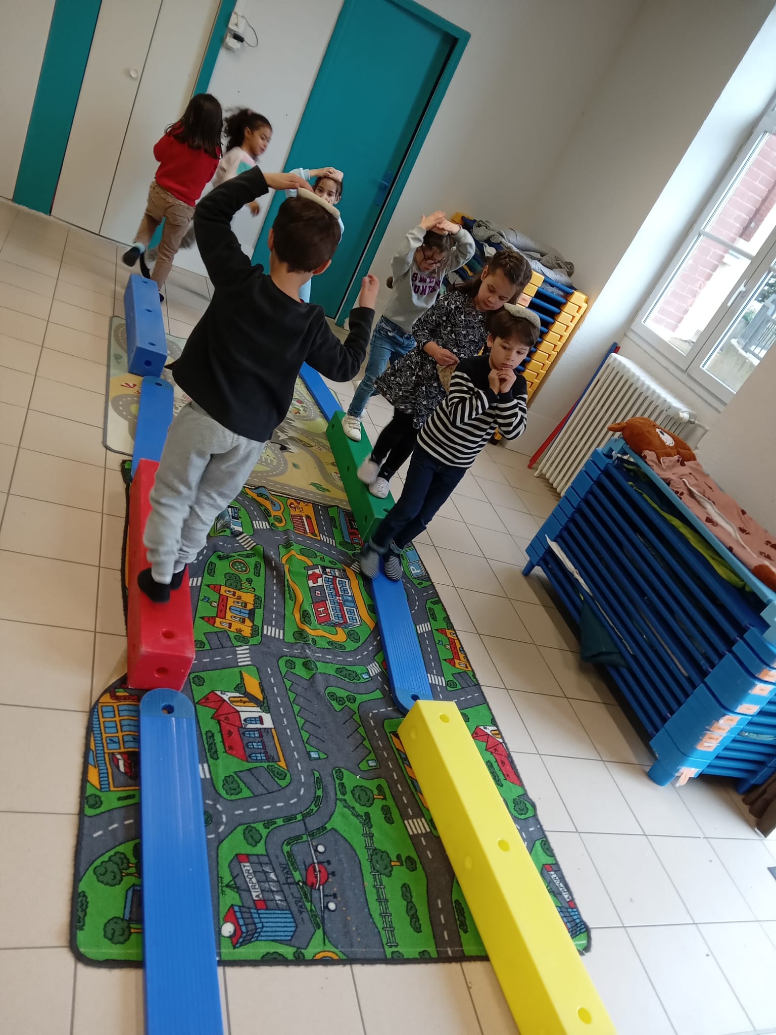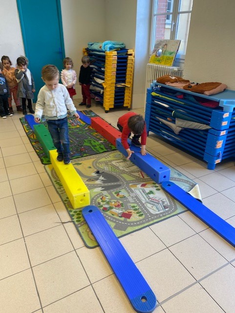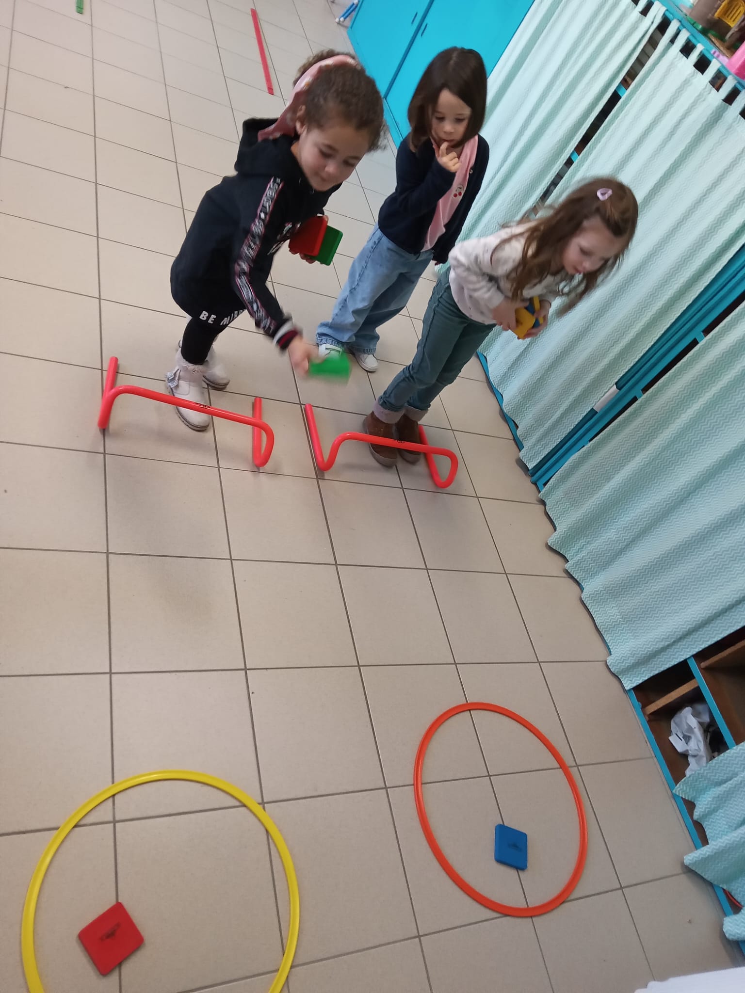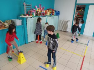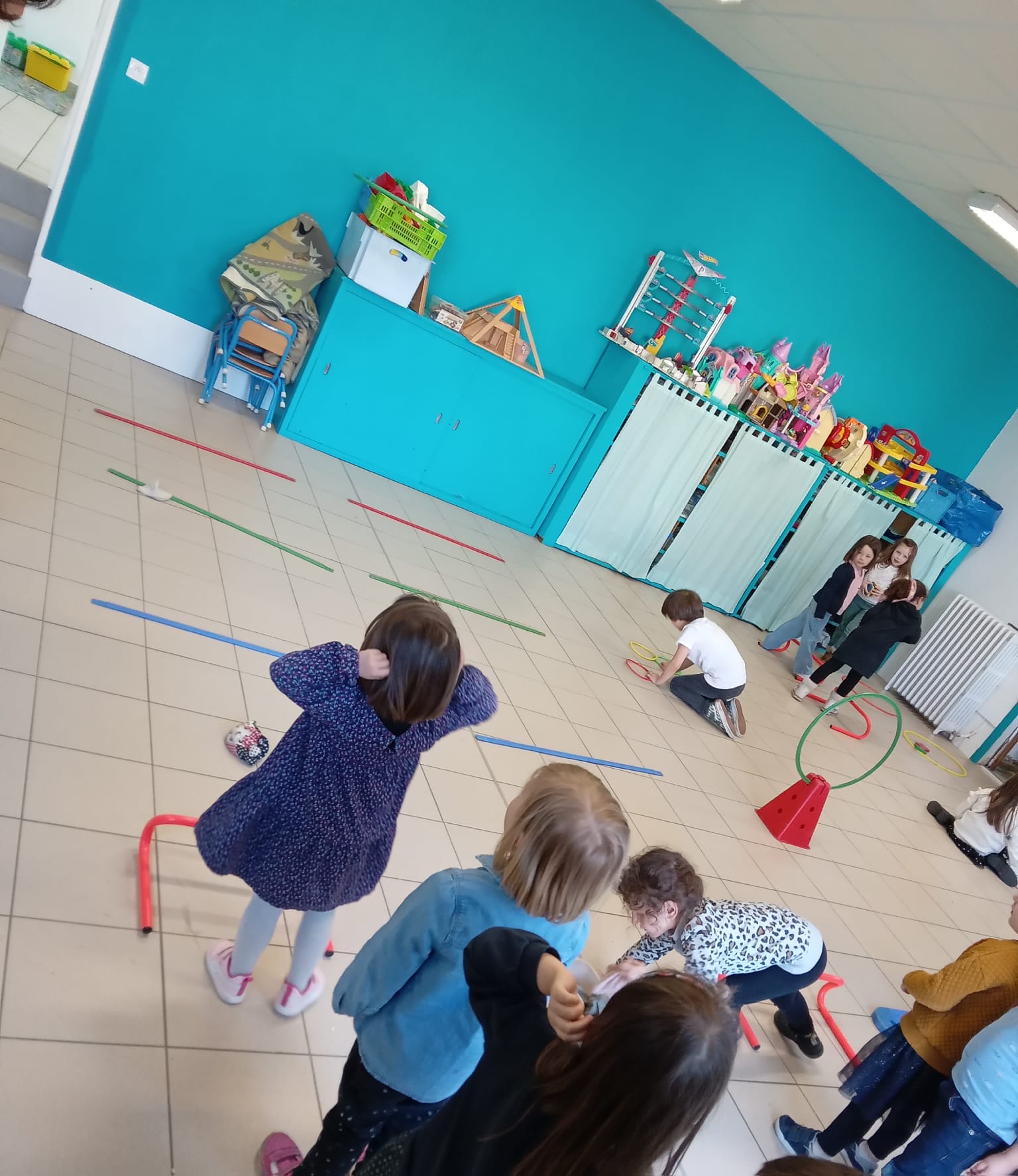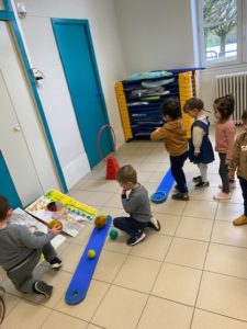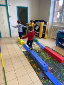 Nous profitons de cette période pour travailler en ateliers dans la salle de motricité.