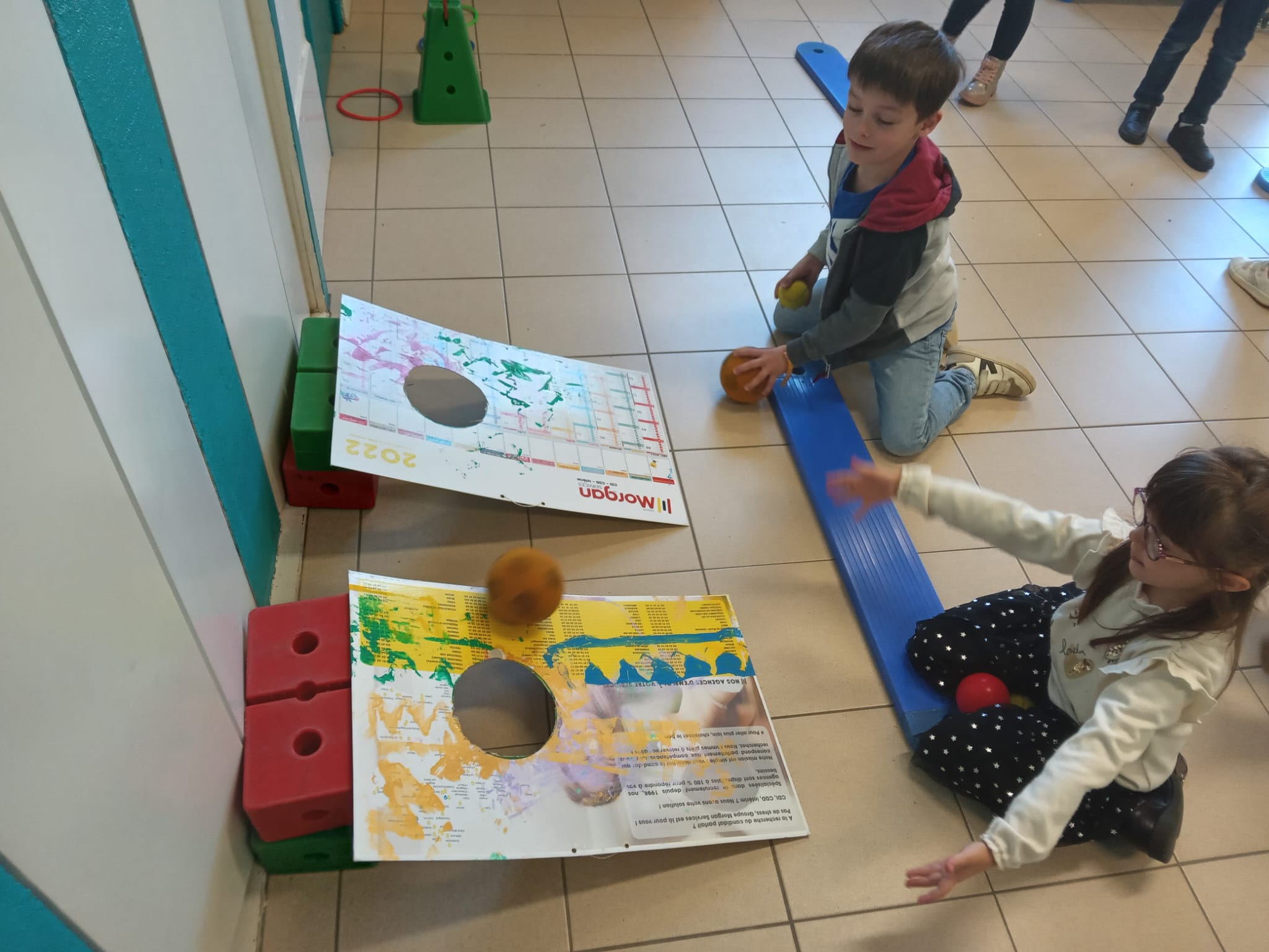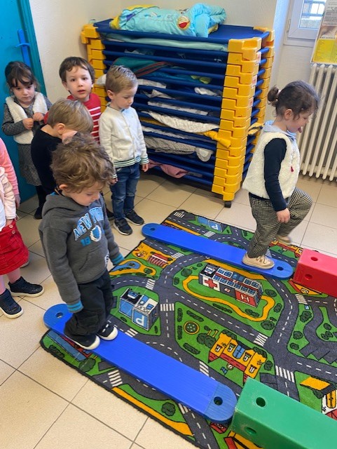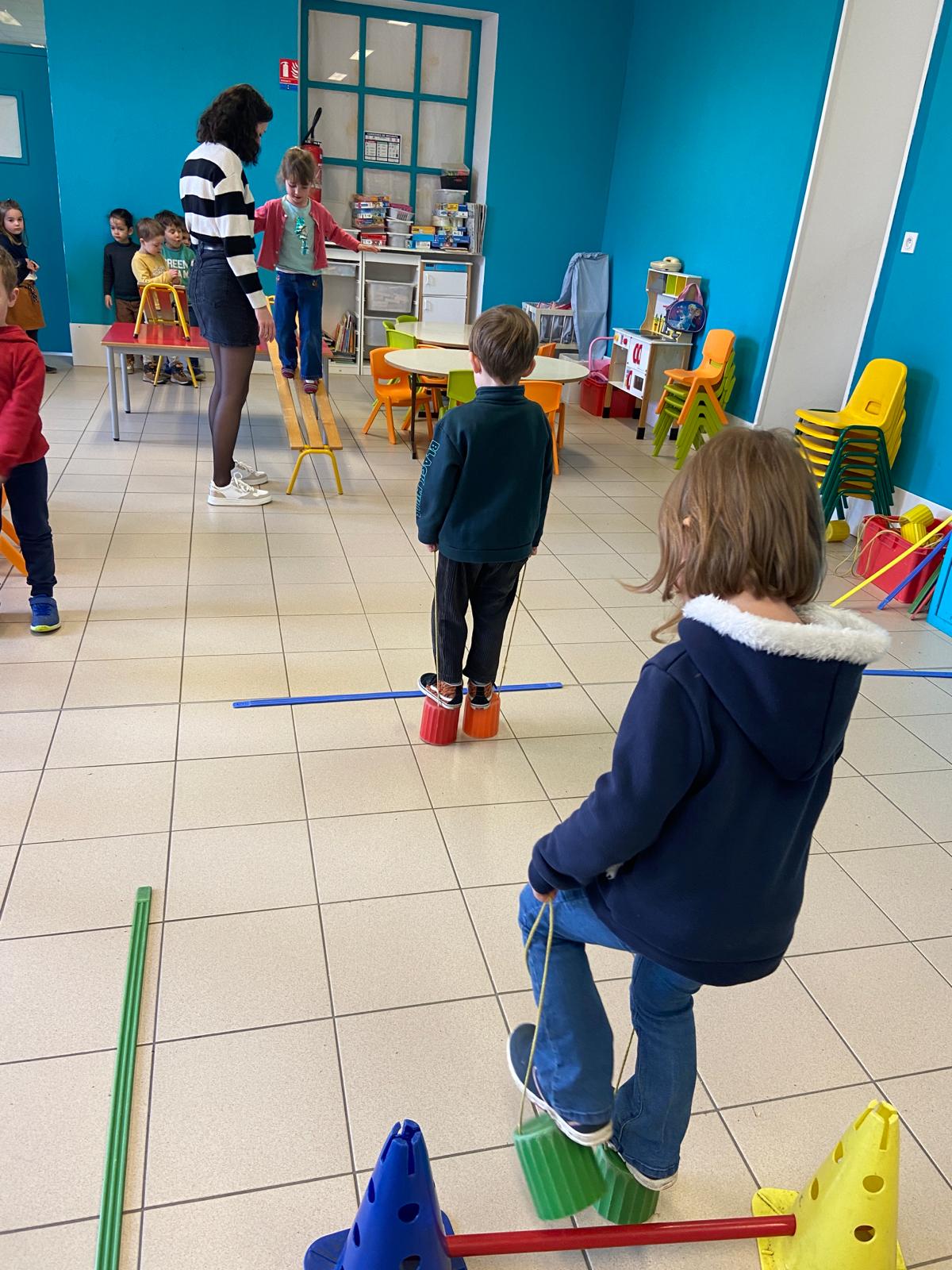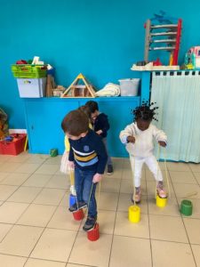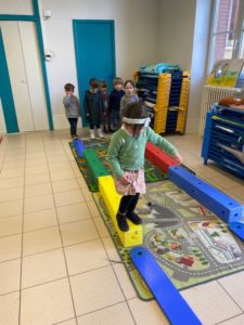 Tout d’abord le Lancer; lancer loin, viser puis lancer….Puis des ateliers pour améliorer l’Equilibre; marcher sur un banc, sur une poutre, marcher avec des échasses! Nous osons prendre des risques et ça nous plait beaucoup.3, 2, 1 prêts ? Bougez!