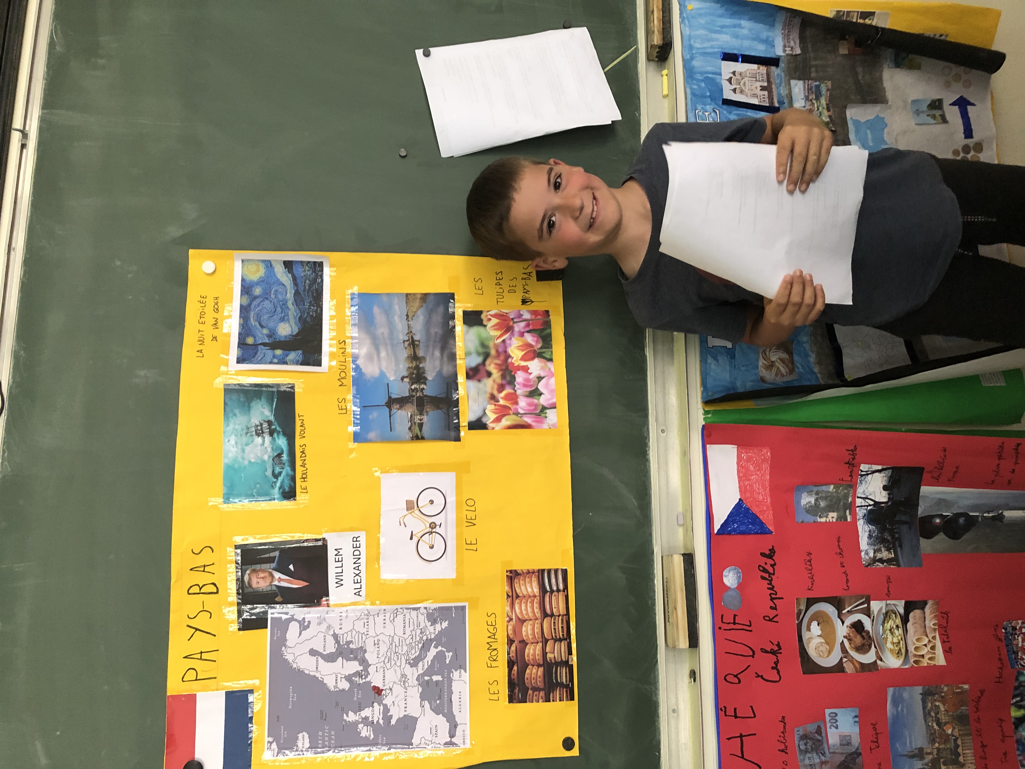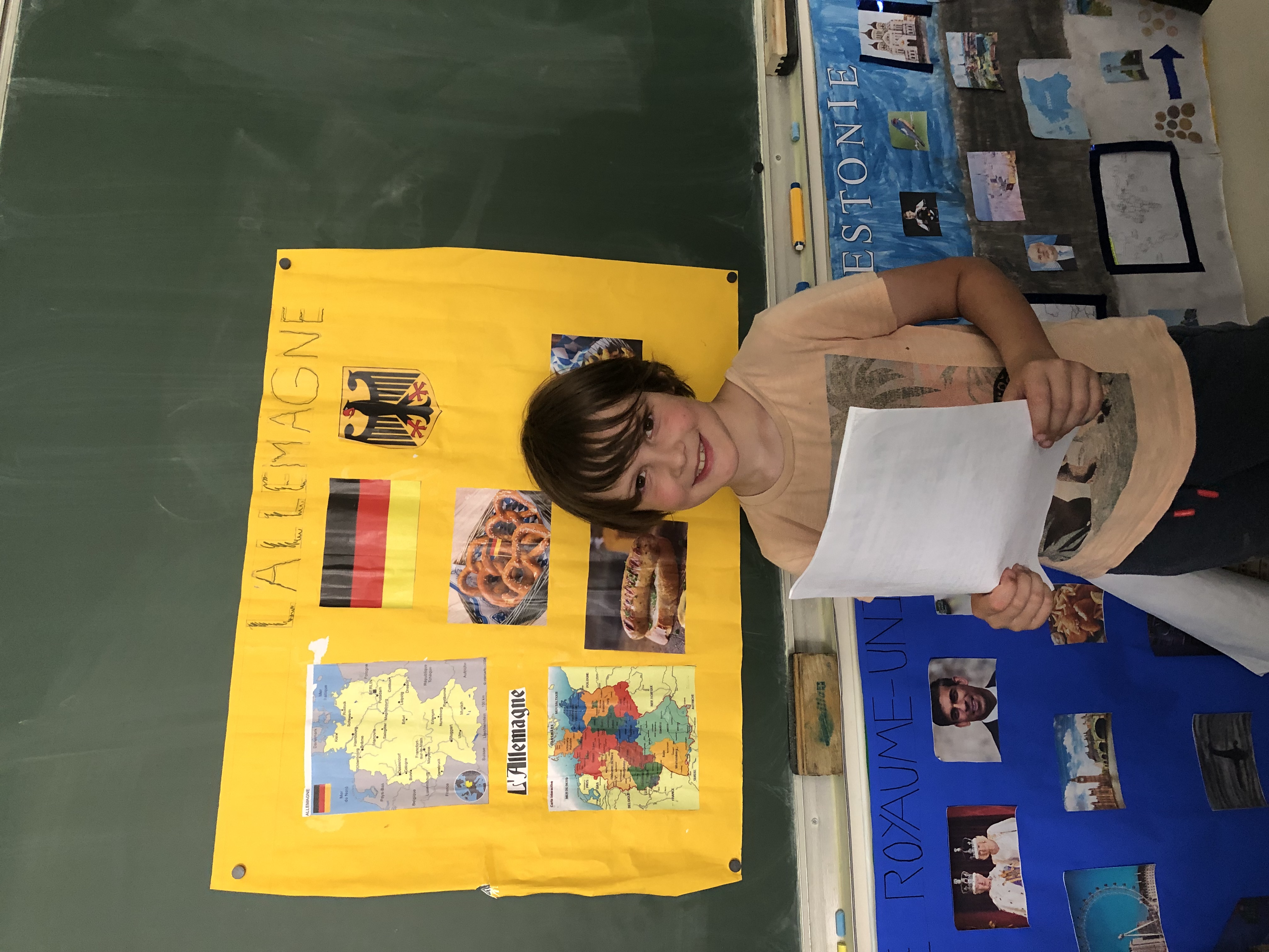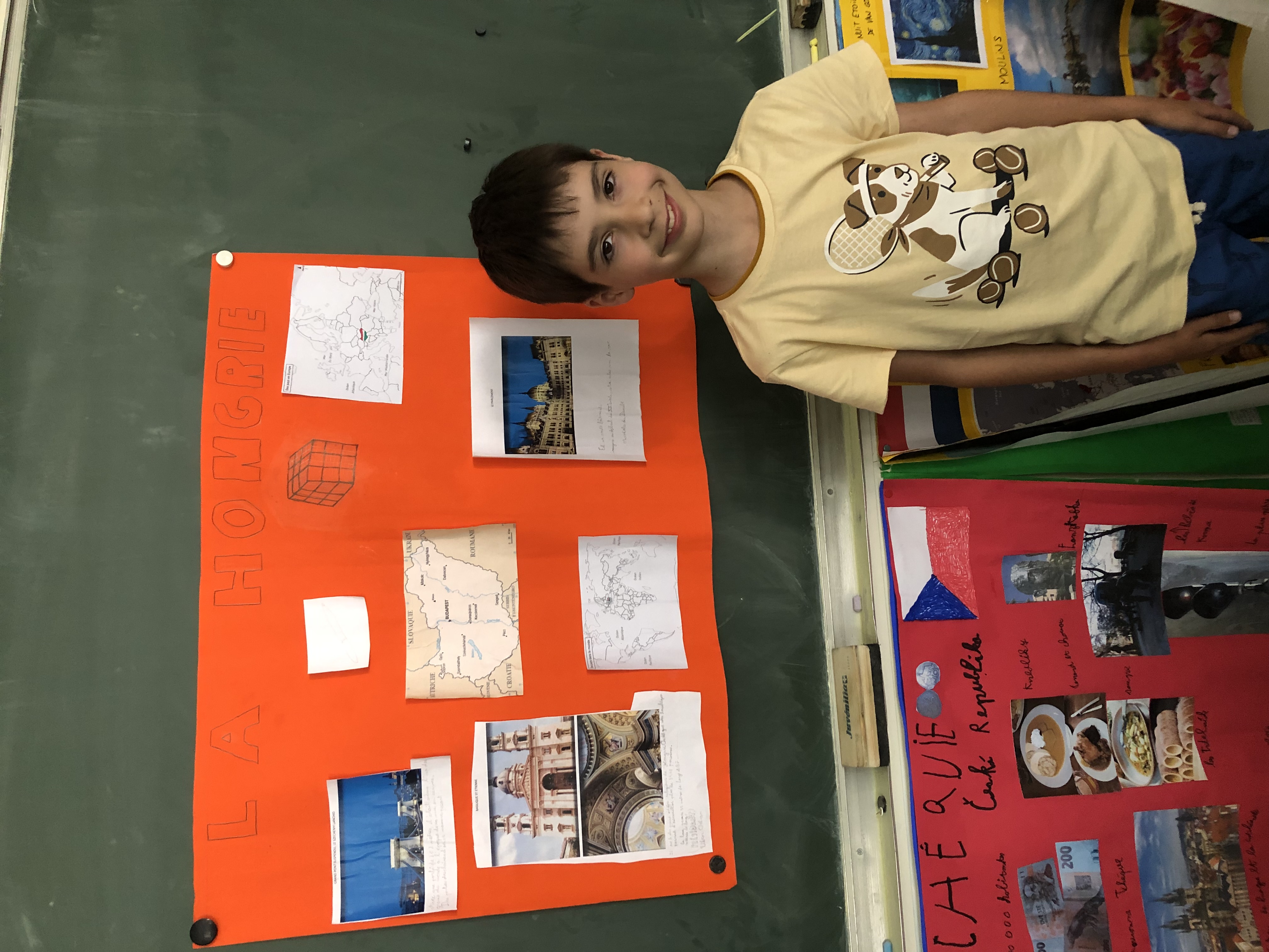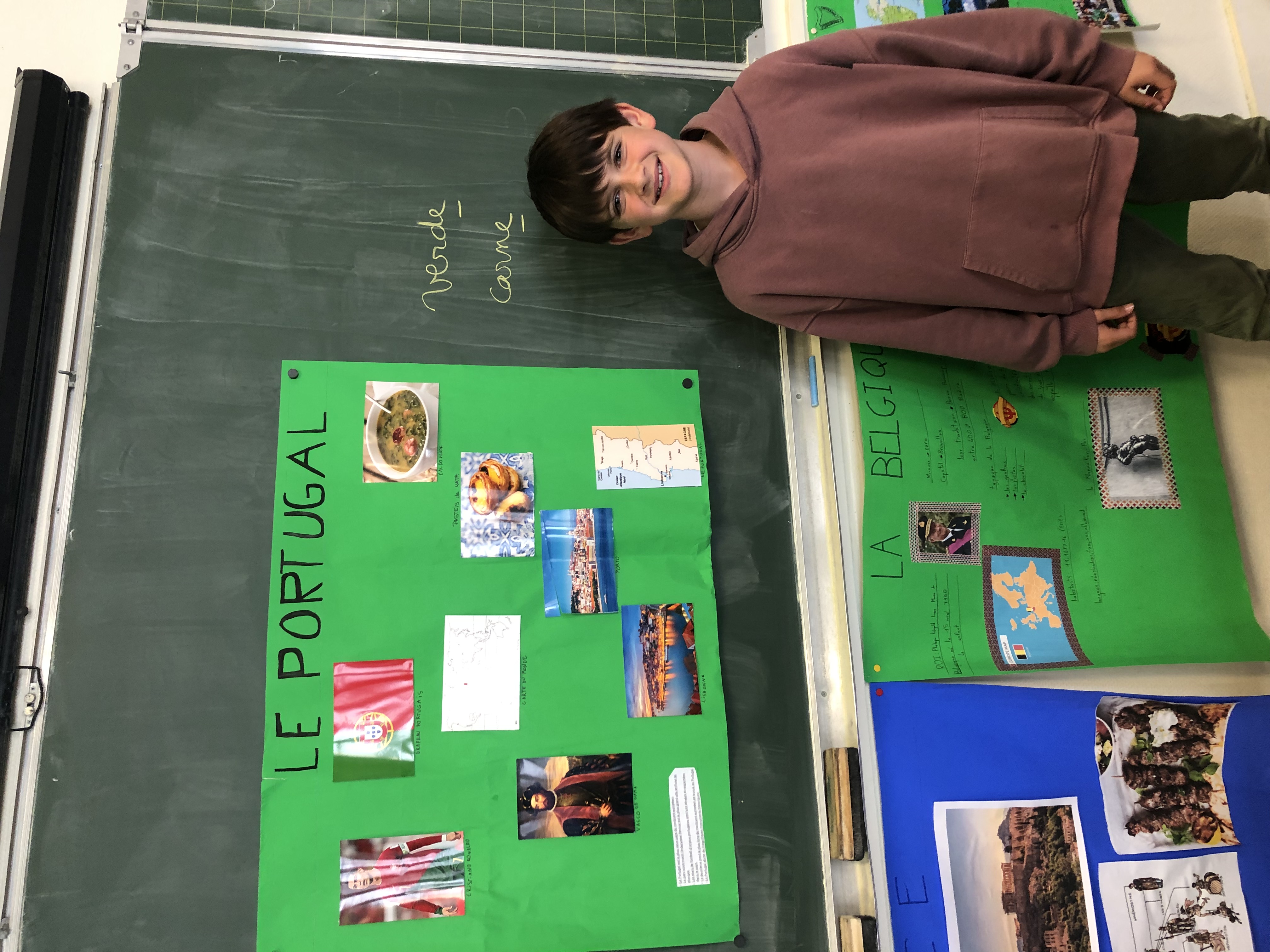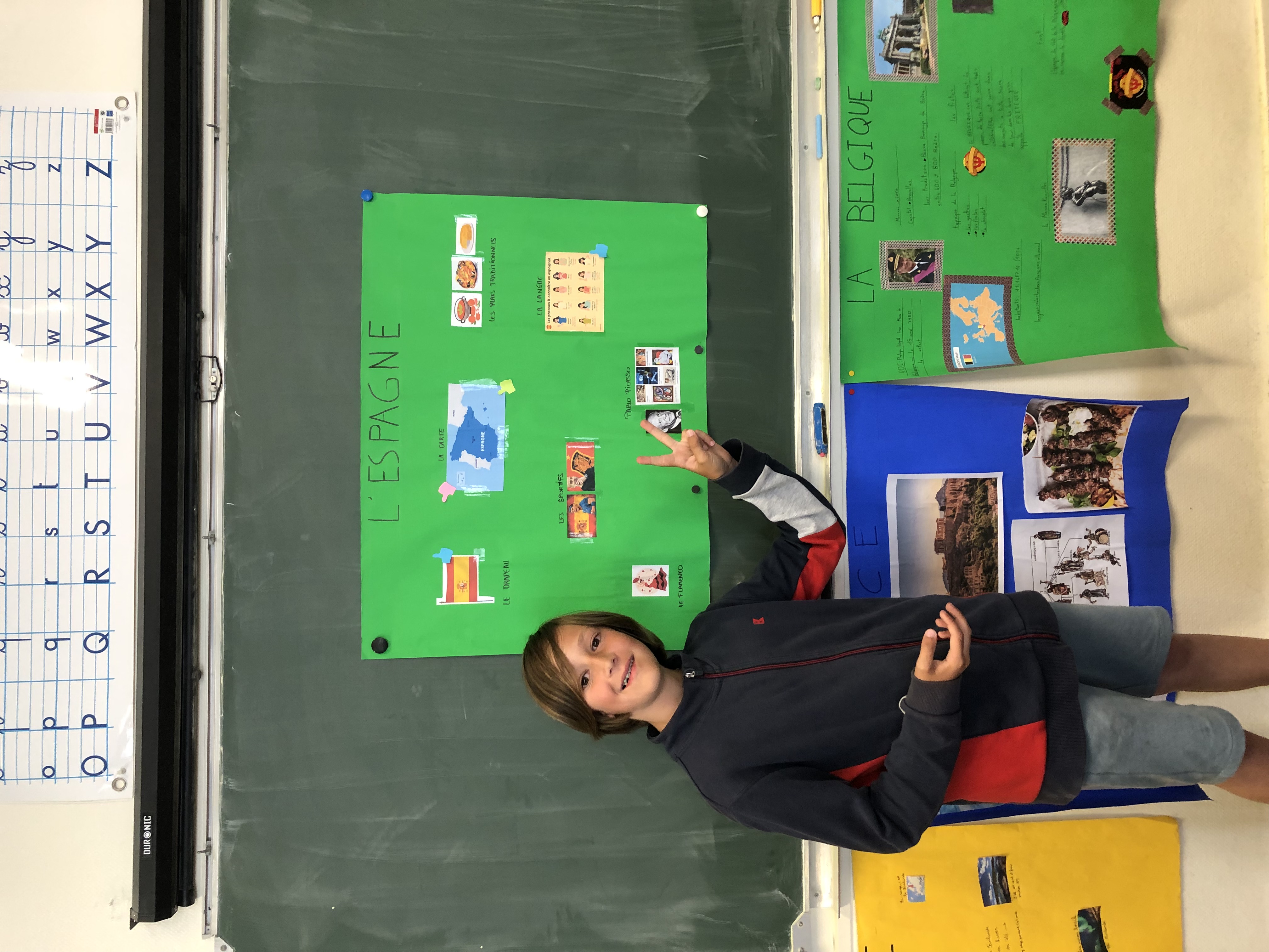 Ils ont fait des recherches (Bravo à tous les parents qui ont pleinement participé à ce projet!) sur le pays choisi: situation géographique, pays limitrophes, population, superficie, capitale, langue officielle, monnaie, gouvernement, hymne, drapeau, gastronomie, culture et histoire, quelques mots du quotidien… Ils ont imprimé, écrit et dessiné, se sont entrainés à présenter et ont concocté un quizz pour évaluer l’écoute de leurs camarades.