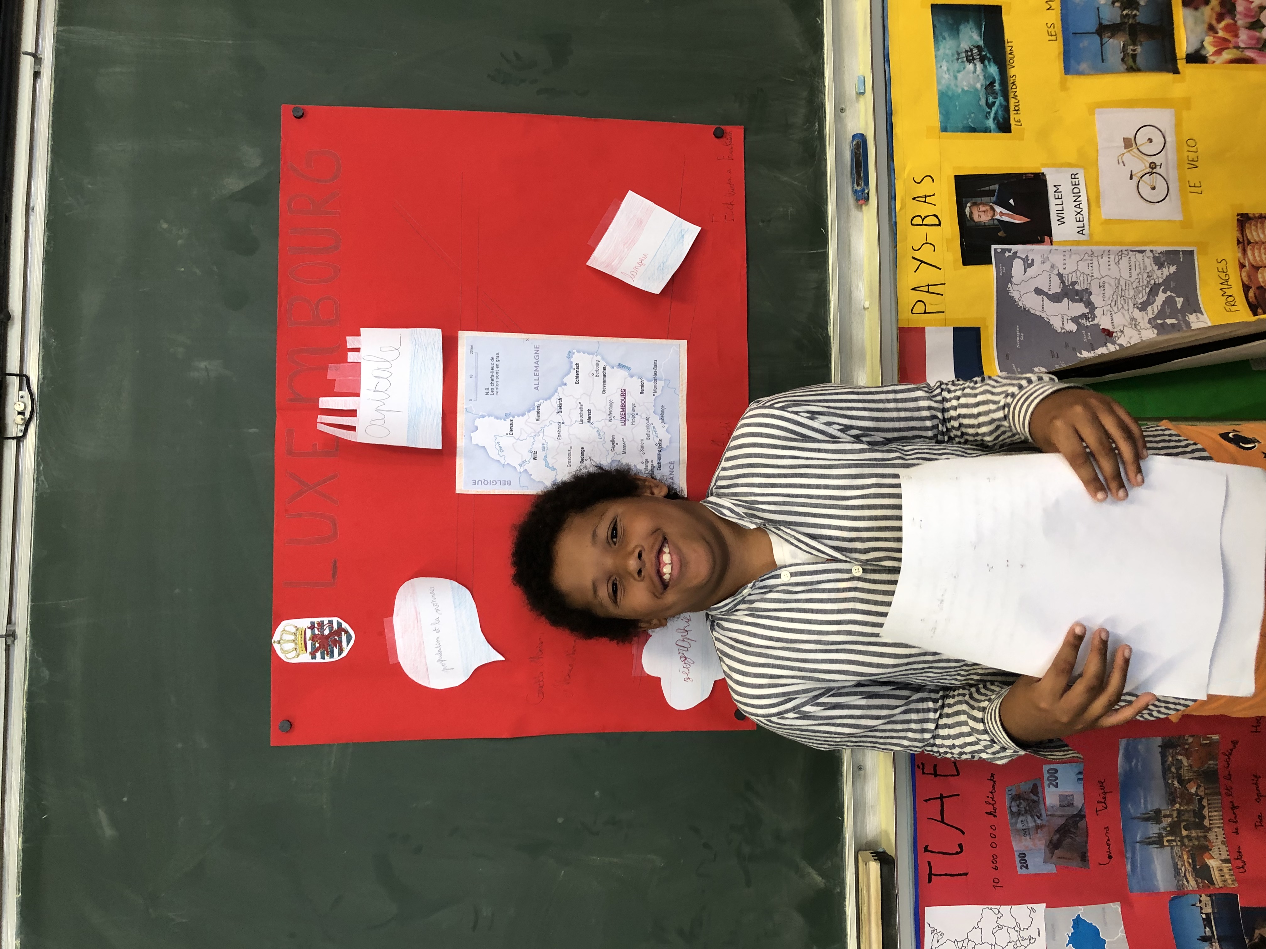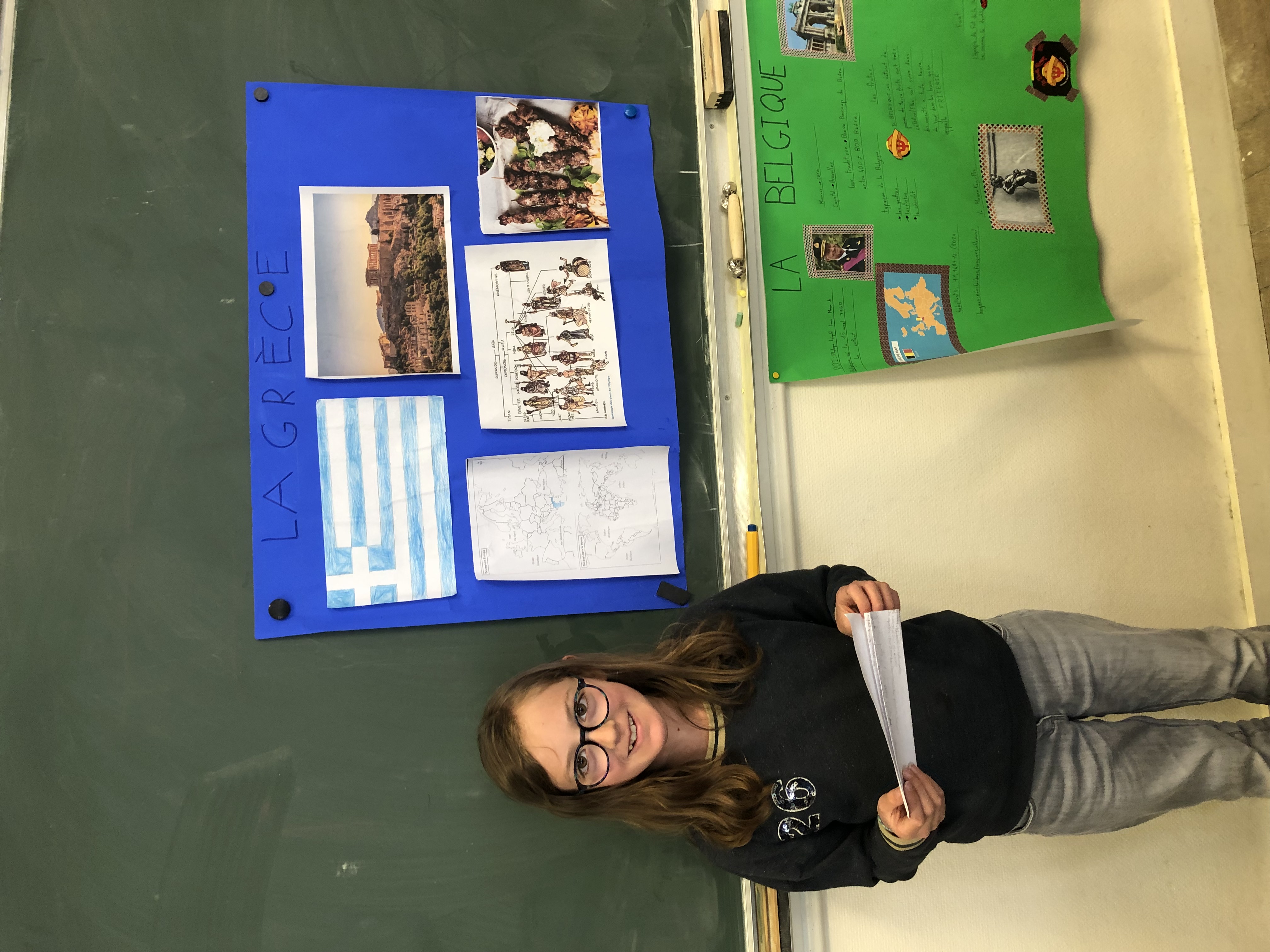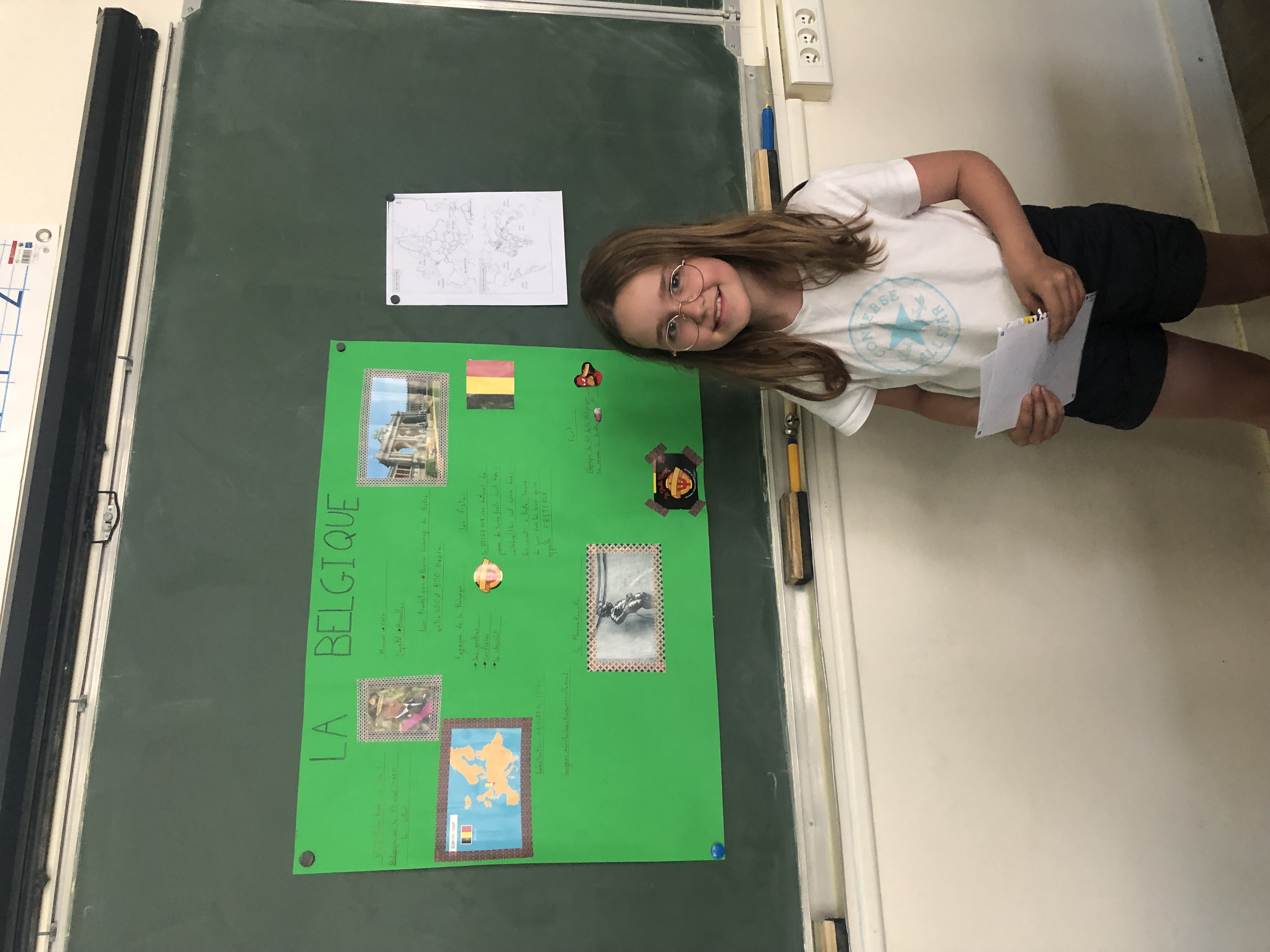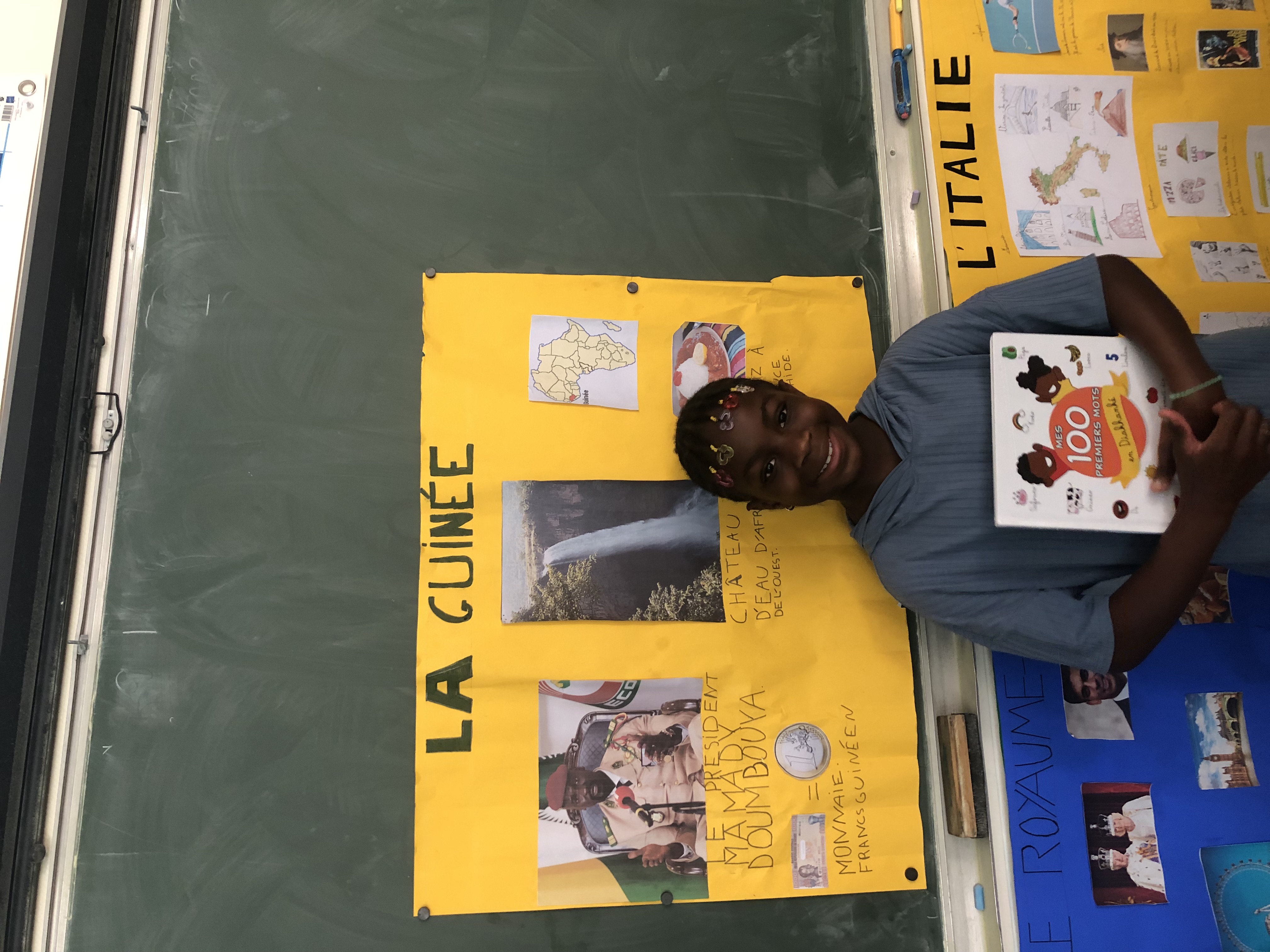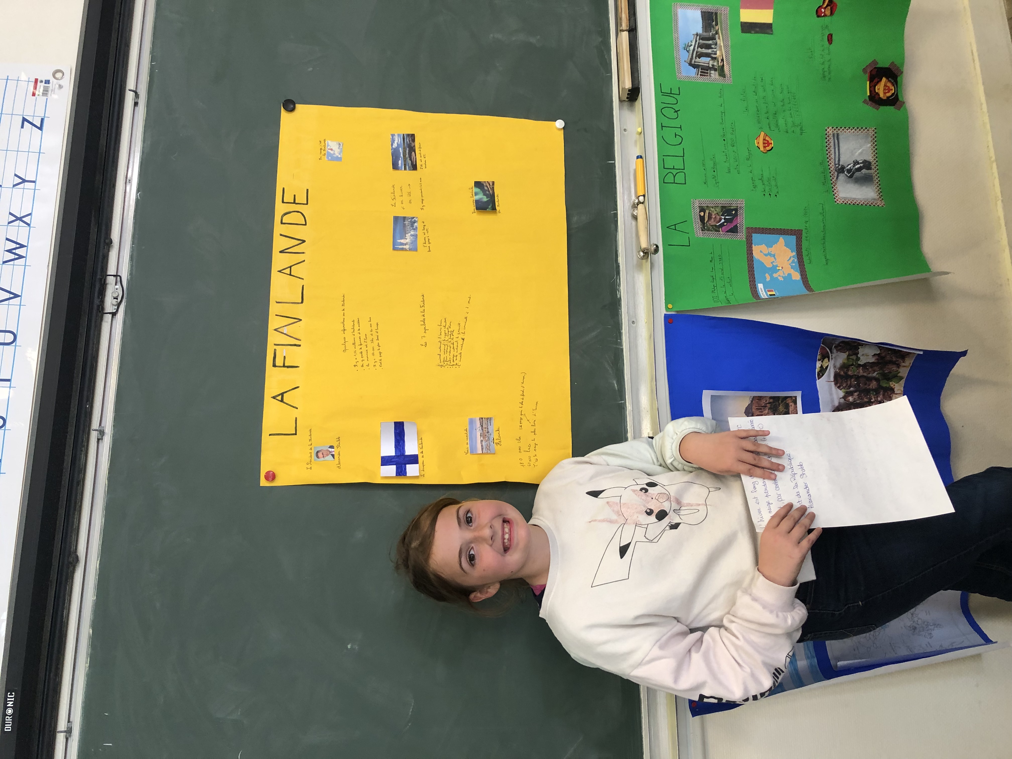 Ils ont fait des recherches (Bravo à tous les parents qui ont pleinement participé à ce projet!) sur le pays choisi: situation géographique, pays limitrophes, population, superficie, capitale, langue officielle, monnaie, gouvernement, hymne, drapeau, gastronomie, culture et histoire, quelques mots du quotidien… Ils ont imprimé, écrit et dessiné, se sont entrainés à présenter et ont concocté un quizz pour évaluer l’écoute de leurs camarades.