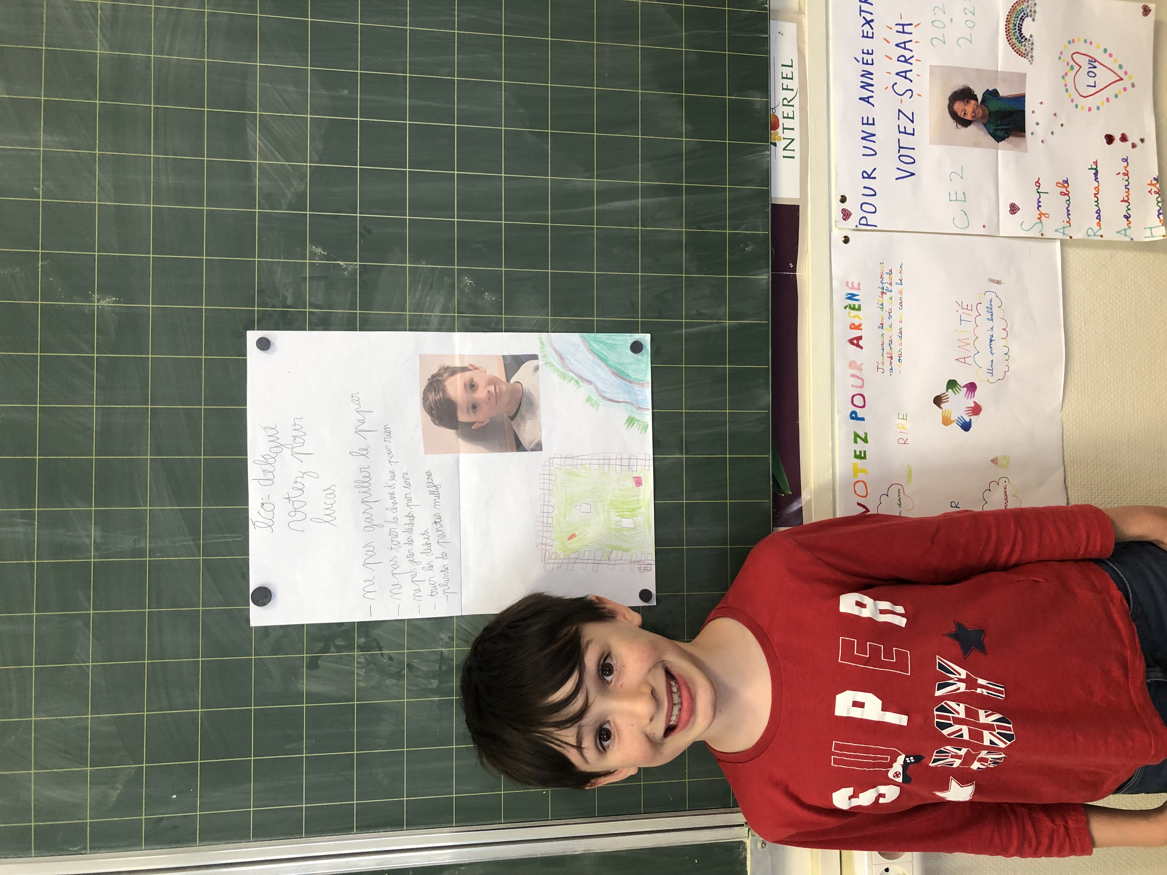 Les délégués de CE2 sont Arsène et Augustin. Les éco-délégués sont Salomé et Rafael.