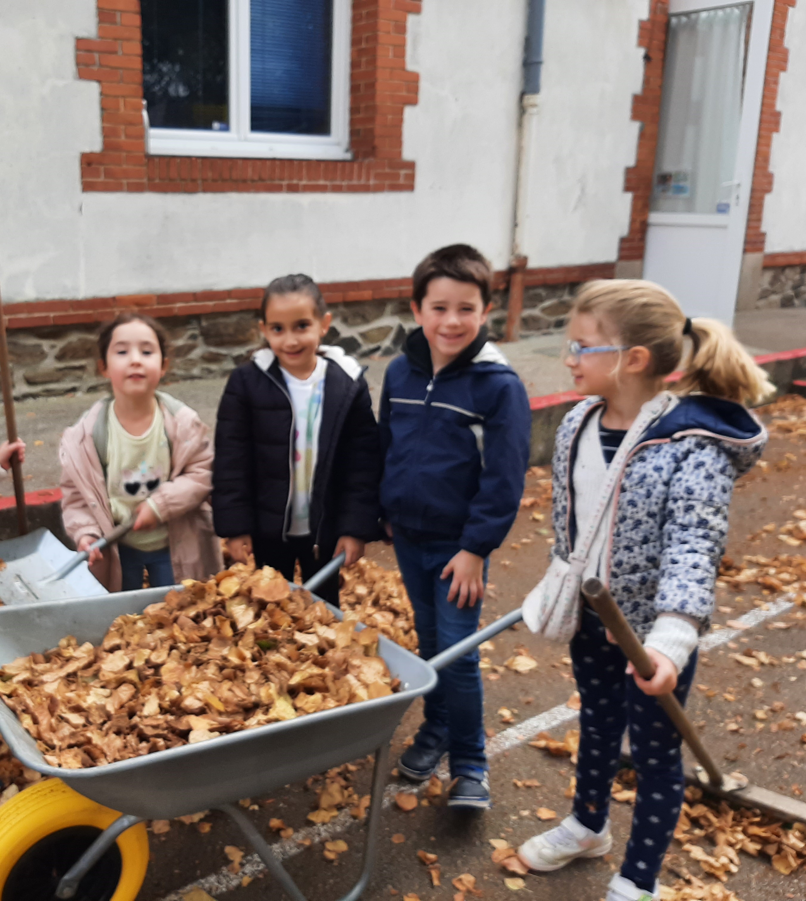 Sur la cour, ramassage des feuilles par les élèves volontaires qui se relaient, petits et plus grands. Une autre manière de se détendre.
