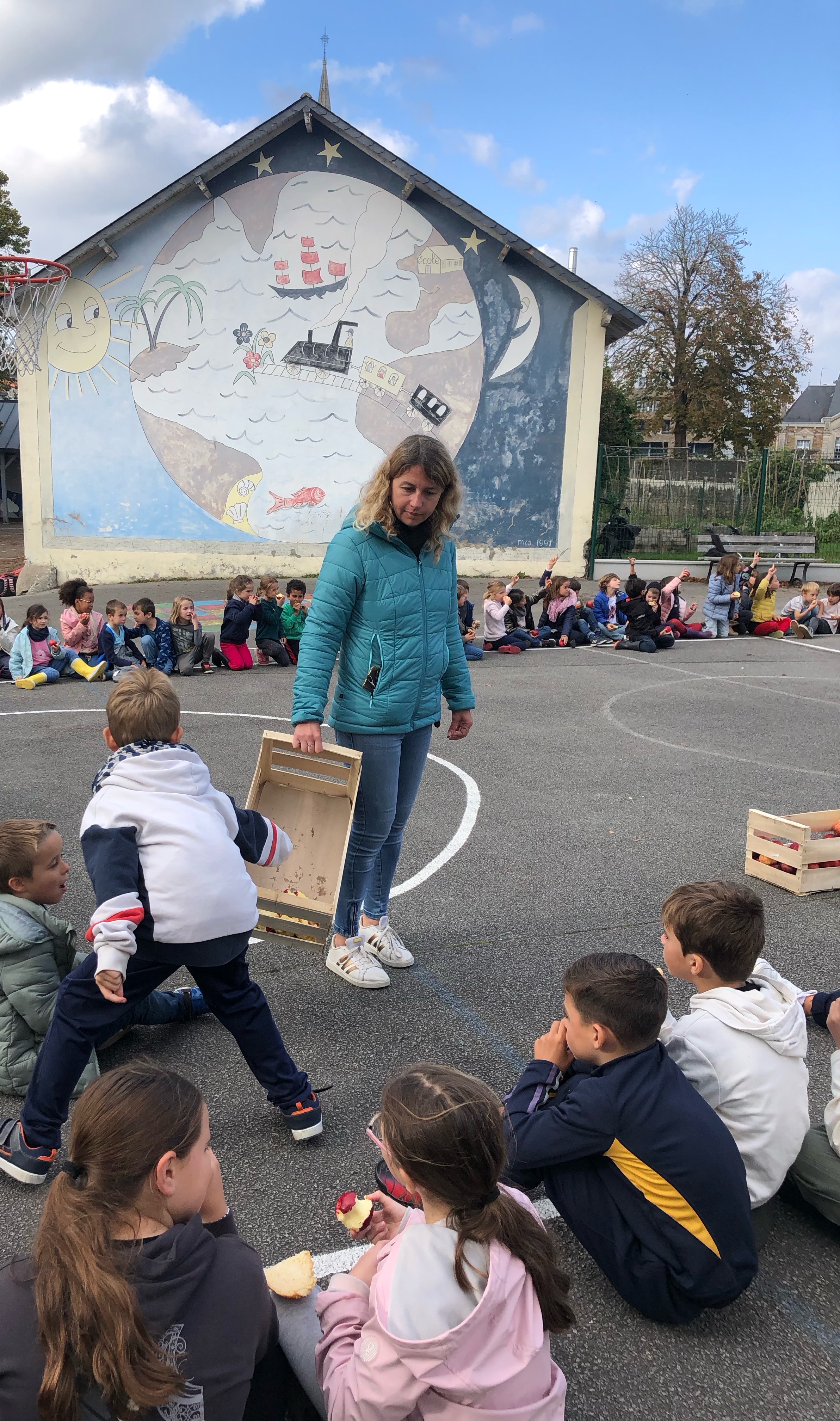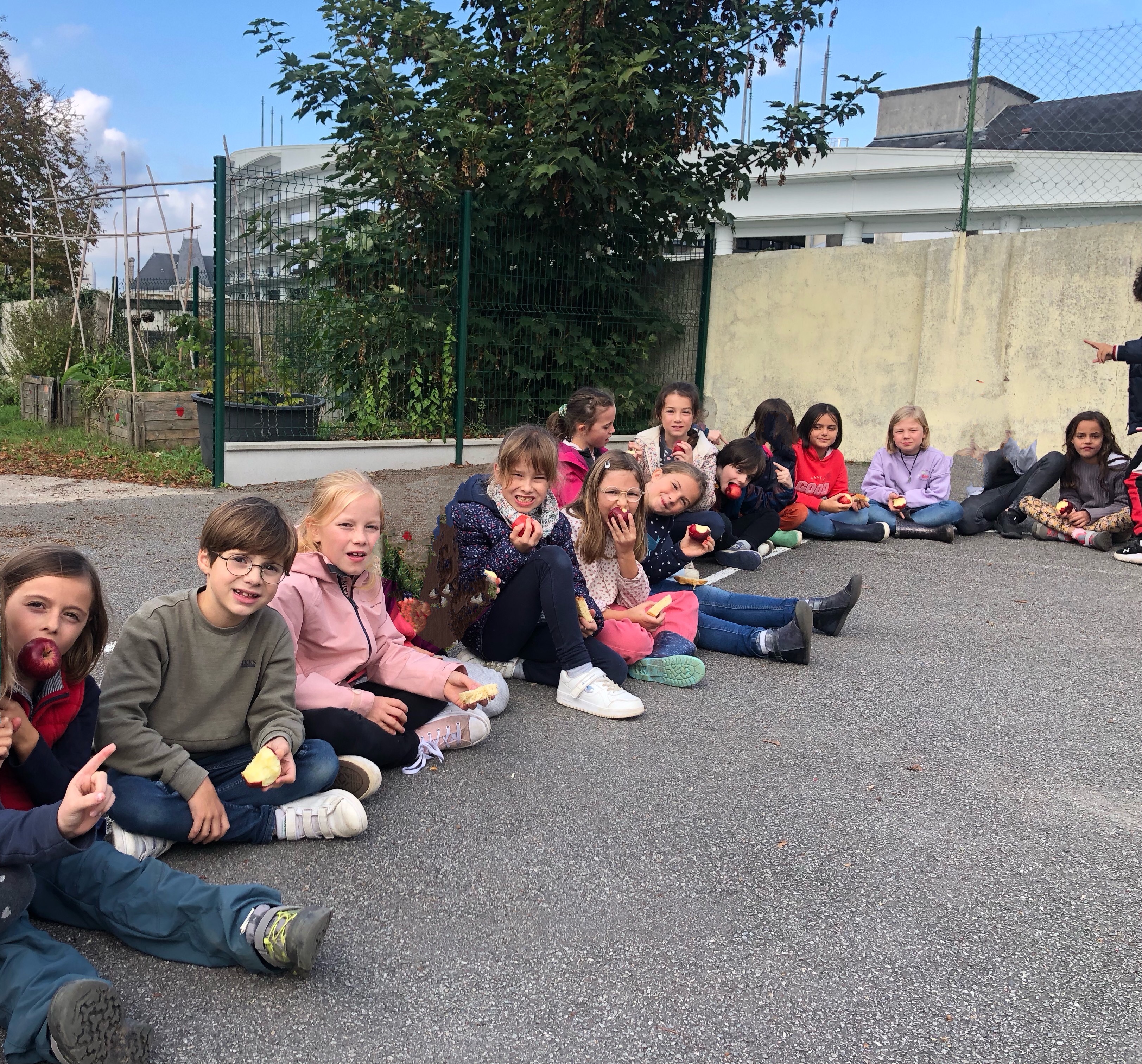 Après l’effort, le réconfort ! Les enfants se sont réunis autour de la brioche et d’une pomme fournies par les magasins Leclerc. Un joyeux “World clean up day” pour toutes les classes de l’école !