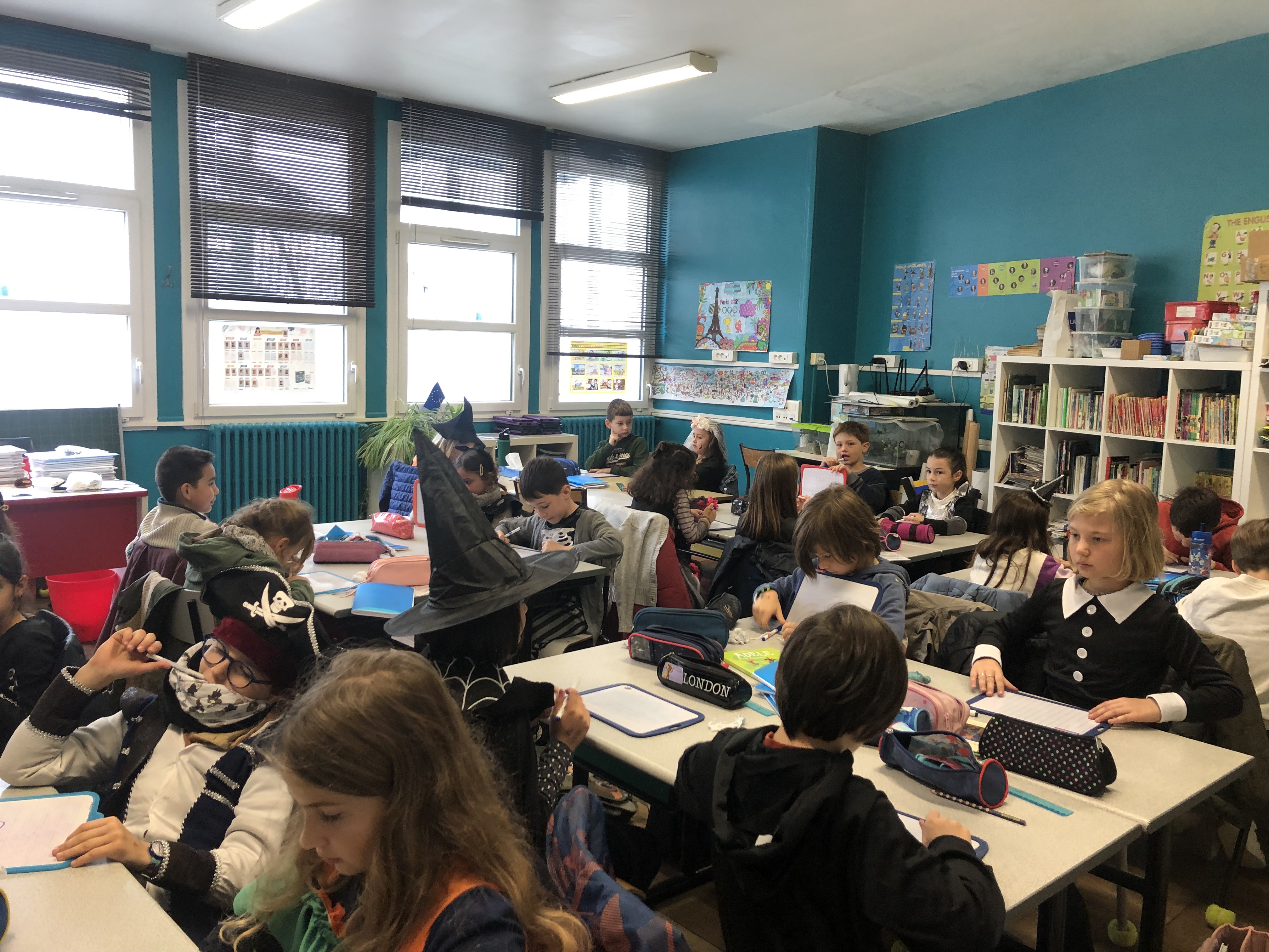 Pour notre retour à l’école, après les vacances de la Toussaint, la maitresse nous a demandé de venir déguisés! Au programme, réaliser une photo pour nos correspondants eTwinning, avec lesquels nous réfléchissons sur les émotions. Nous avons aussi eu droit à une petite surprise: réaliser un escape game sur le thème d’Halloween dans la classe. Il fallait savoir coopérer pour trouver les solutions aux énigmes. On a adoré!