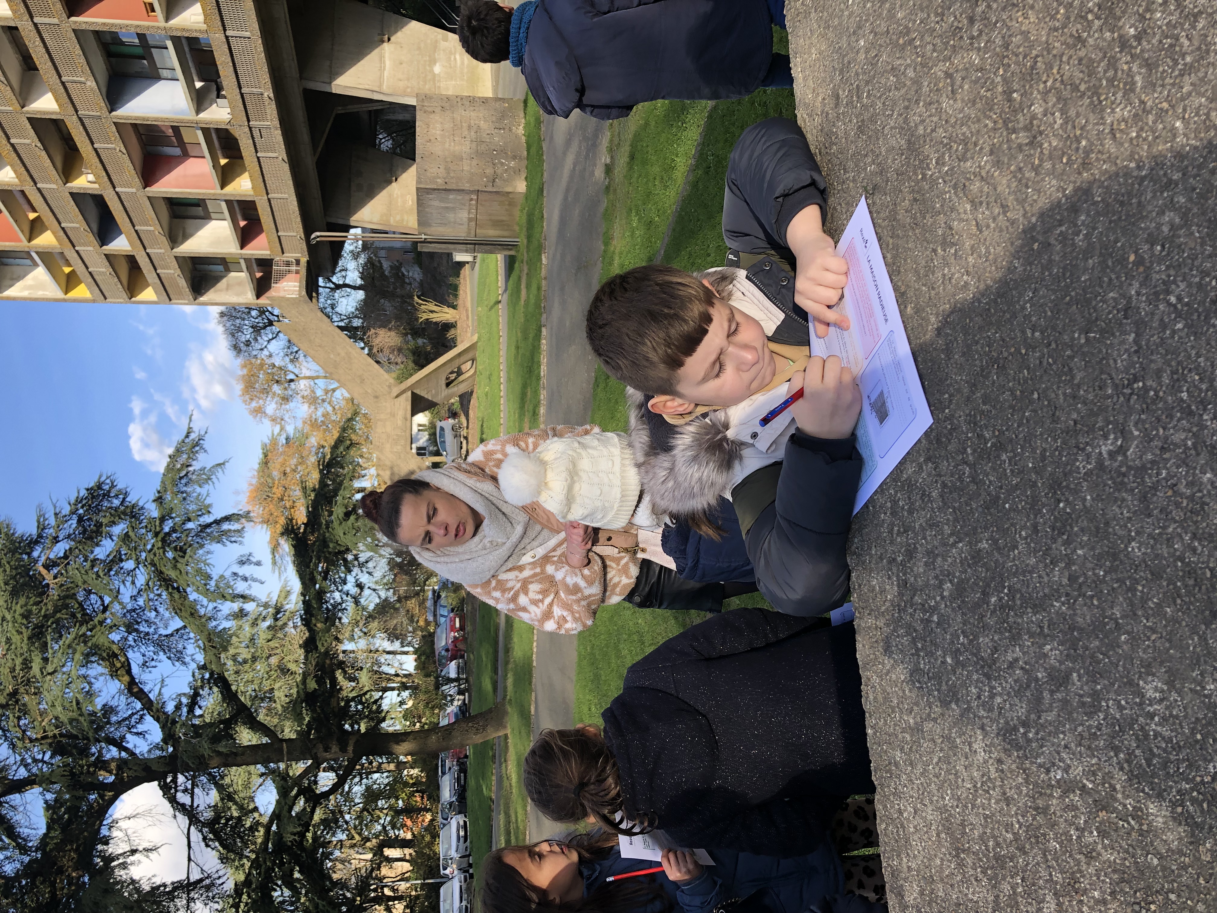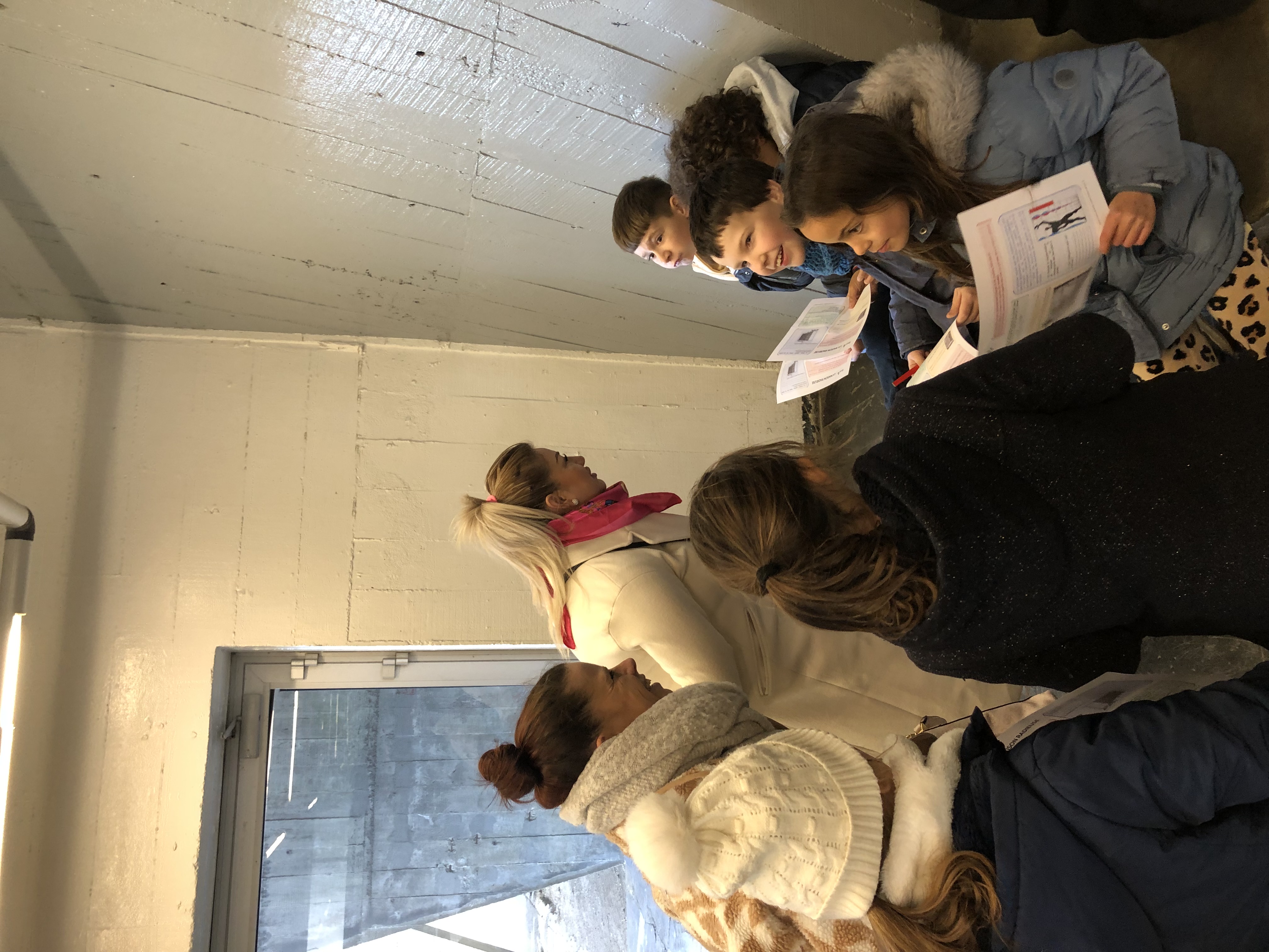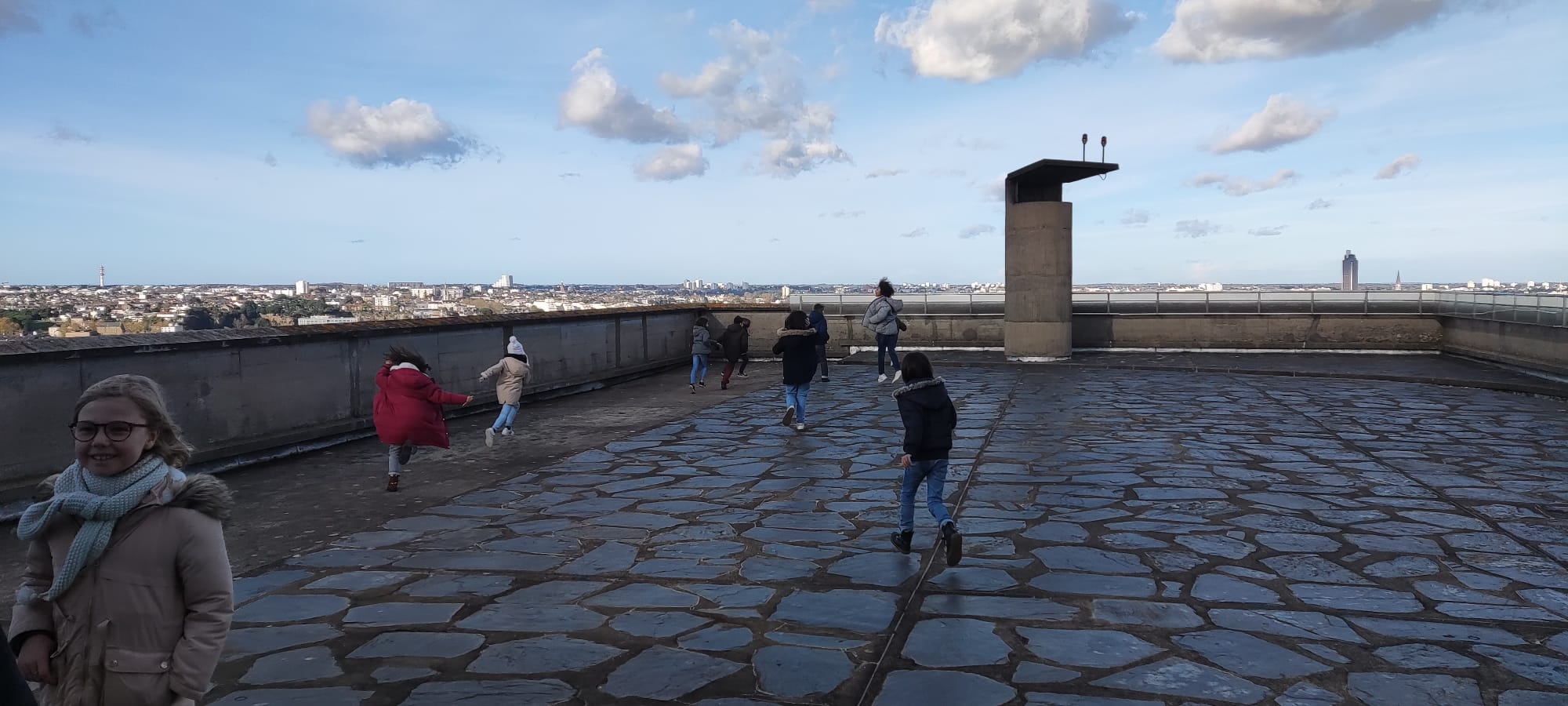 Pendant qu’un groupe menait l’enquête à l’extérieur avec des énigmes à élucider, l’autre allait découvrir le toit-terrasse (avec une vue imprenable sur Rezé, les alentours et…sur la cour de l’école!), la 6ème rue et l’appartement-témoin. Marie nous a appris beaucoup d’anecdotes sur ce grand immeuble. C’était très intéressant!.. Certains ont même pu voir leur maison!