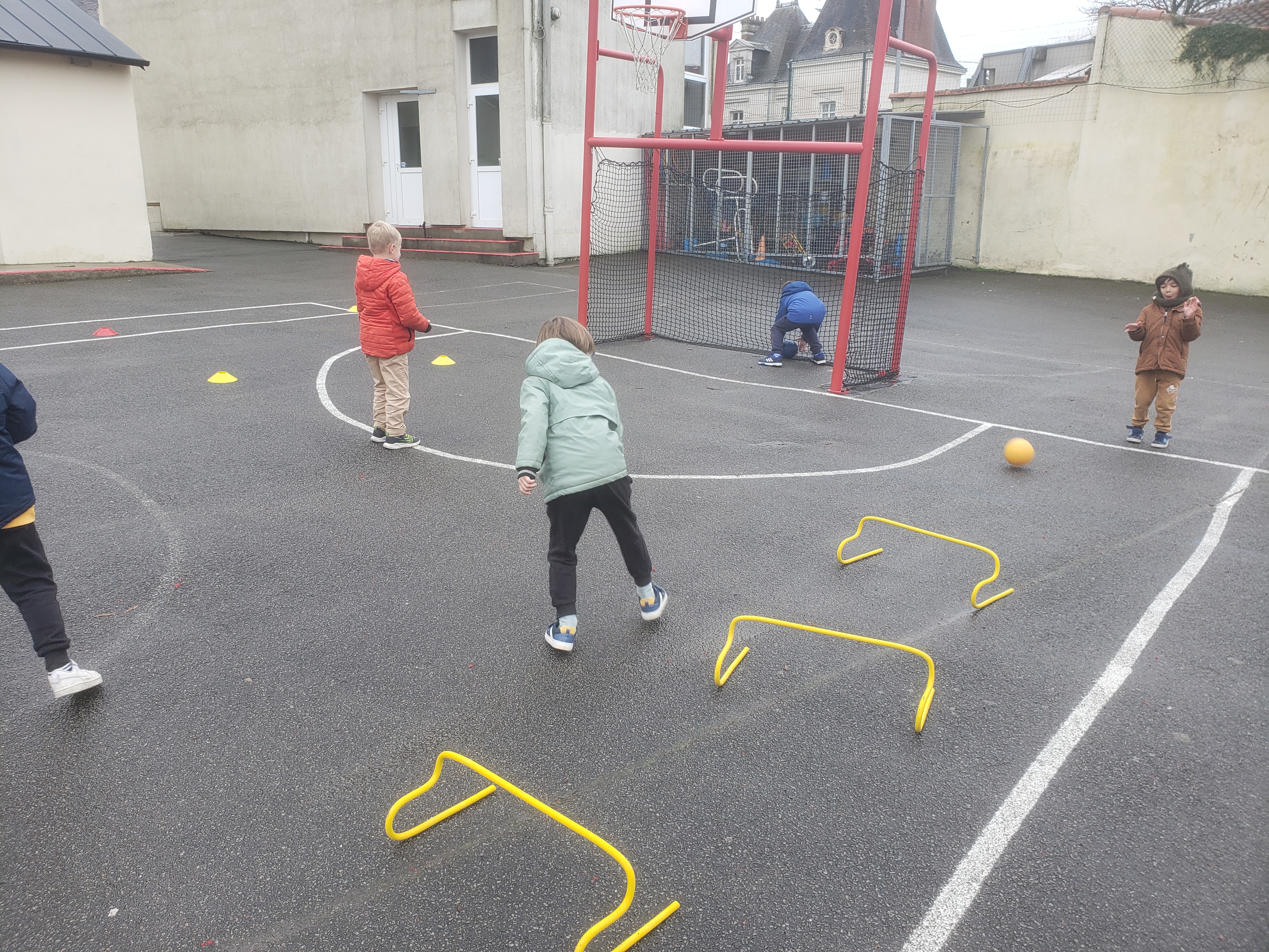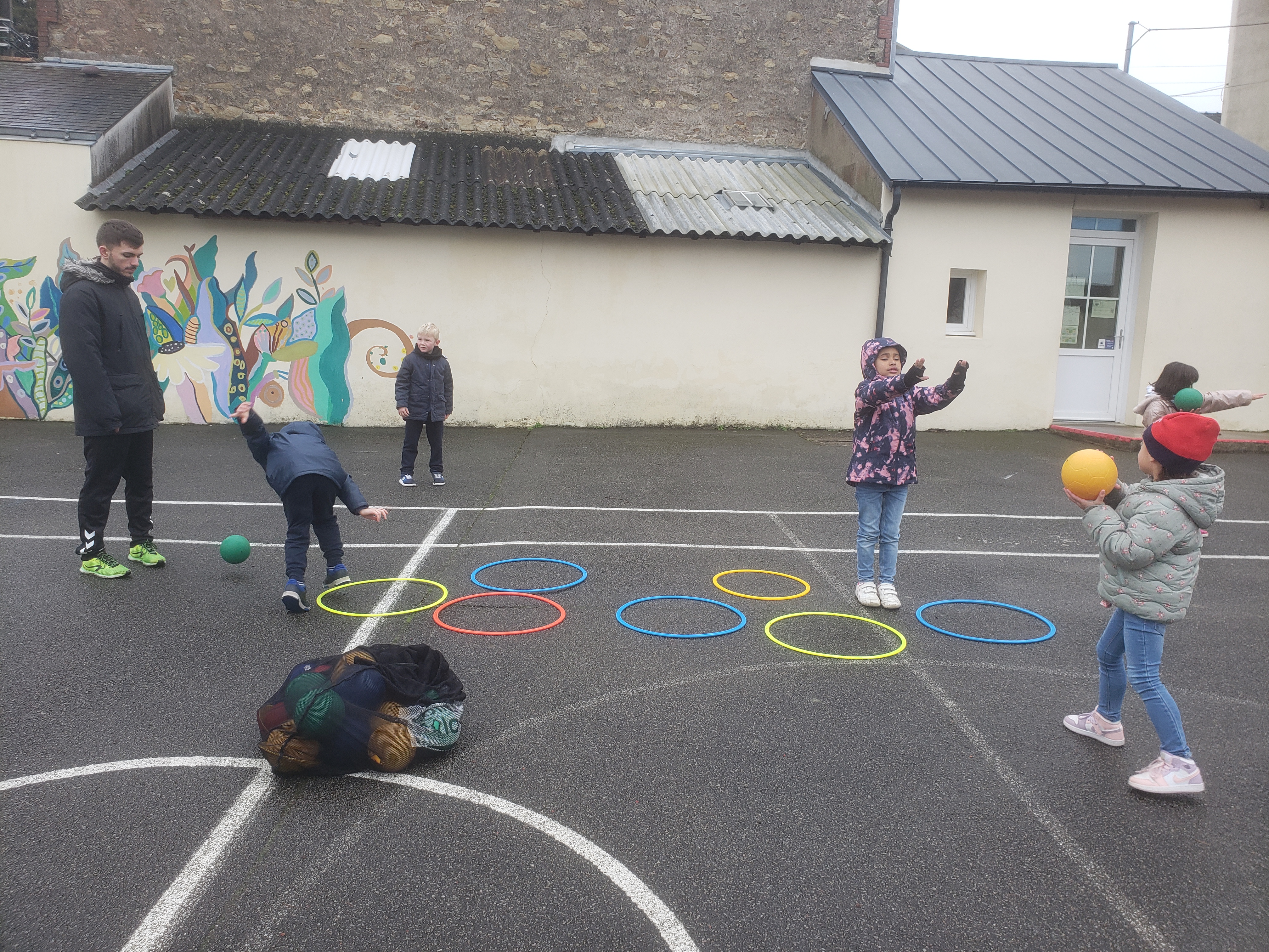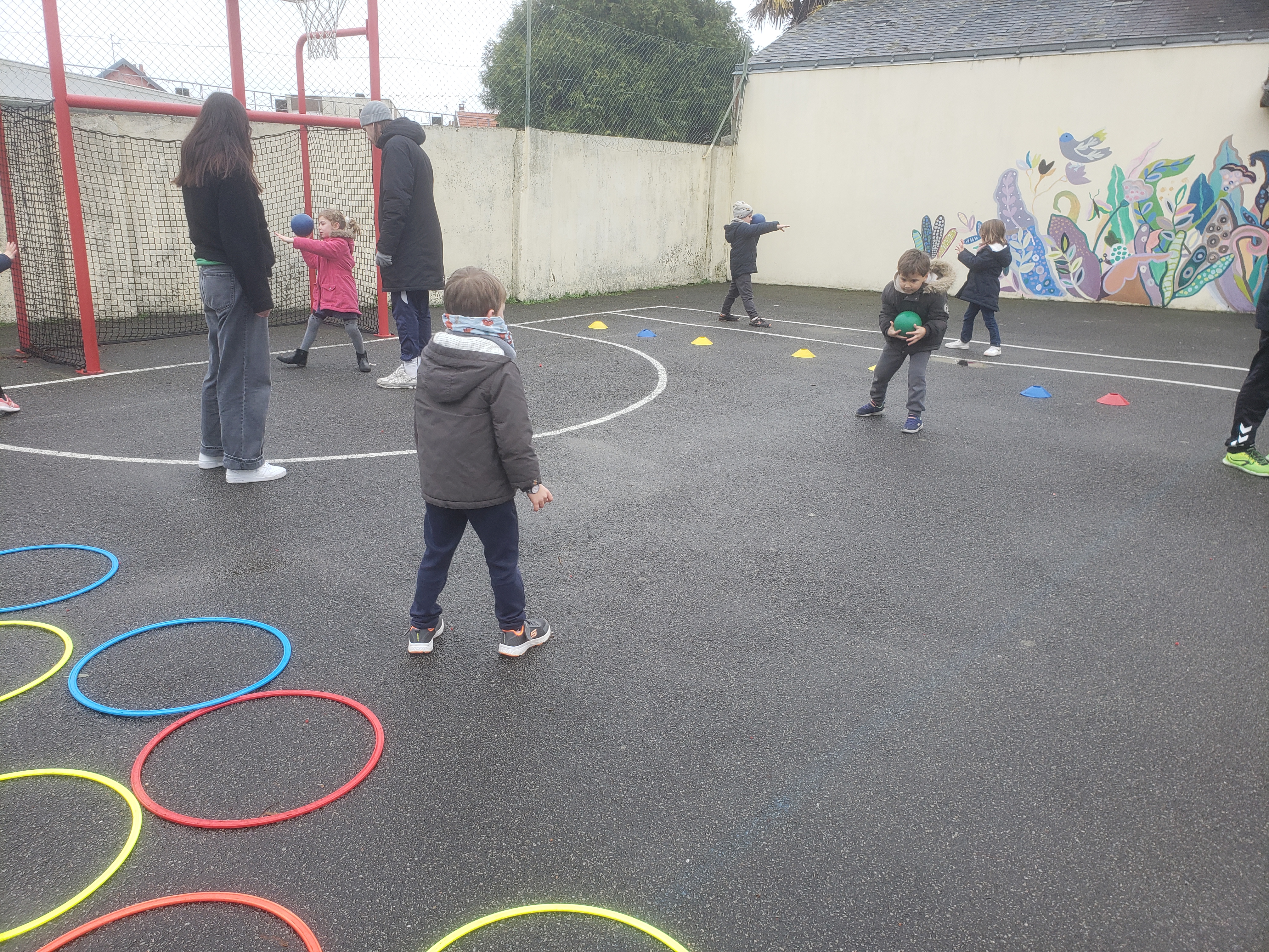 Les élèves de GS/CP vont découvrir le handball jusqu’aux vacances de printemps grâce aux entraineurs de l’ASB Rezé handball. Pour cette première séance ils ont appris à lancer le ballon avec le bras cassé et le bras viseur.