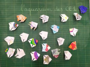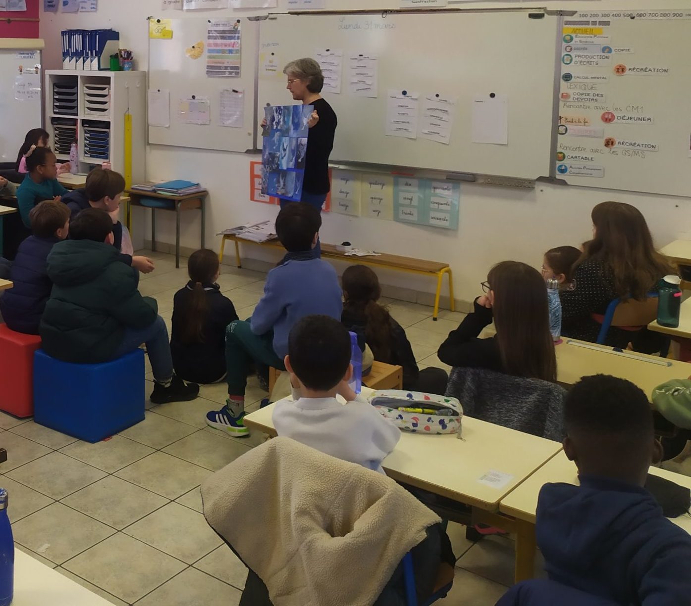les CM1 ont présenté aux CE1 leurs oeuvres “Nuages à la manière de Magritte”. Les enfants ont beaucoup aimé ces dessins très poétiques.