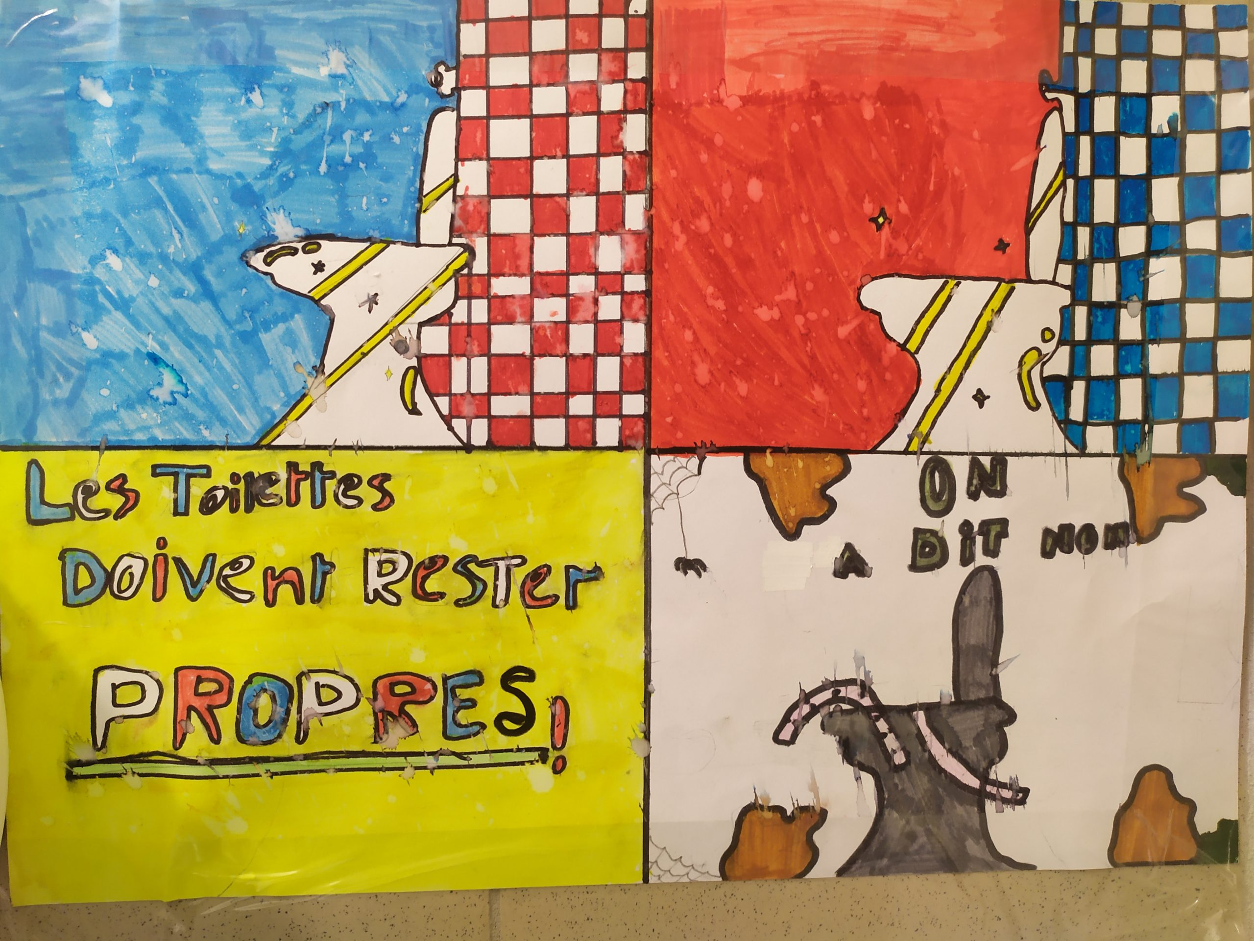 Mission “super toilettes” avec les déléguésPar Caroline / 18 mai 2025 Les délégués ont proposé une mission “super toilettes” aux élèves de l’école. Christian, nous a bien aidé avec les couleurs sur les portes et chaque classe a eu la mission d’une affiche de sensibilisation. C’est tellement plus agréable!