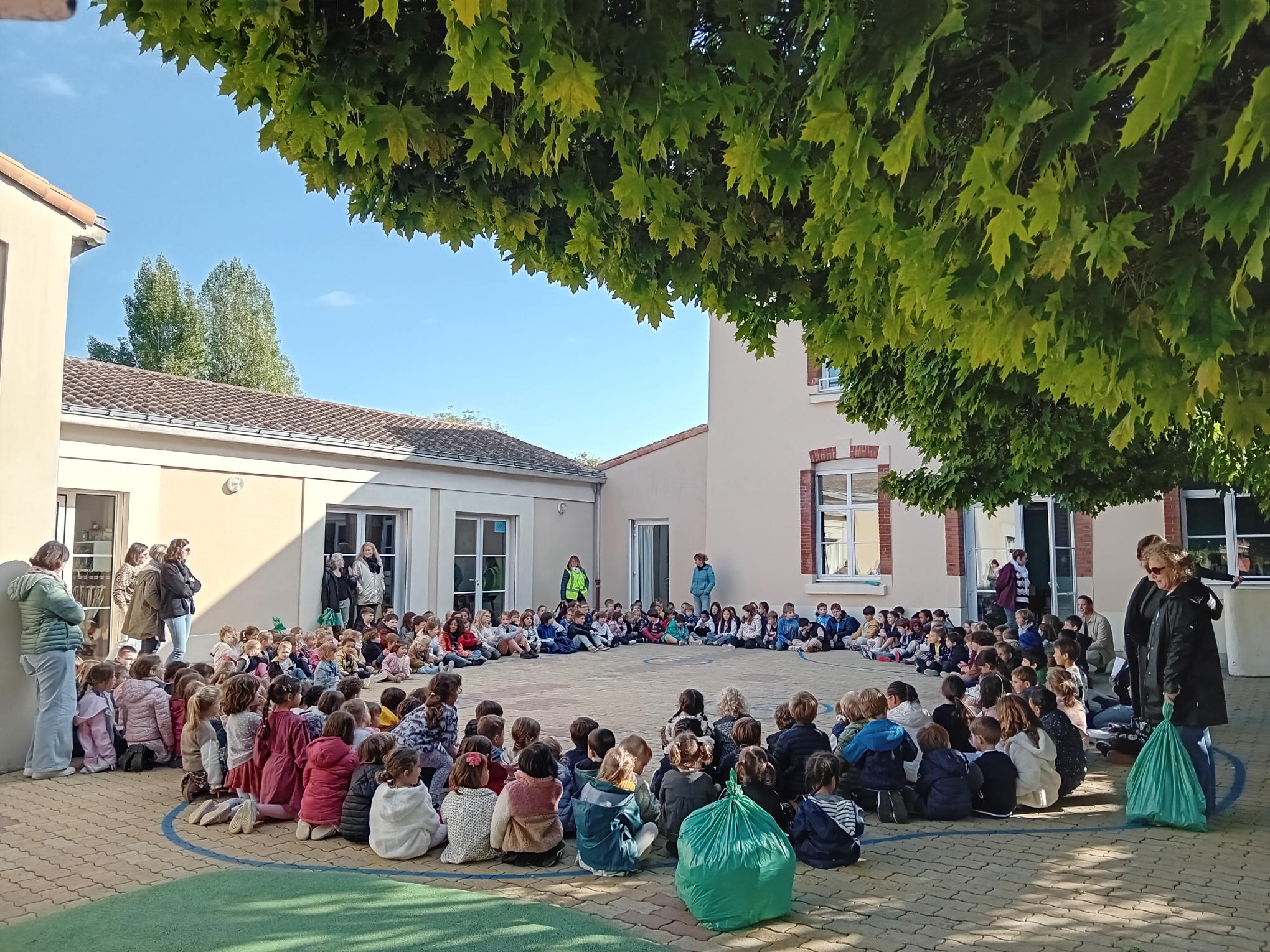 Lundi 29 septembre, tous les enfants de l’école se sont rassemblés dans la cour des maternelles pour se rencontrer, pour saluer les nouveaux, pour se souhaiter une bonne année, pour parler des projets, pour chanter le nouvel hymne et pour faire le bilan de l’action Nettoyons la nature.