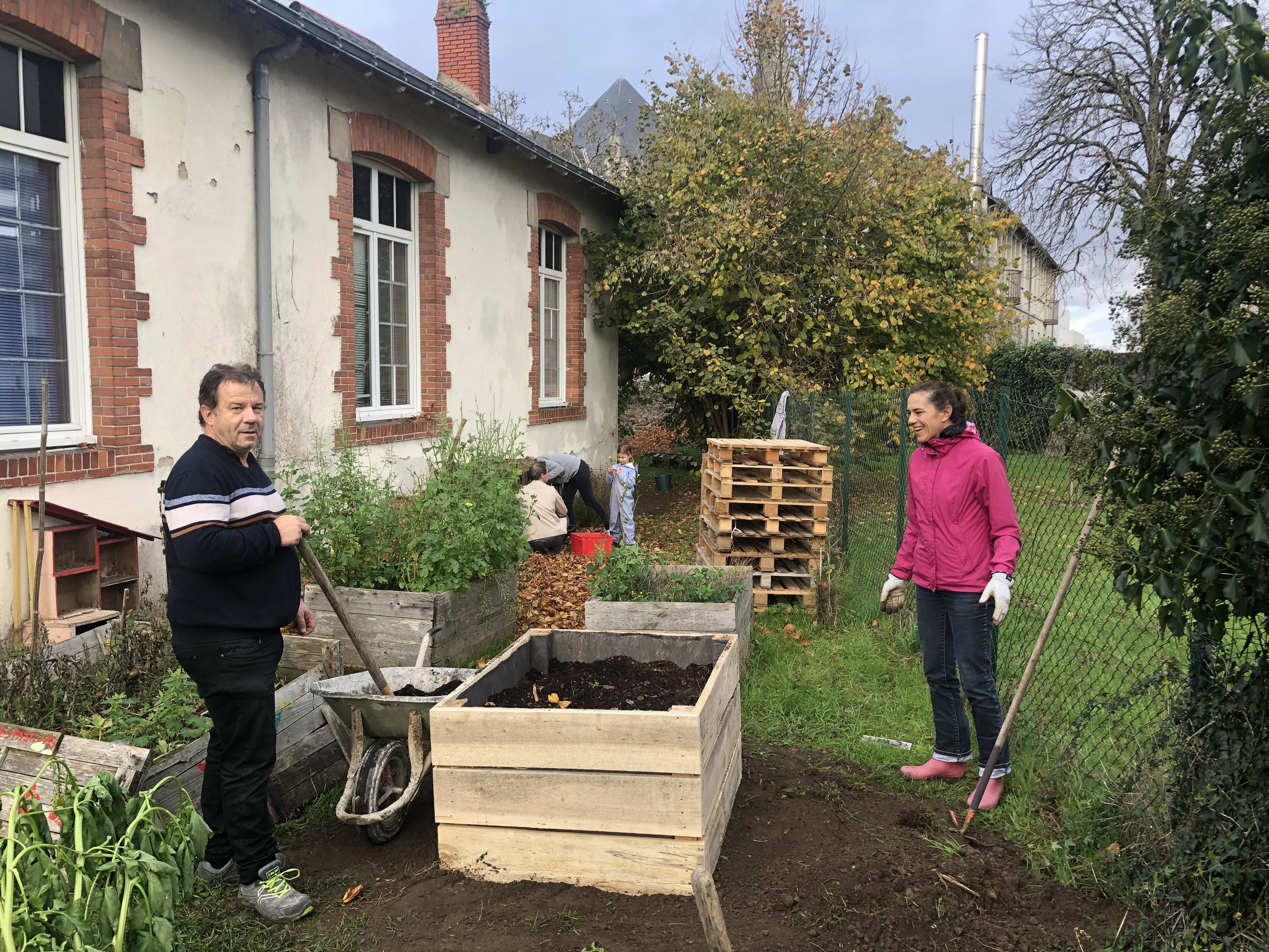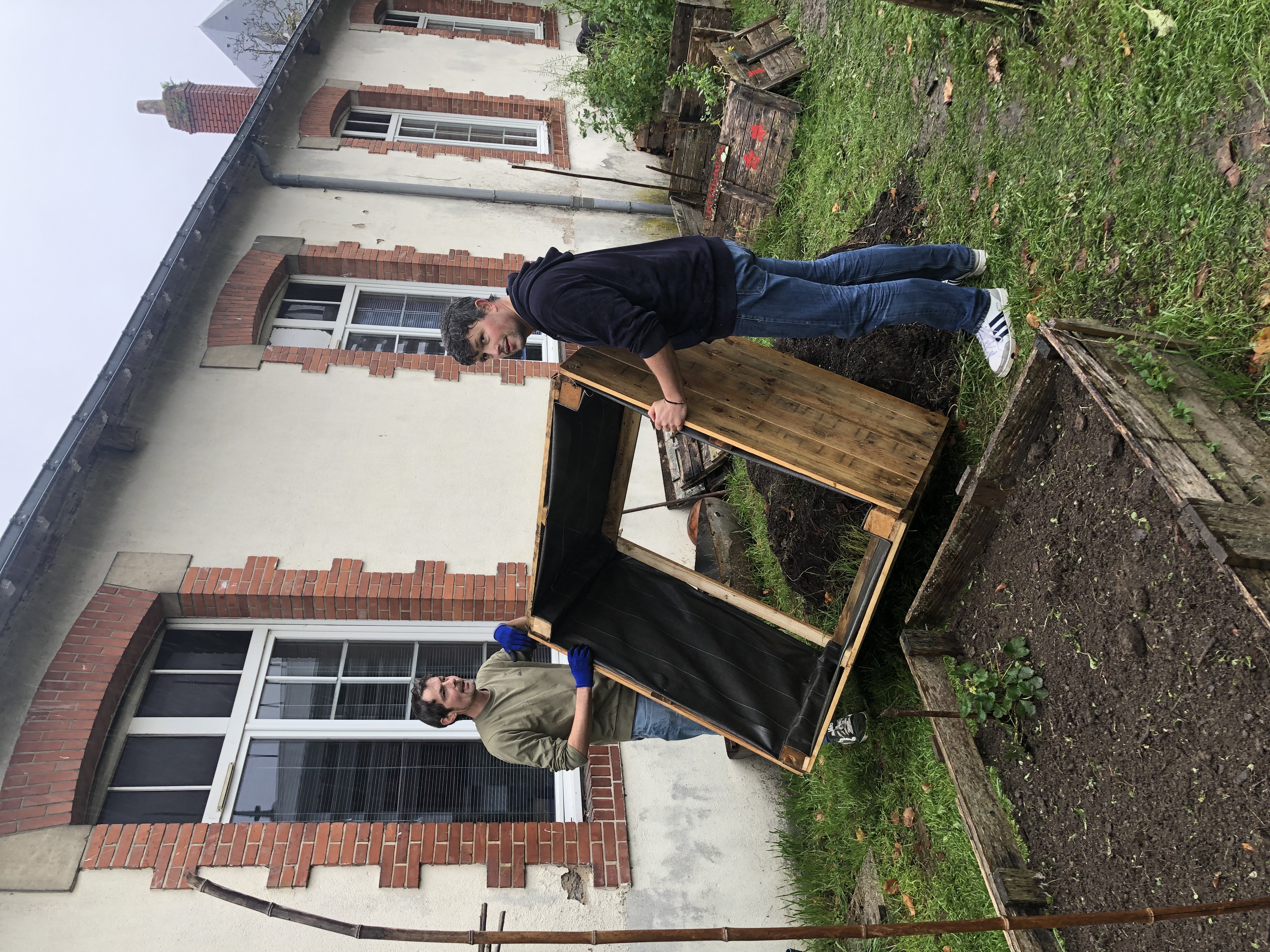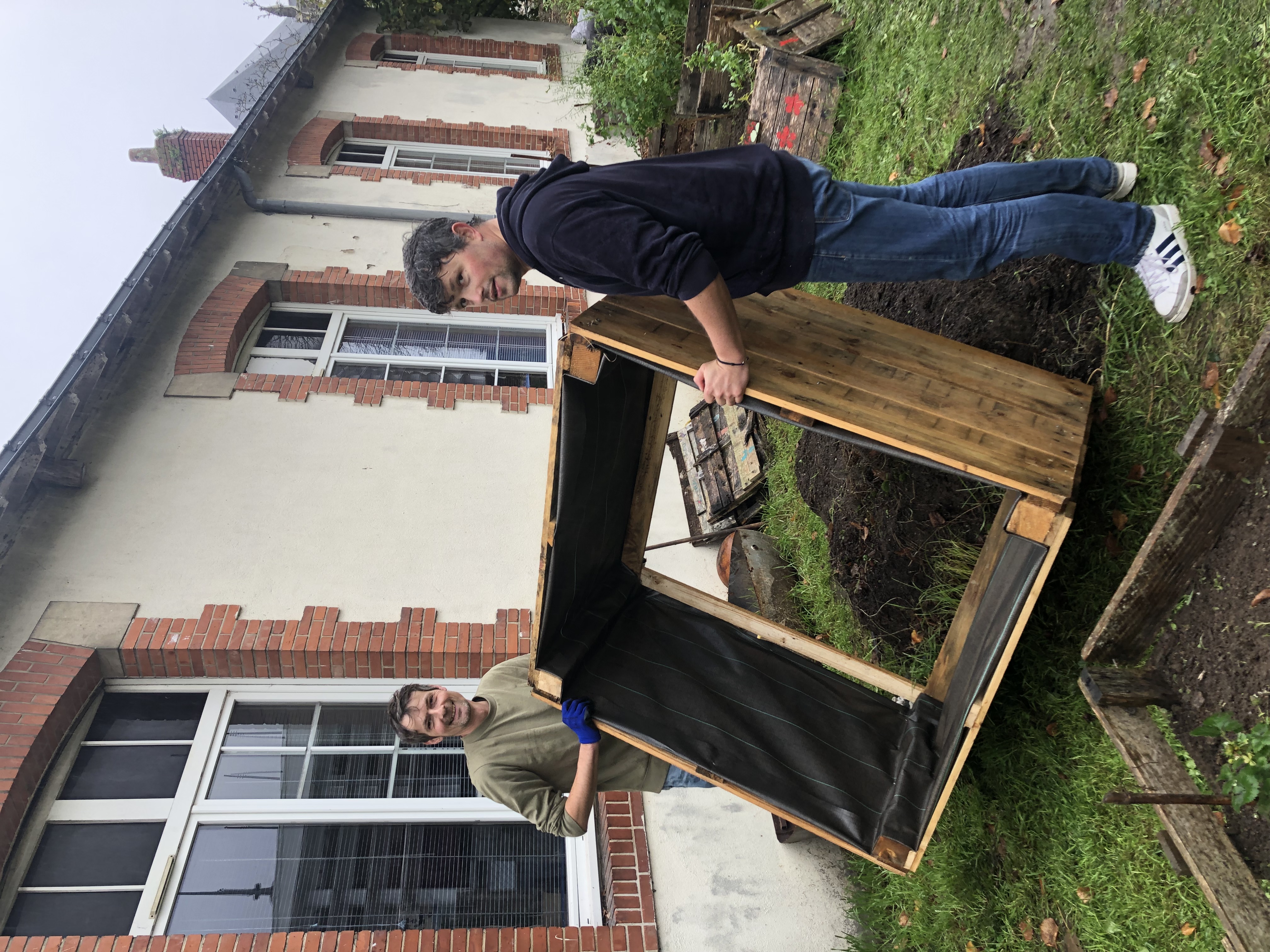 Avec le sourire, tout le monde a contribué à réussir les missions qui étaient à l’ordre du jour: construction de nouveaux bacs avec de la récup de palettes (Merci Julien pour le matériel!)(Merci Nicolas B, Martin et Jean-François pour cette épreuve de construction!)(Merci Didier pour le bac construit à la maison!), désherbage minutieux (Merci Sophie!) et installation du 1er bac (Merci Vincent et Sophie!), aération et rééquilibrage du compost de A à Z (Merci Aurélie et Christophe!), préparation de la prochaine matinée potager (Merci à Nicolas F pour les plaques de carbone!)(Merci Alexander pour ce travail minutieux!)… Même les enfants ont prêté main-forte en récupérant le BRF décomposé de la classe extérieure: Merci les enfants!