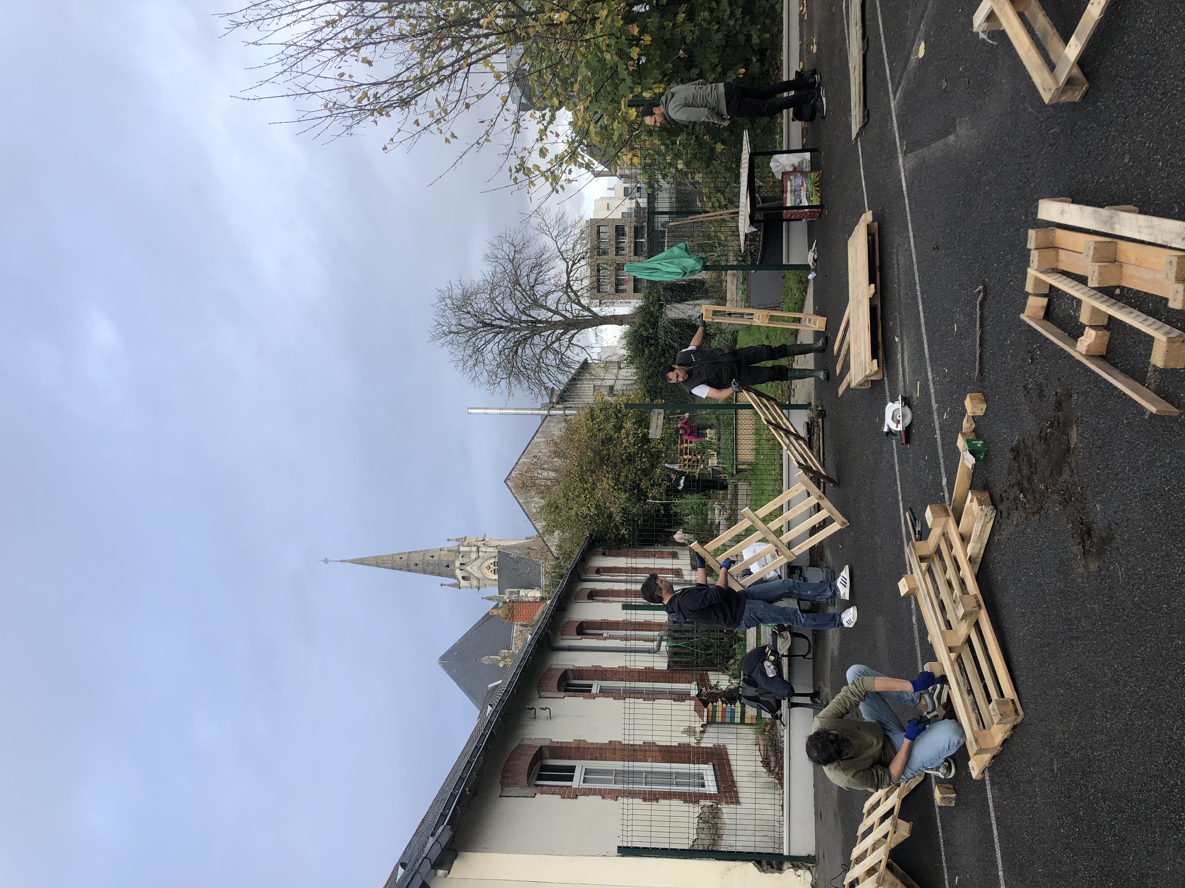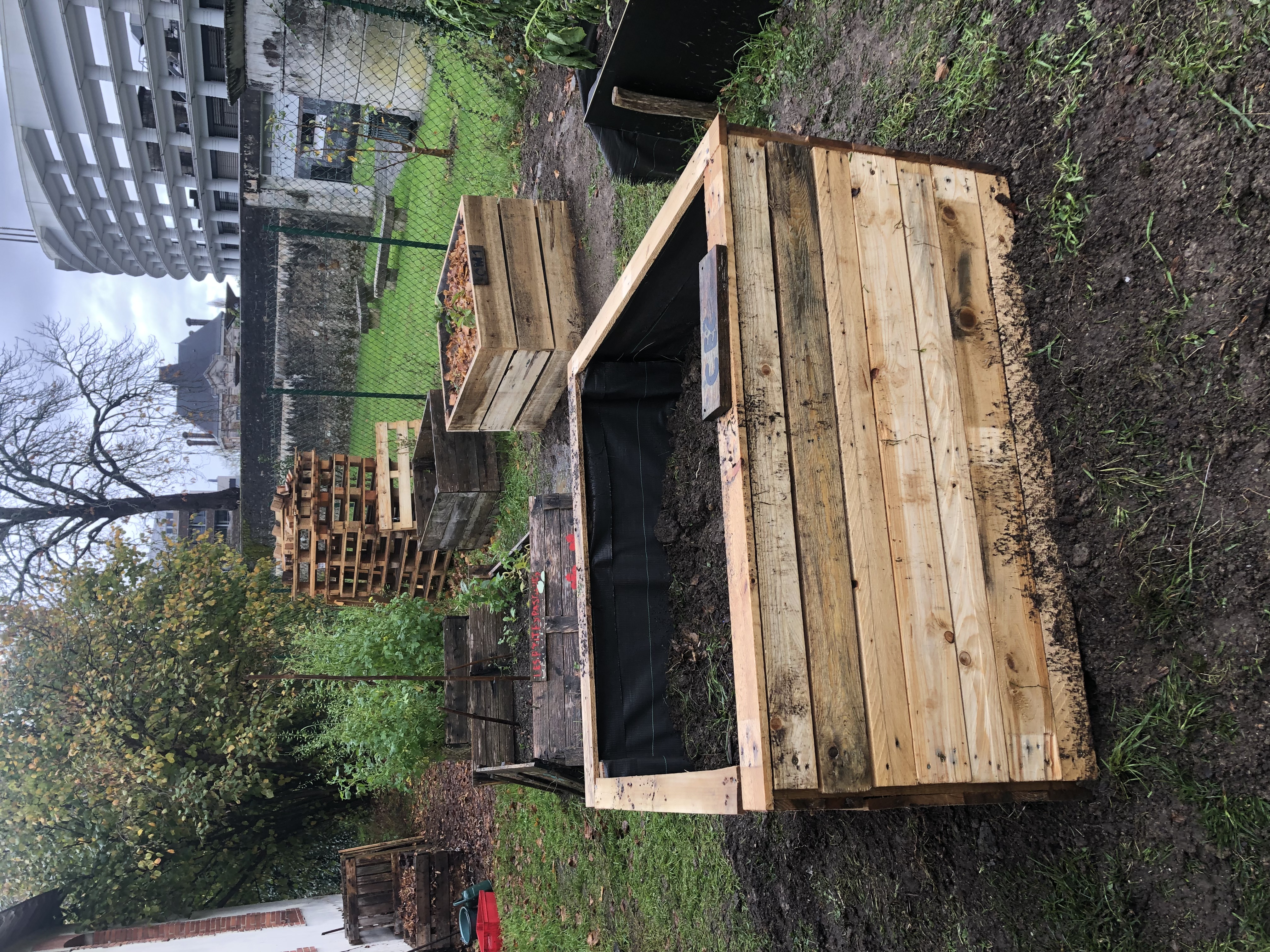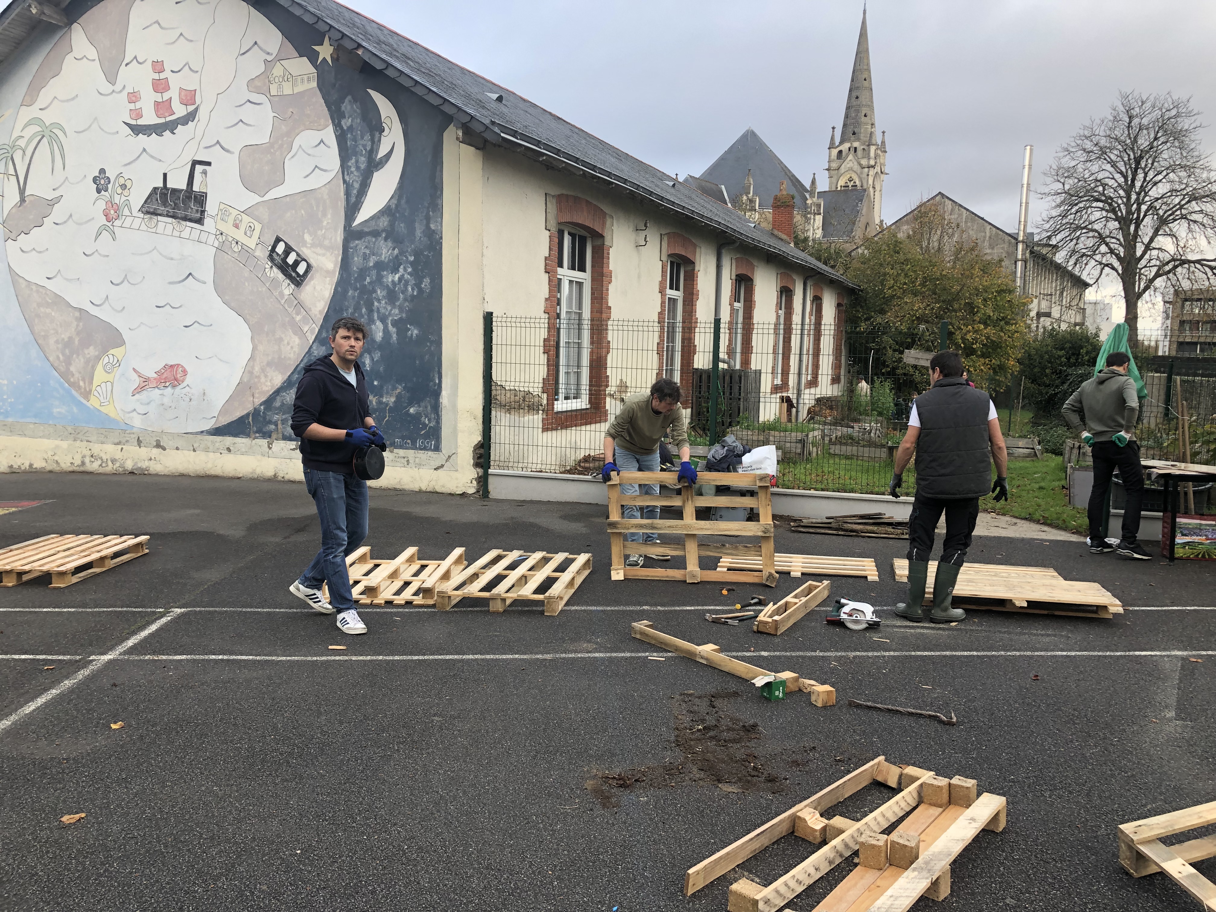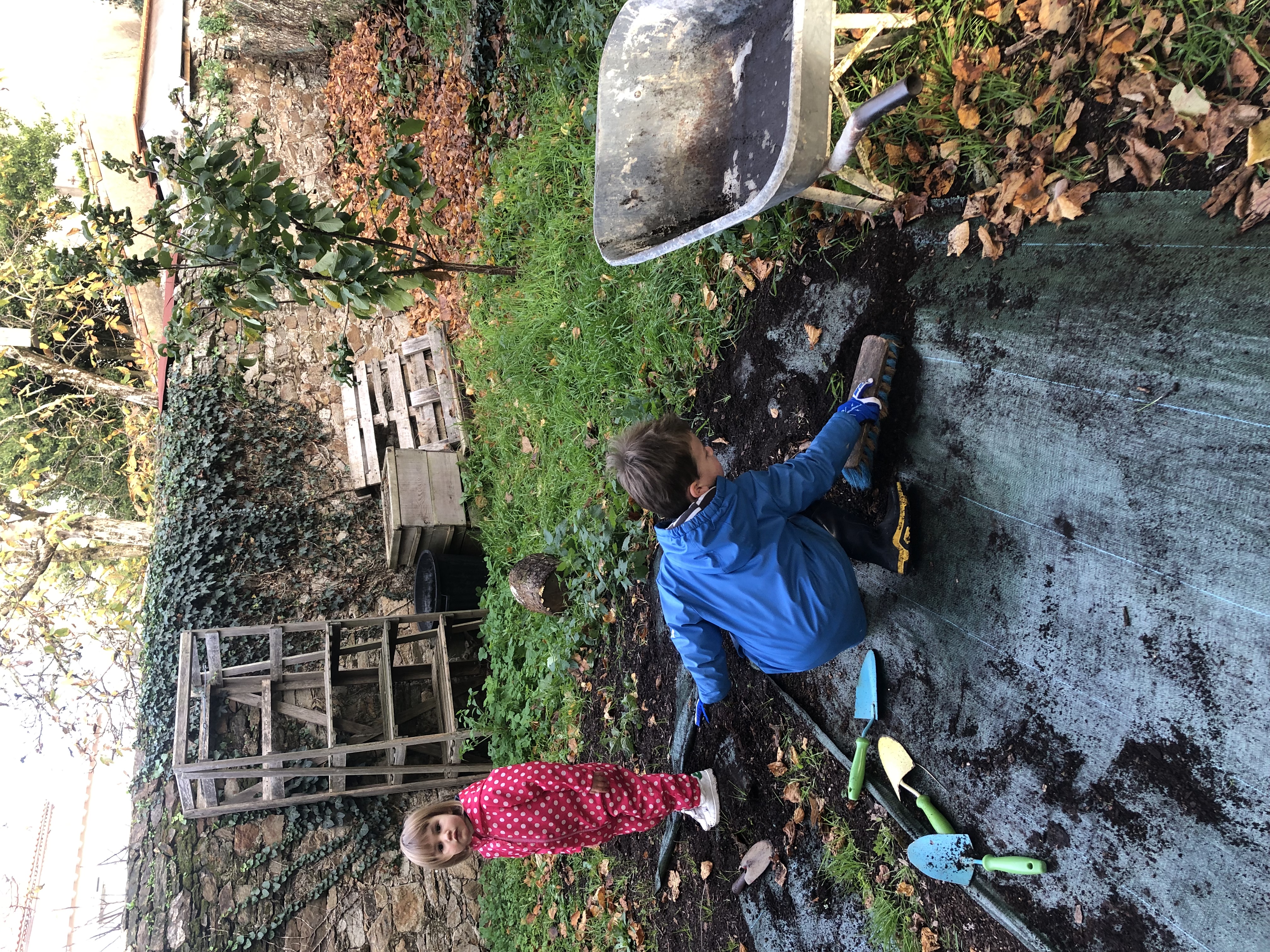 Avec le sourire, tout le monde a contribué à réussir les missions qui étaient à l’ordre du jour: construction de nouveaux bacs avec de la récup de palettes (Merci Julien pour le matériel!)(Merci Nicolas B, Martin et Jean-François pour cette épreuve de construction!)(Merci Didier pour le bac construit à la maison!), désherbage minutieux (Merci Sophie!) et installation du 1er bac (Merci Vincent et Sophie!), aération et rééquilibrage du compost de A à Z (Merci Aurélie et Christophe!), préparation de la prochaine matinée potager (Merci à Nicolas F pour les plaques de carbone!)(Merci Alexander pour ce travail minutieux!)… Même les enfants ont prêté main-forte en récupérant le BRF décomposé de la classe extérieure: Merci les enfants!