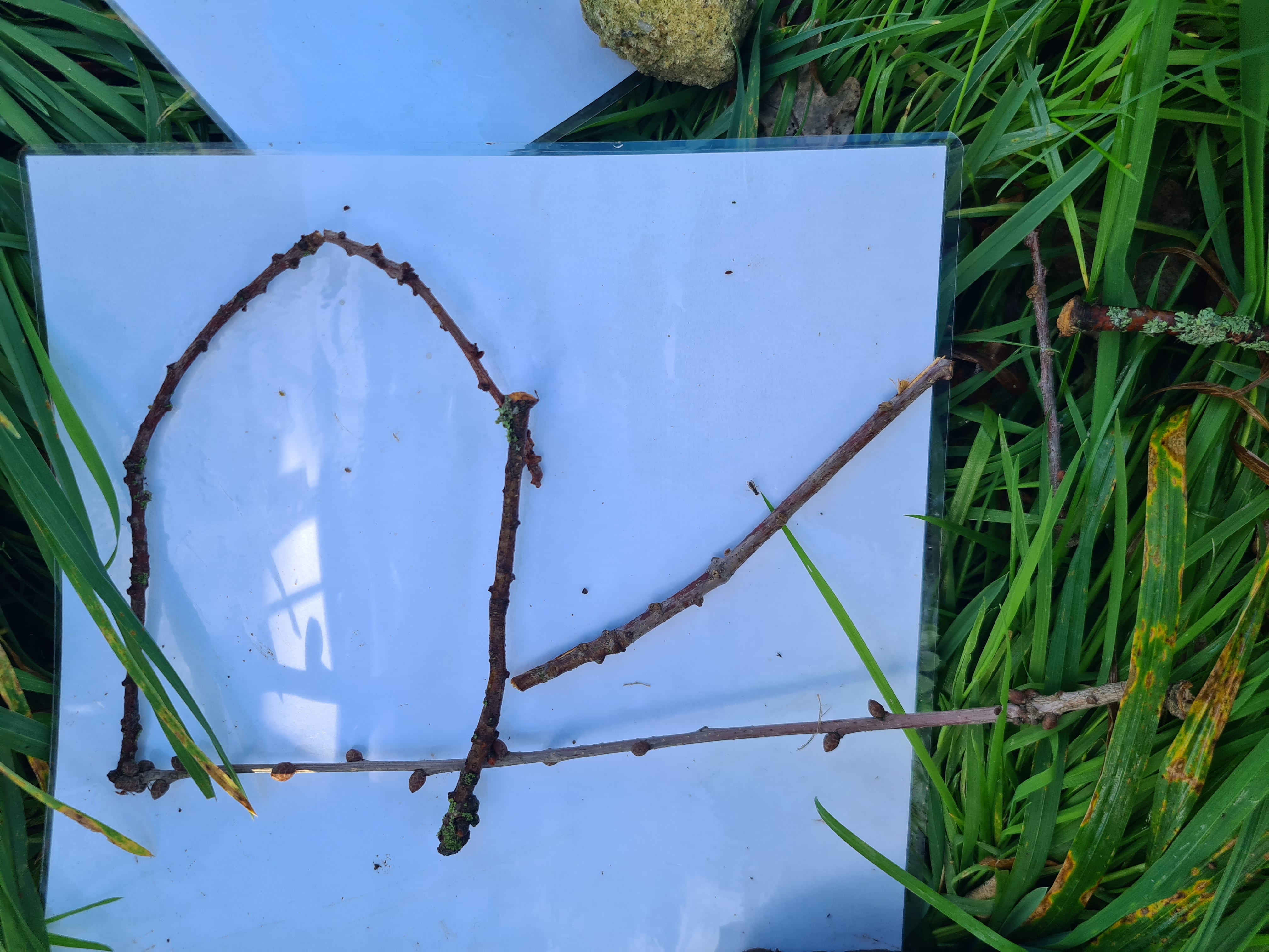 Les GS/CP sont allés en classe dehors pour continuer les apprentissages de la classe. Les GS ont réalisé un abécédaire, les CP ont représenté des nombres sous forme de dizaines (bâtons) et unités (feuilles).