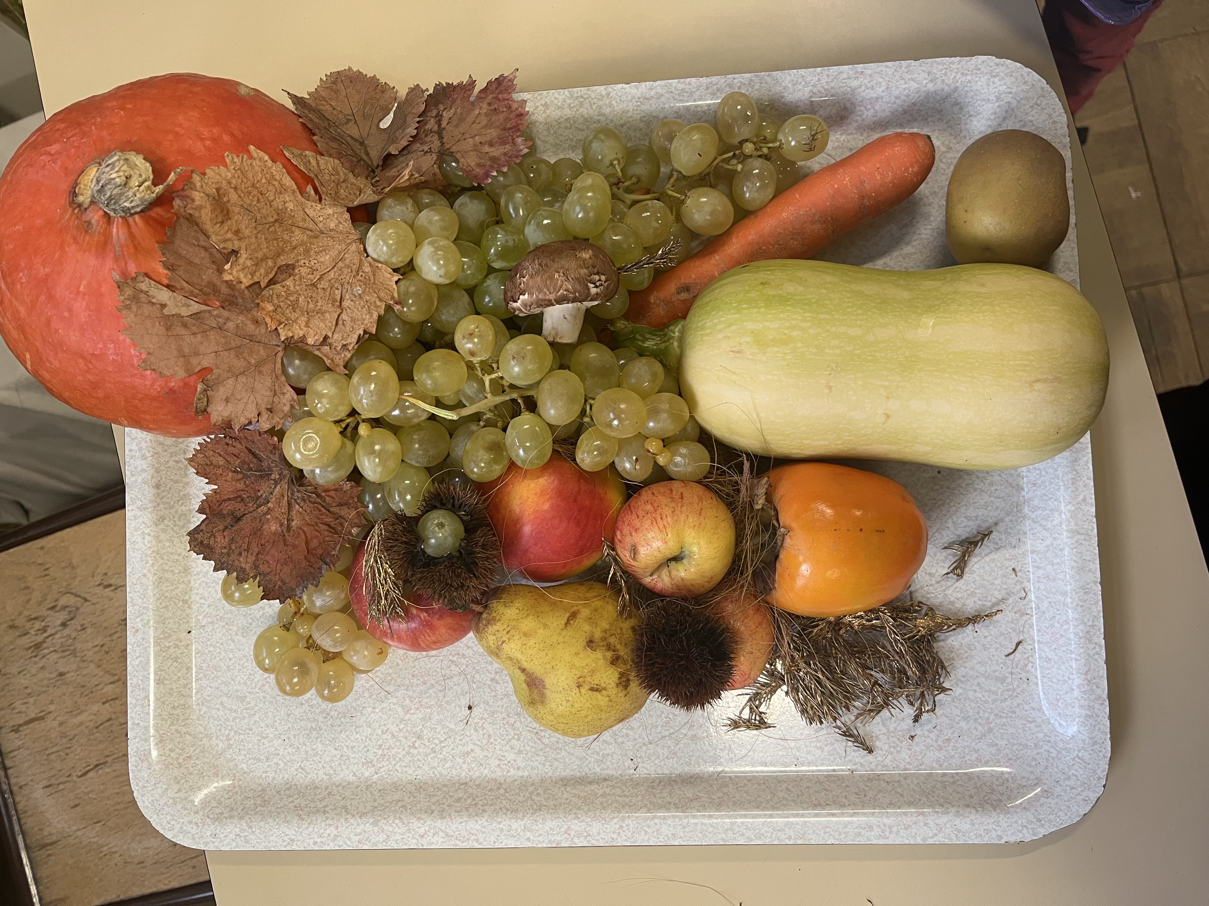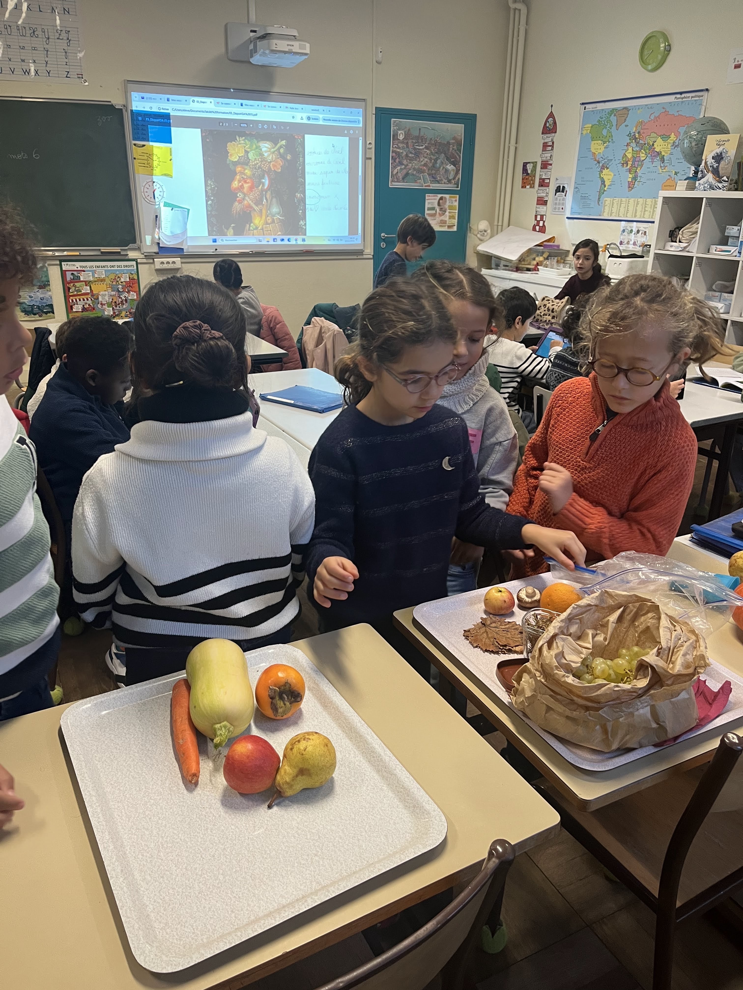 Dans le cadre des défis “Ma Petite Planète” et de l’étude de l’œuvre d’Arcimboldo en “Dictées et histoire des arts”, les CE2 ont essayé de reproduire le célèbre tableau “L’Automne” de cet artiste avec des fruits et légumes de saison. Potimarron, courge butternut, pommes, poires, kakis, châtaignes, champignons, raisin, carottes…