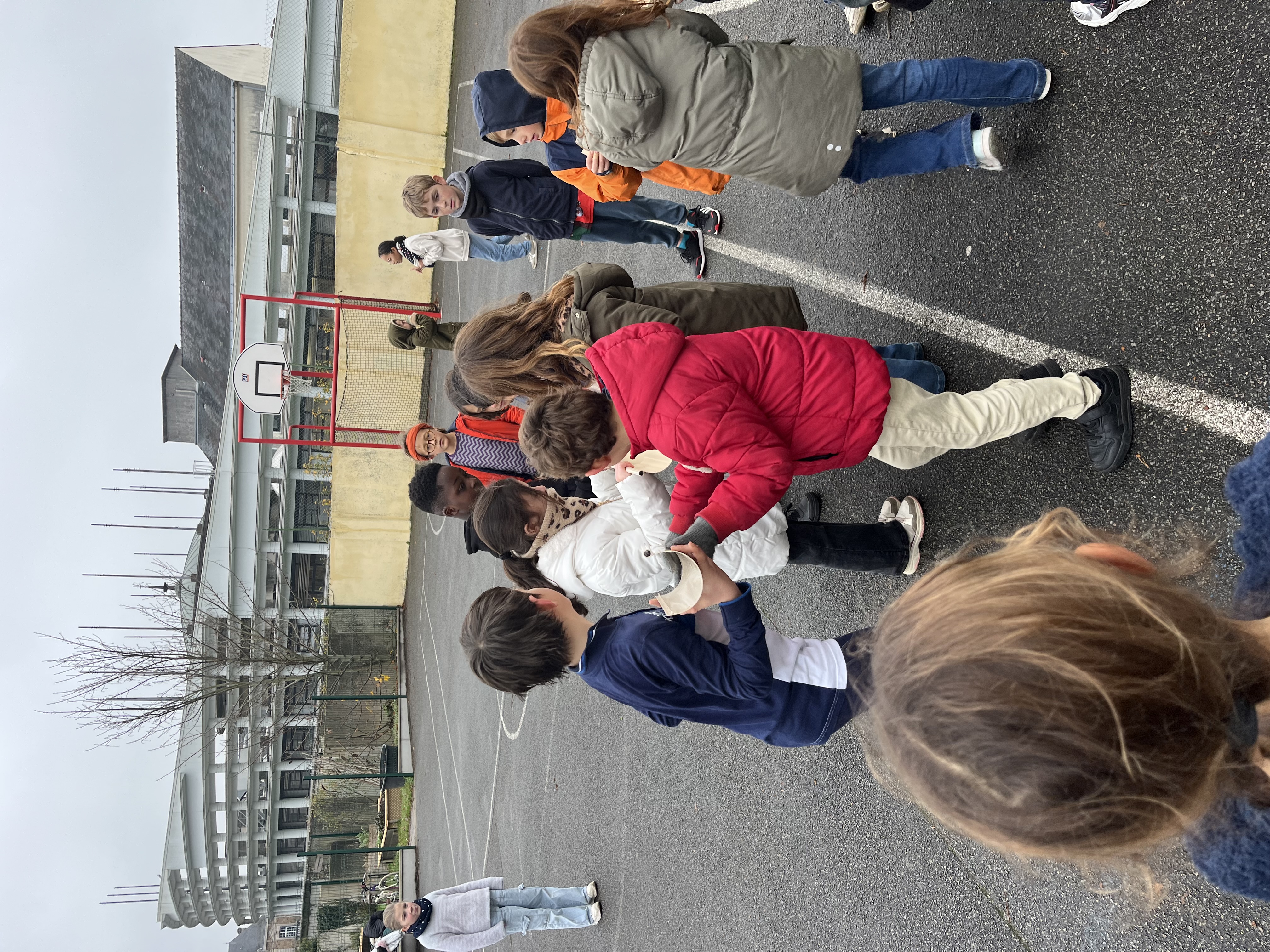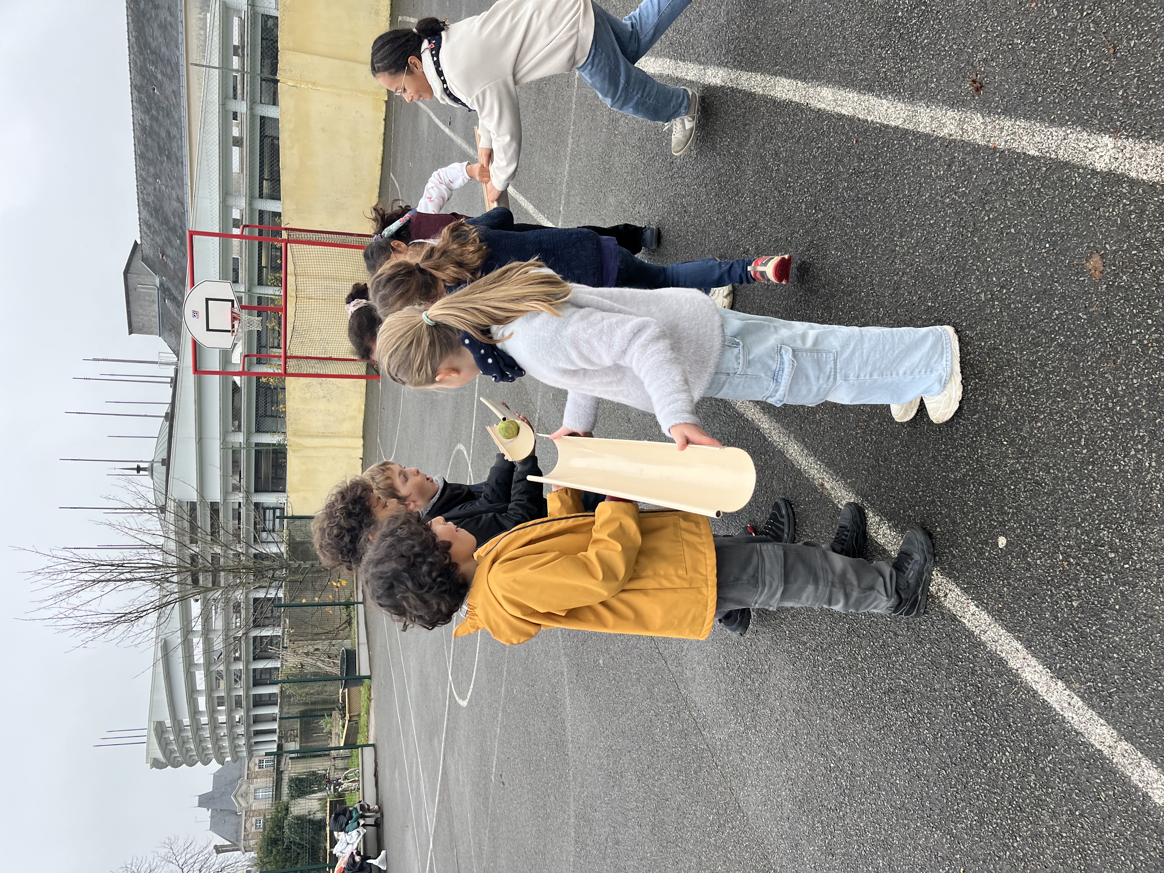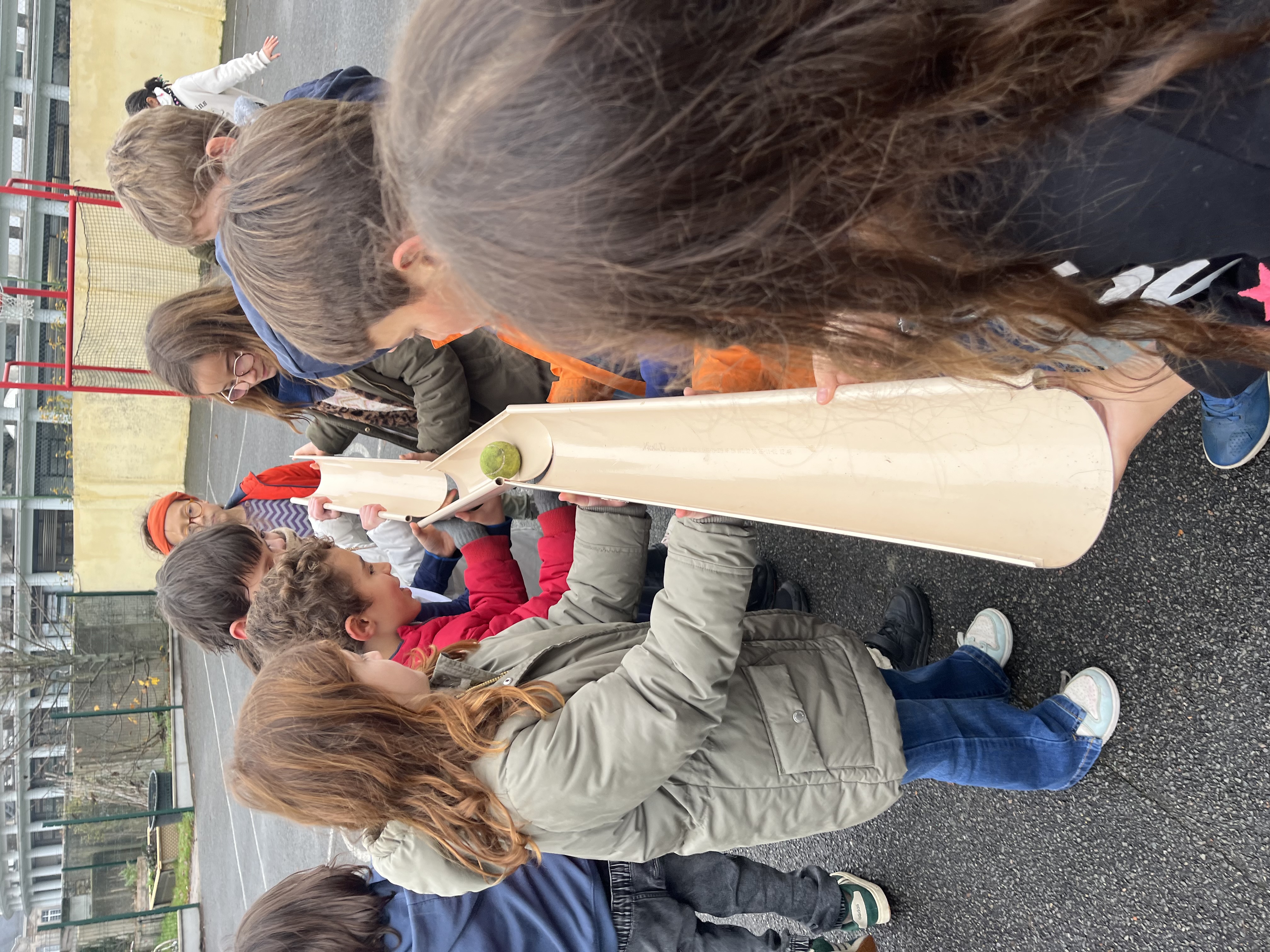Faire traverser la cour à une balle de tennis dans une gouttière sans la faire tomber par terre. Deux équipes tentent de passer dans un cerceau sans lâcher les épaules du camarade qui se trouve devant.