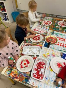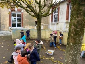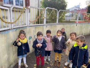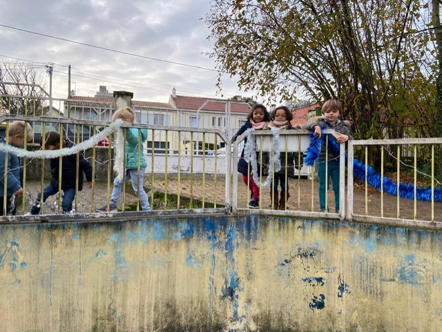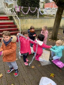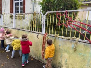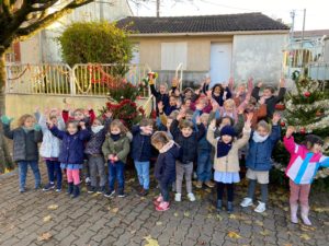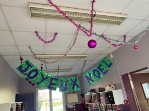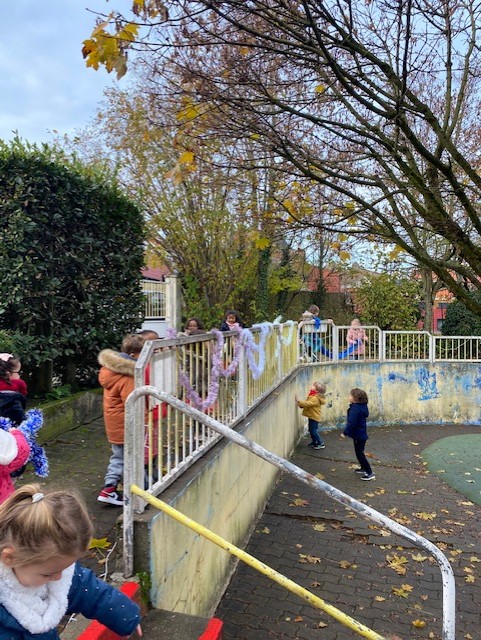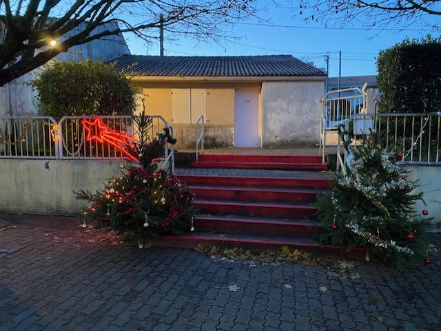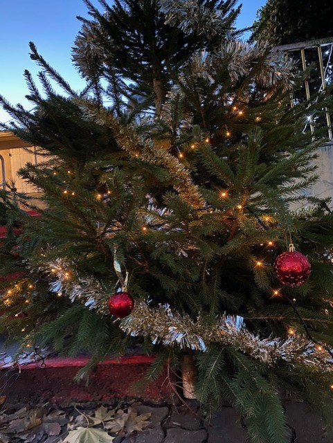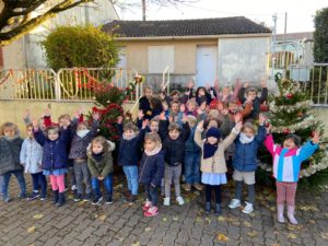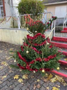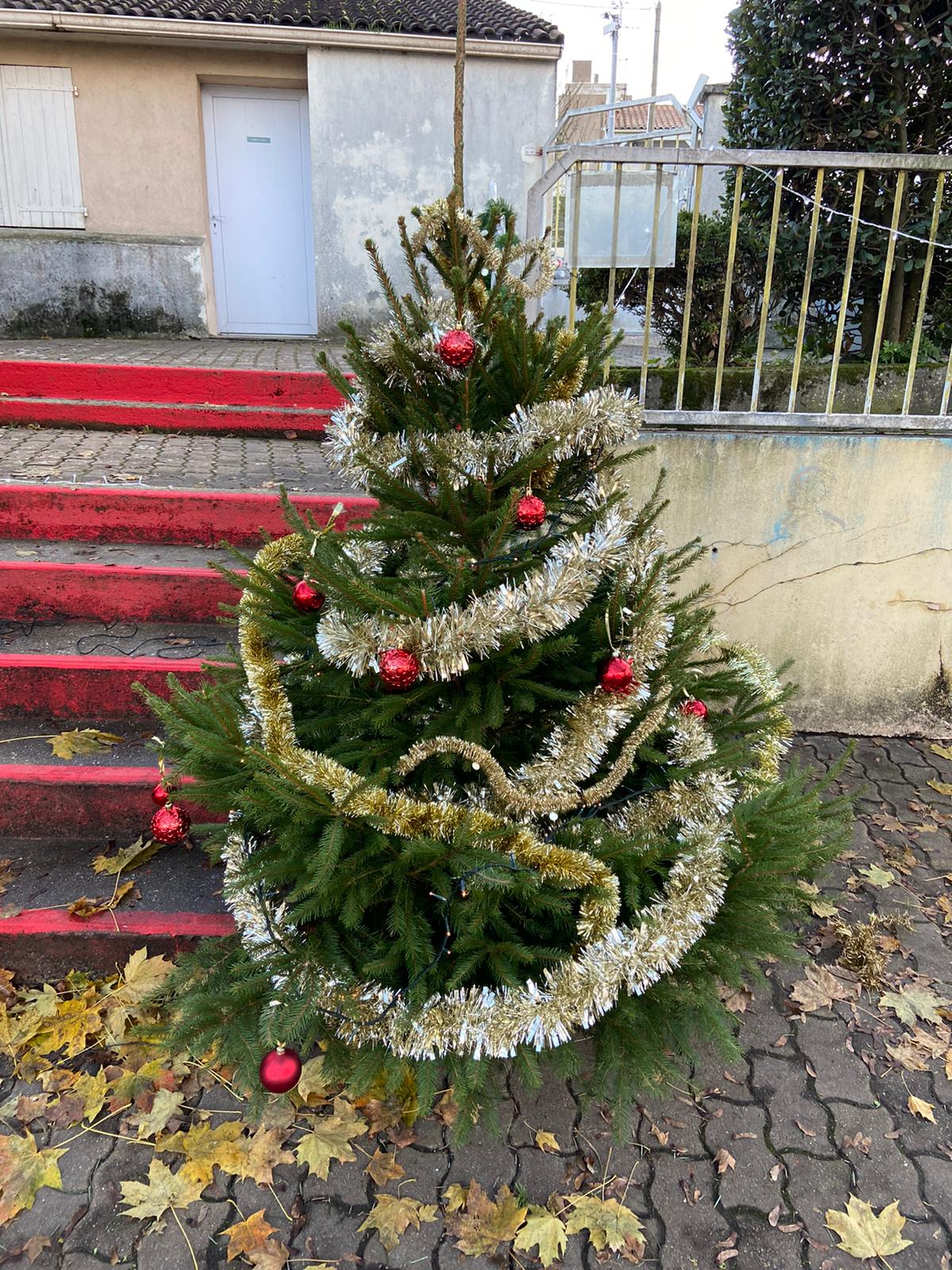 Nous avons eu la surprise de découvrir deux sapins dans la cour, tous ensemble nous les avons parés de décorations rouges et dorées.
