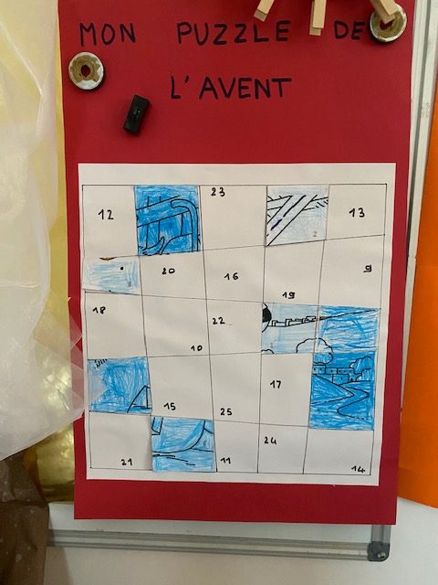 Dans nos classes chaque jour nous découvrons une nouvelle case du calendrier de l’Avent en la coloriant pour mettre en couleur la Crèche.