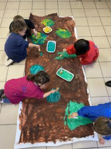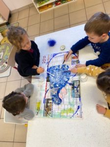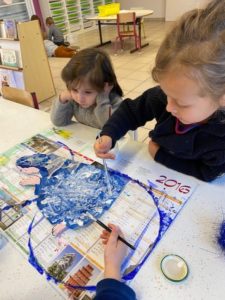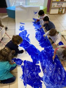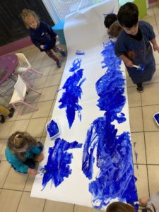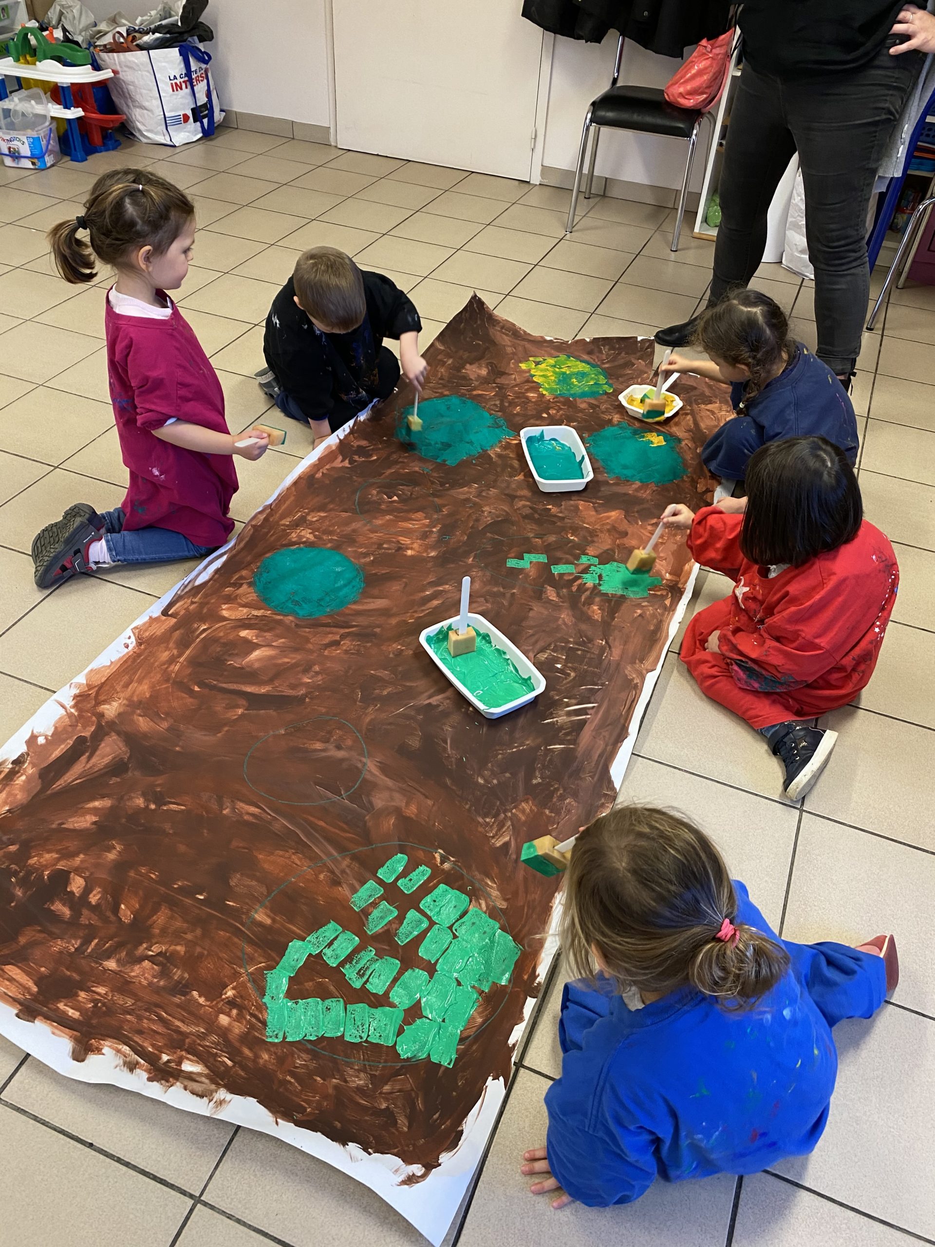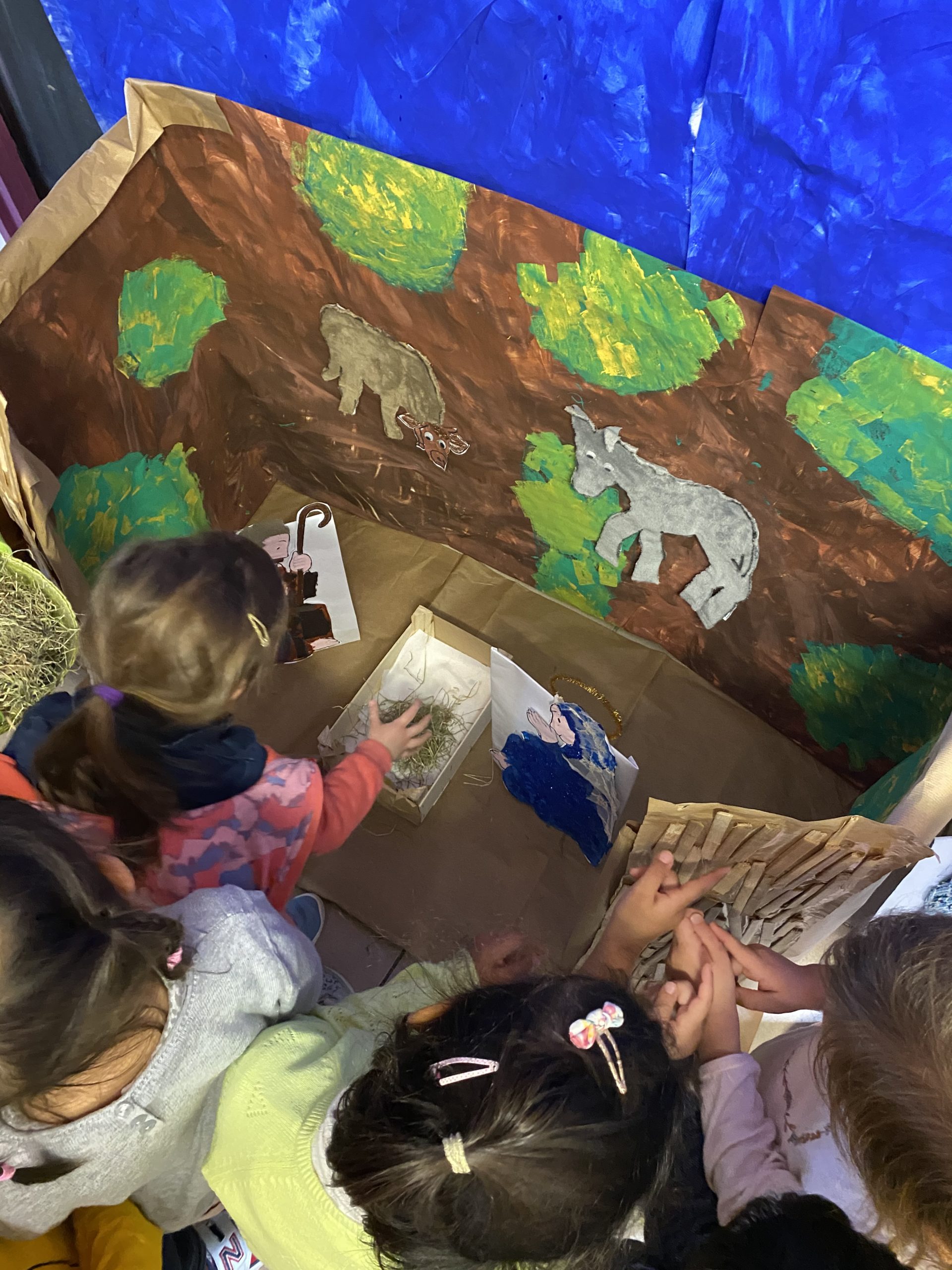 Nous décorons notre classe ensemble en créant une Crèche grandeur nature! Nous avons réalisés deux grandes fresques pour le fond et le ciel de la Crèche.