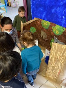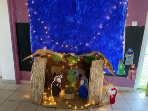 Chacun a pu ajouter de la paille dans la mangeoire entre l’âne et le bœuf, Nous avons installé Marie et Joseph .