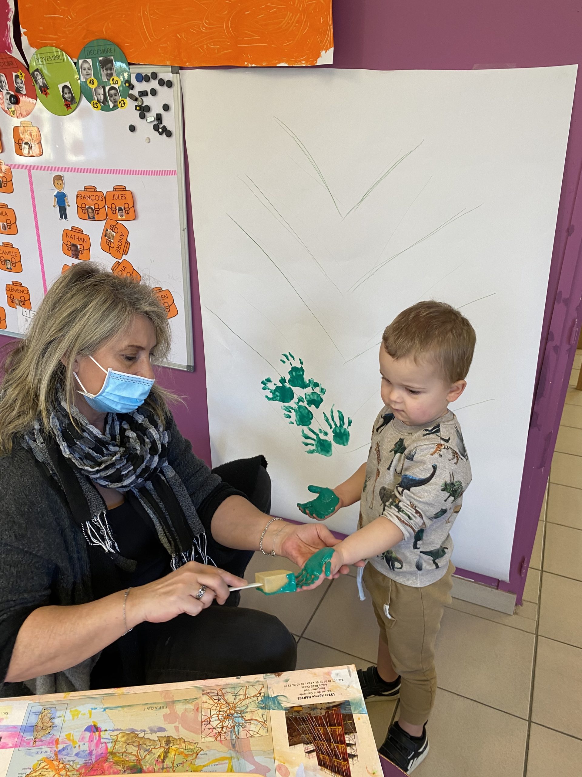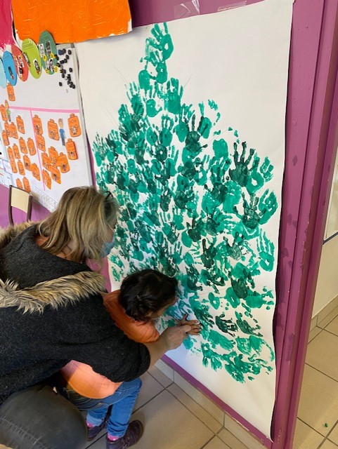 Avec Fabienne nous avons crée un grand sapin grâce à touts nos empreintes de mains!