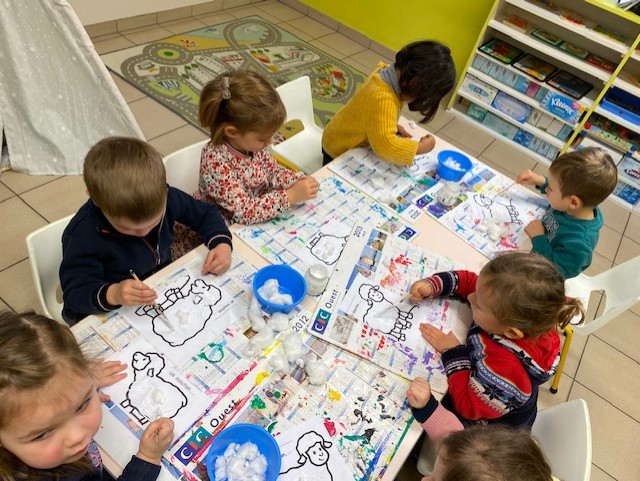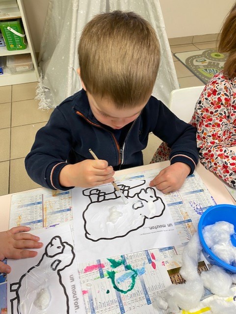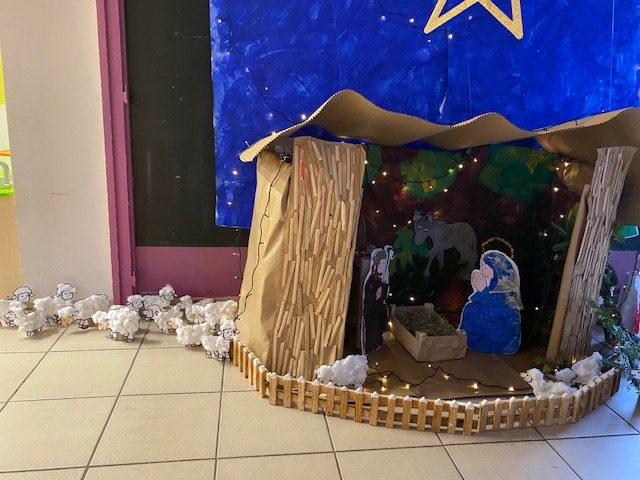 Nous avons confectionné des moutons, chaque enfant a choisi le sien, ils sont tous autours de la Crèche dans l’attente de la Nuit de Noel!