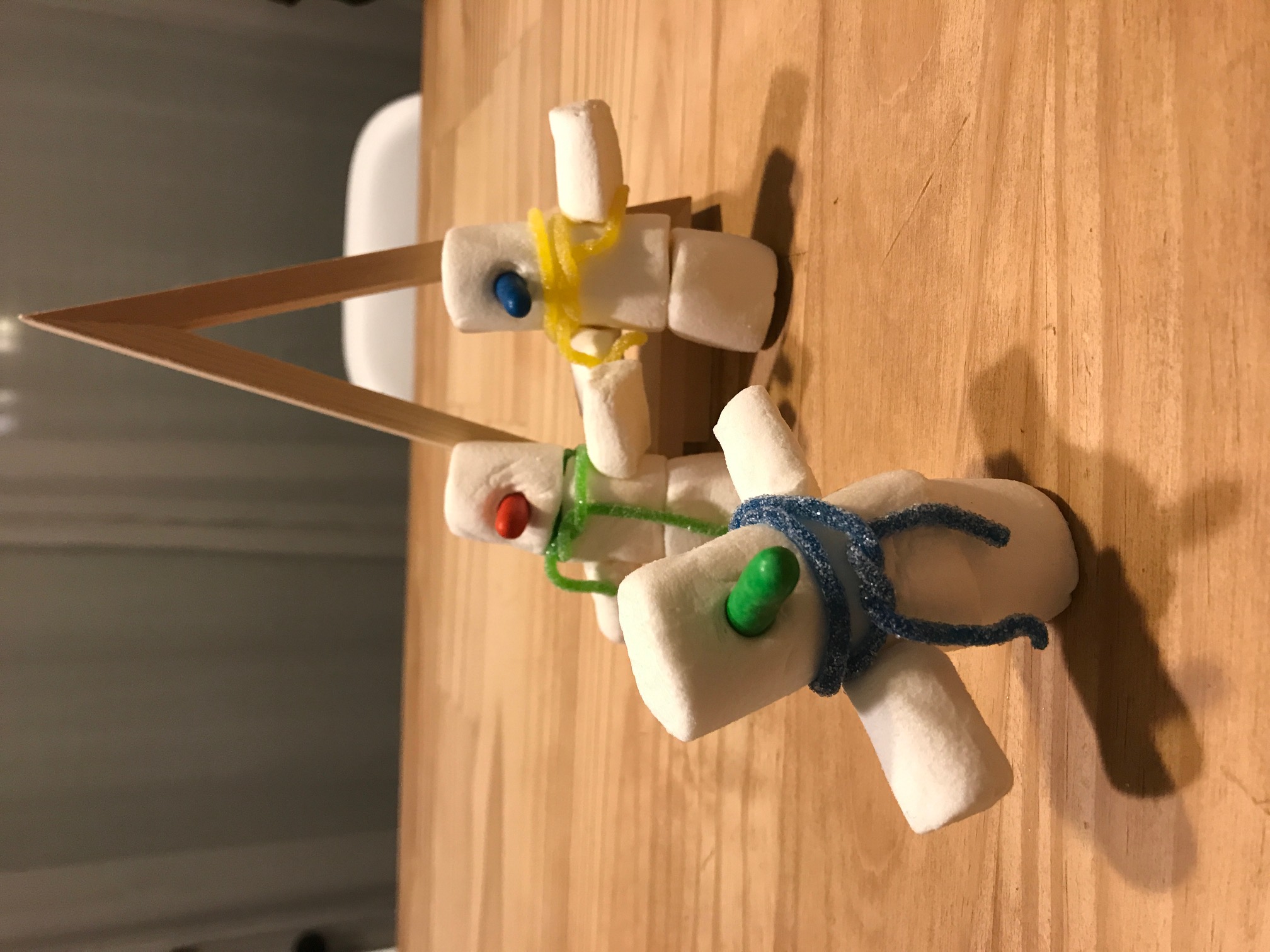 - En anglais, la maitresse nous a fait une surprise: nous avons appris le vocabulaire nécessaire pour lui demander de quoi réaliser chacun un “snowman” (bonhomme de neige) en bonbons. Nous avons dû nous retenir pour ne pas le croquer!