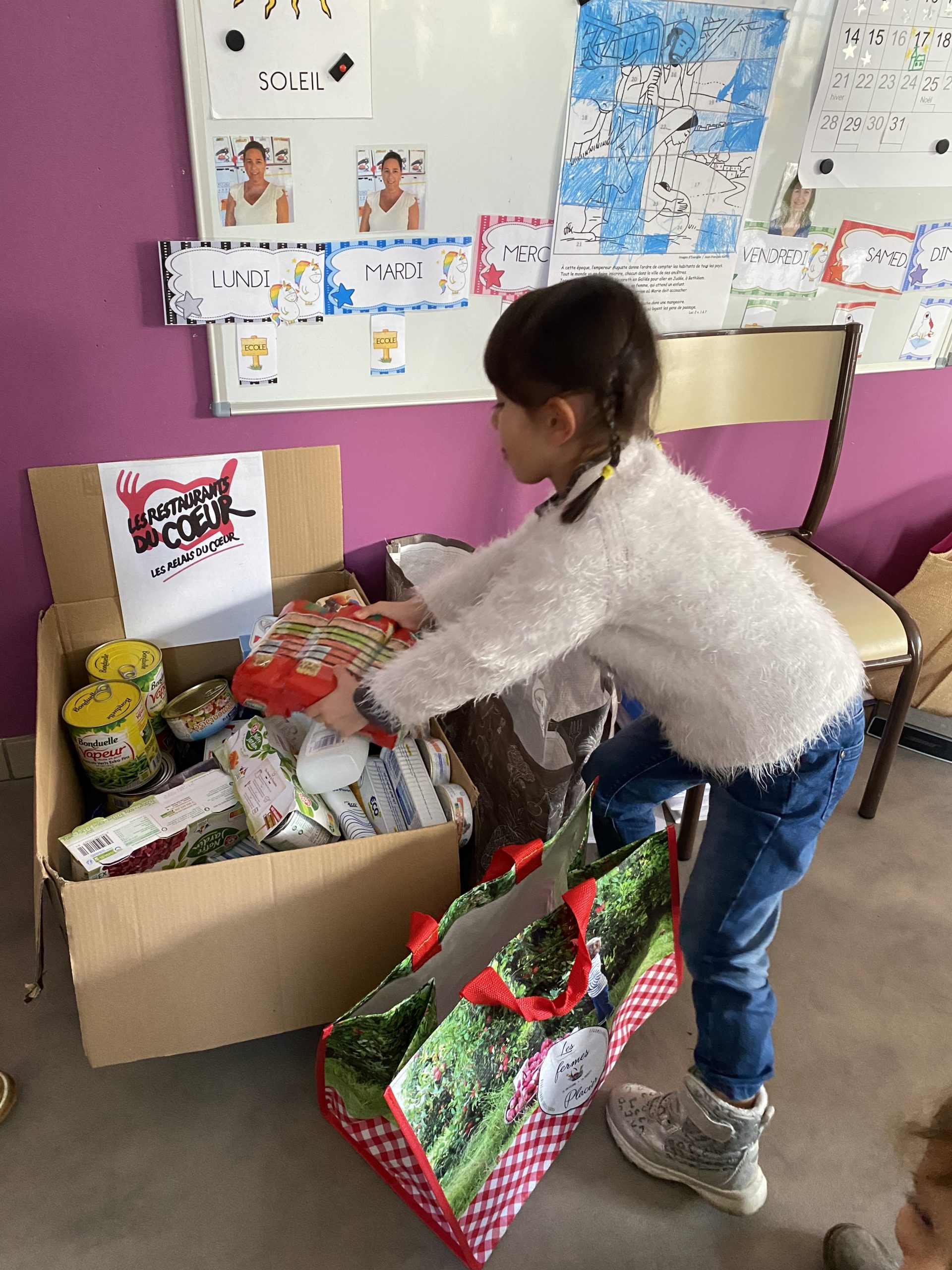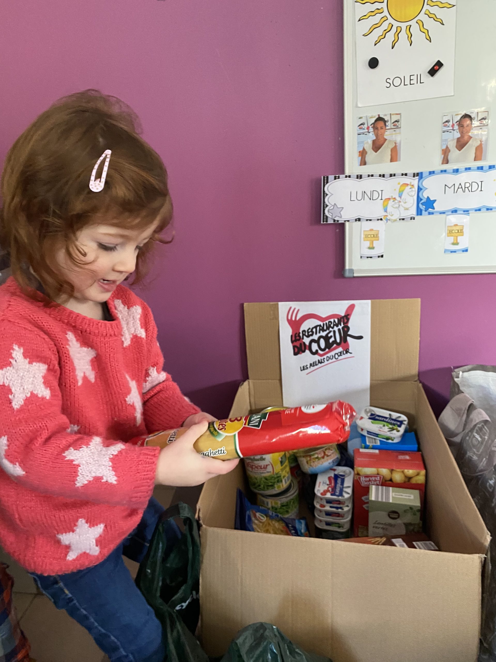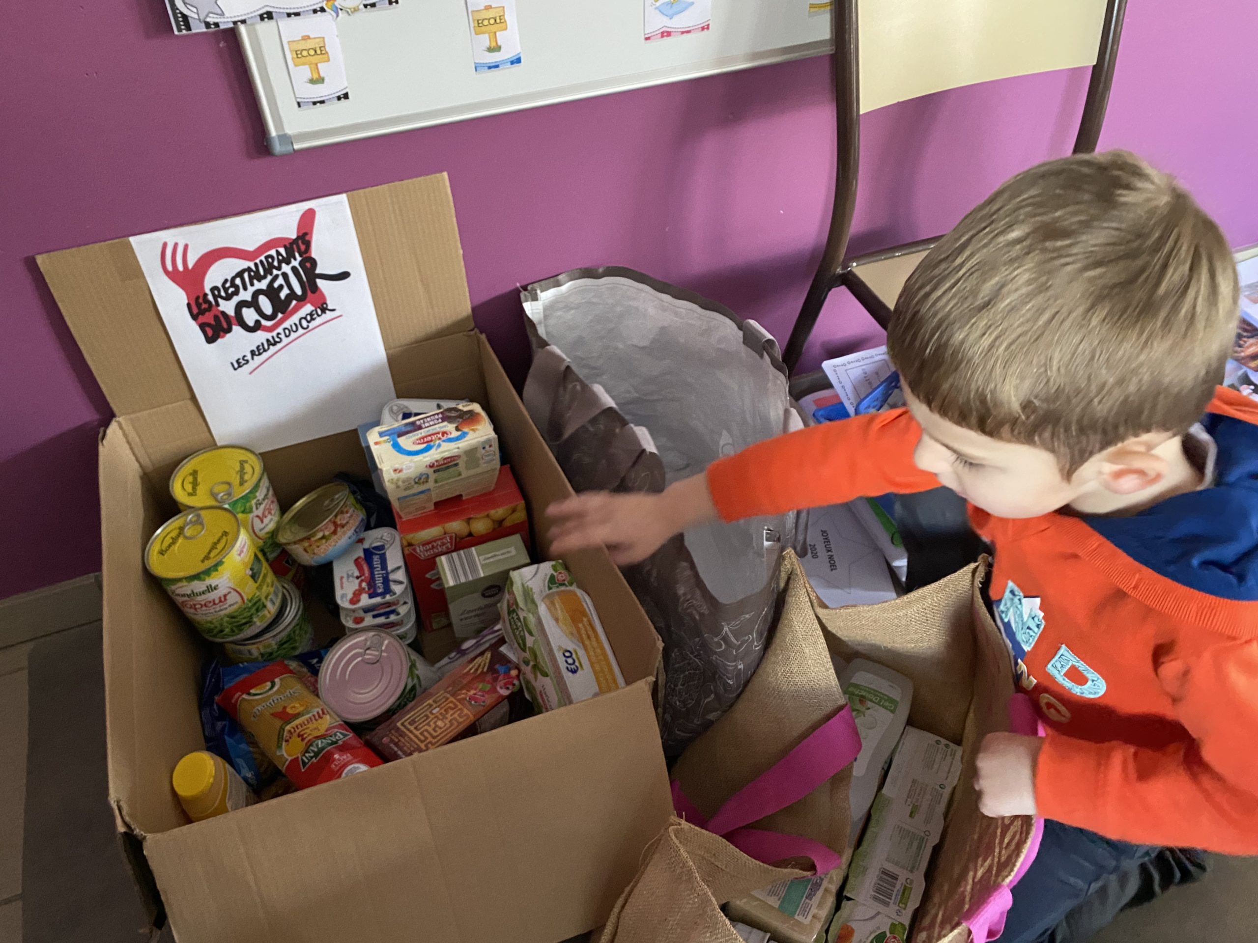 En classe nous avons expliqué qu’à Noël nous recevions beaucoup, nous avons tout ce qu’il nous faut à la maison. Certaines personnes n’ont pas cette chance aussi nous avons lancé une collecte et toute l’école a participé !