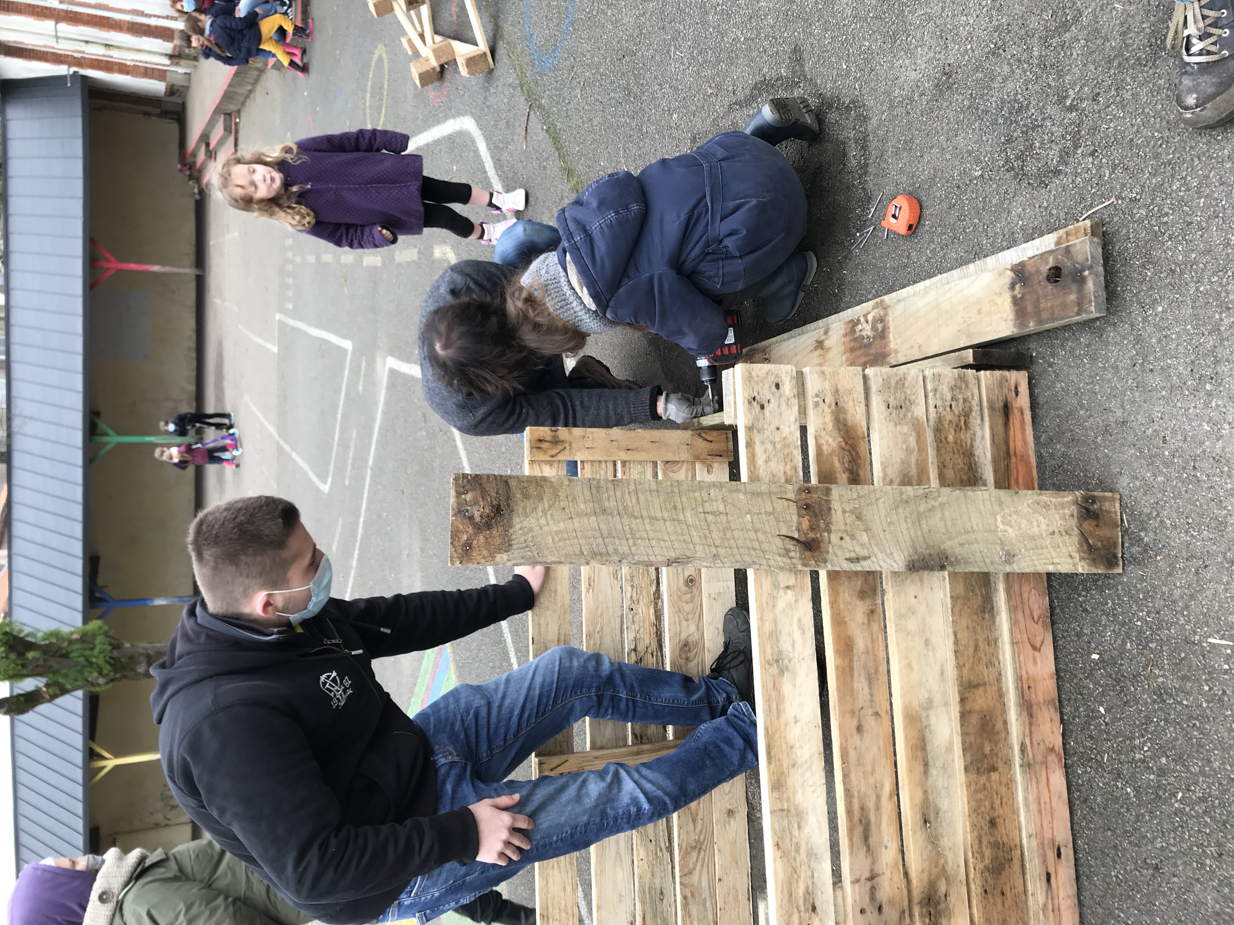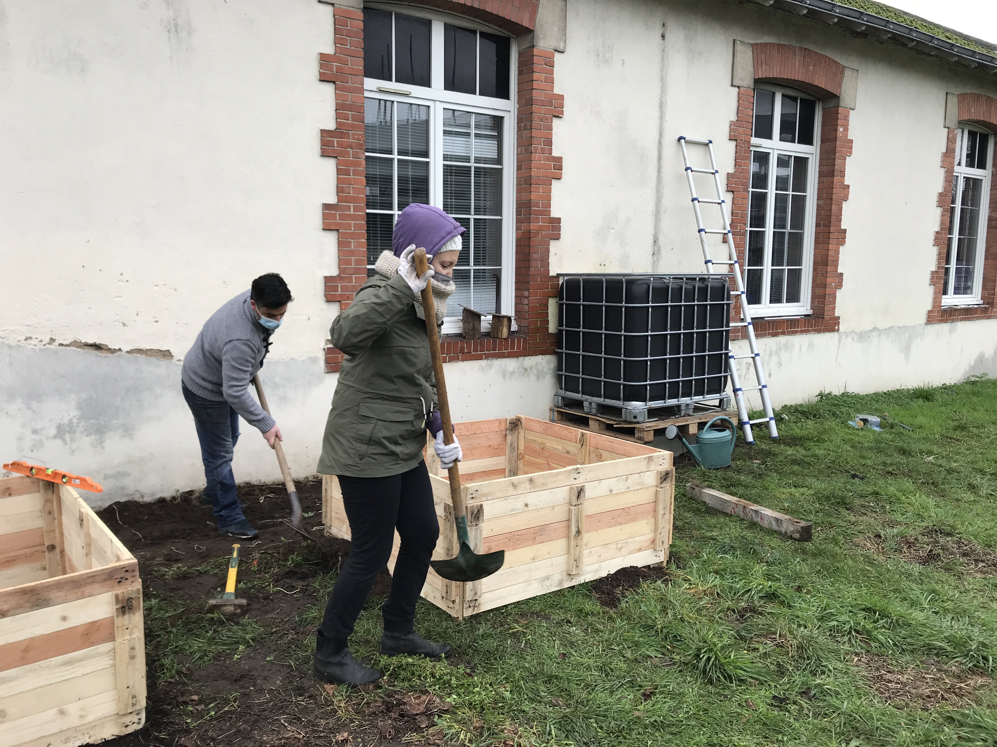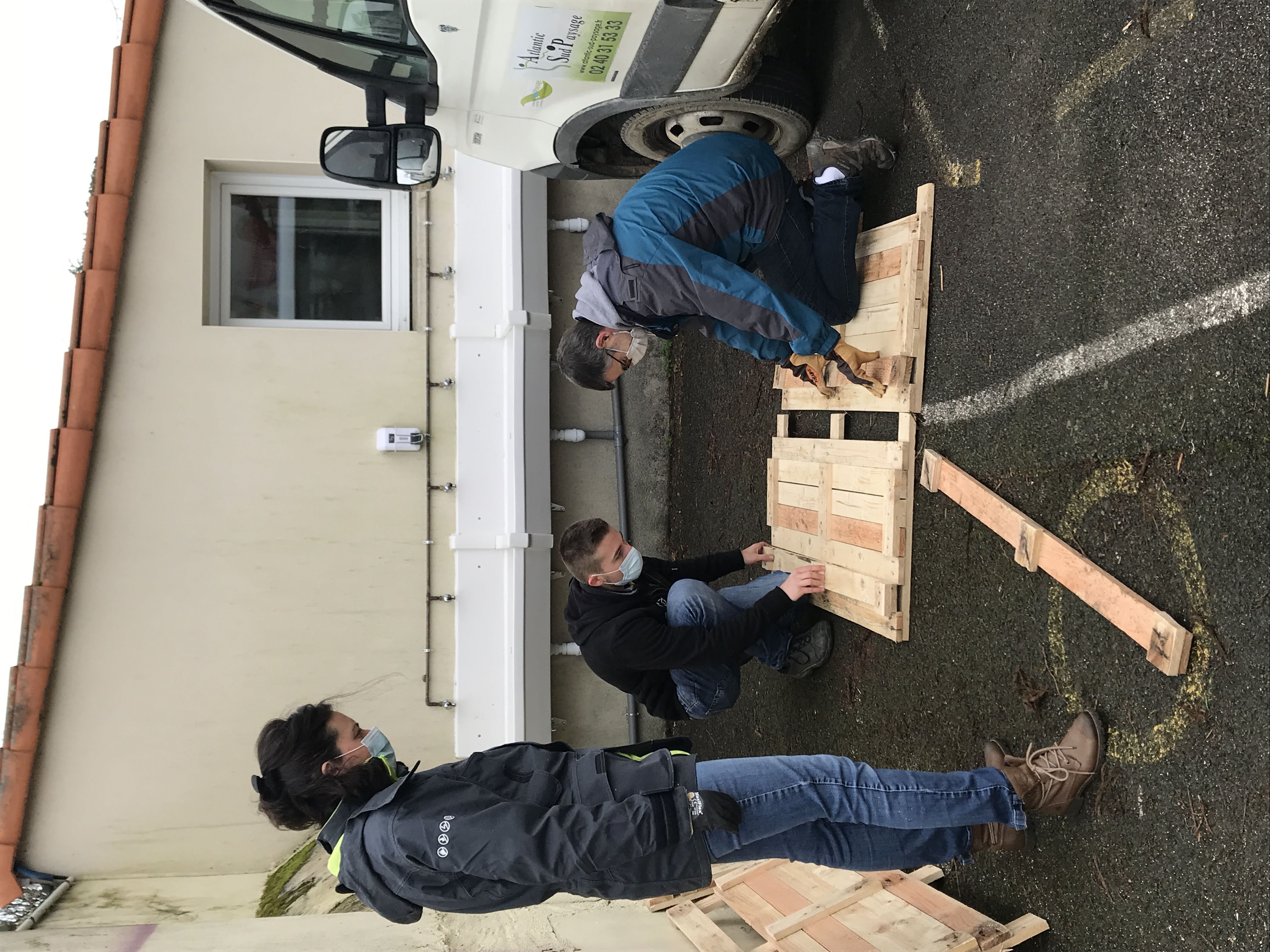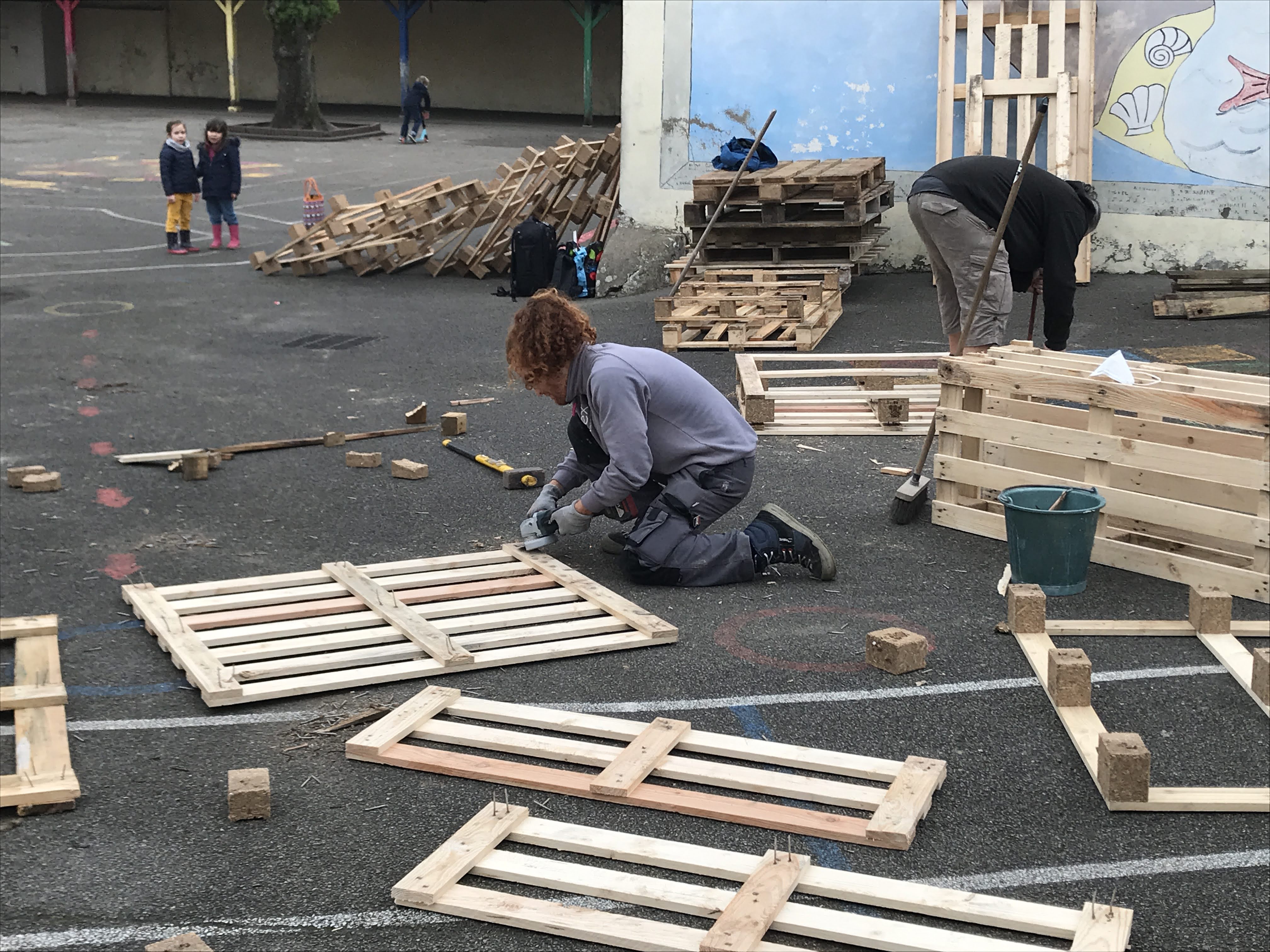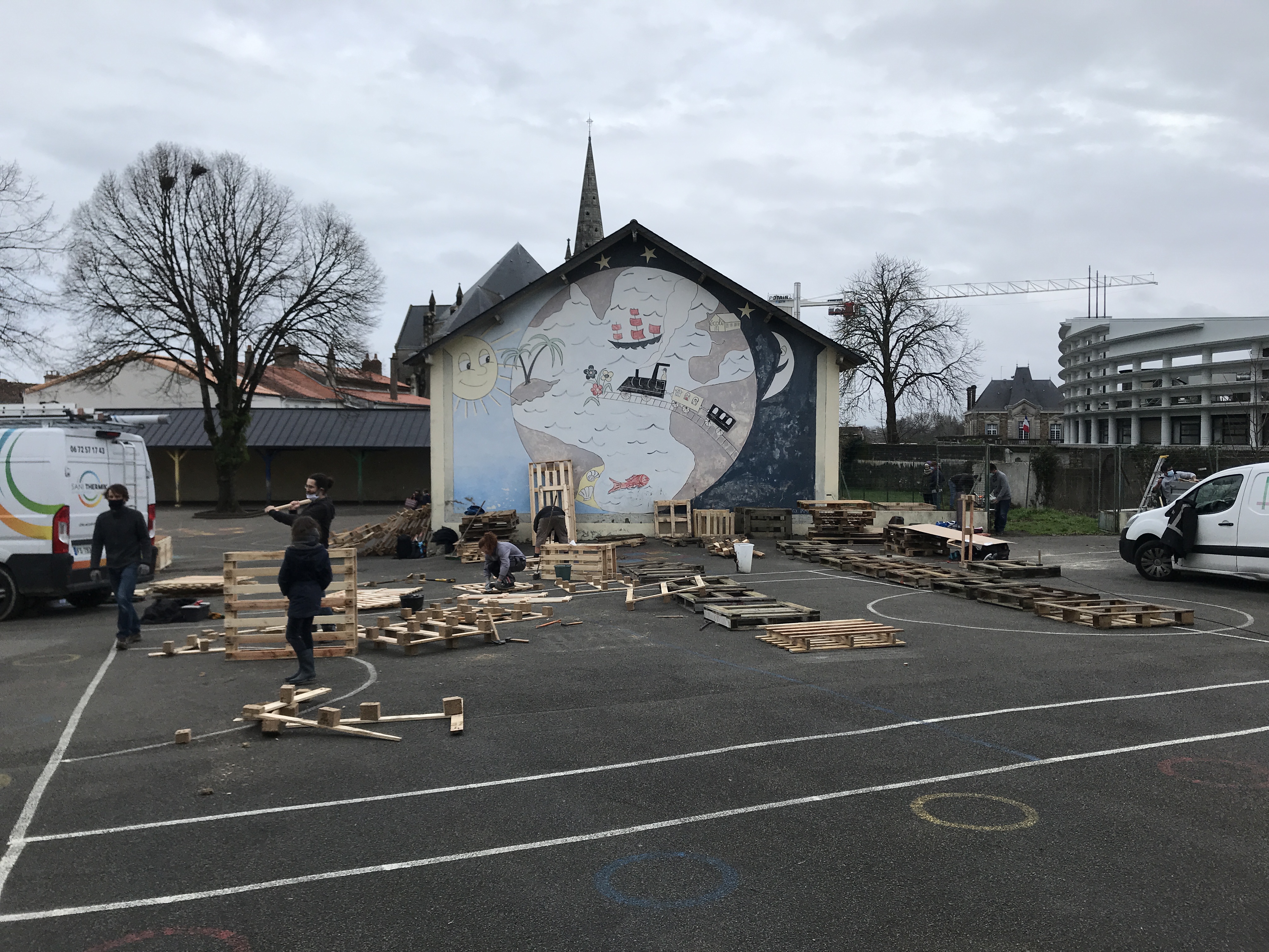 Vous vous souvenez? Il y a un peu plus de 3 semaines, nous avons fait appel à vous pour du matériel et de la main d’œuvre, afin d’installer un récupérateur d’eau et construire des carrés de jardins avec du bois de récupération (palettes). Vous avez répondu présents!! Et c’est une équipe de parents ultra-motivés, outillés et enthousiastes qui s’est retrouvée sur la cour de l’école ce samedi matin 6 février. Nous avons suivi les consignes de 3 étudiants en agriculture urbaine à Nantes qui nous accompagnent et nous conseillent: Titouan, Ronan et Mathieu. Merci à vous pour tout votre travail!