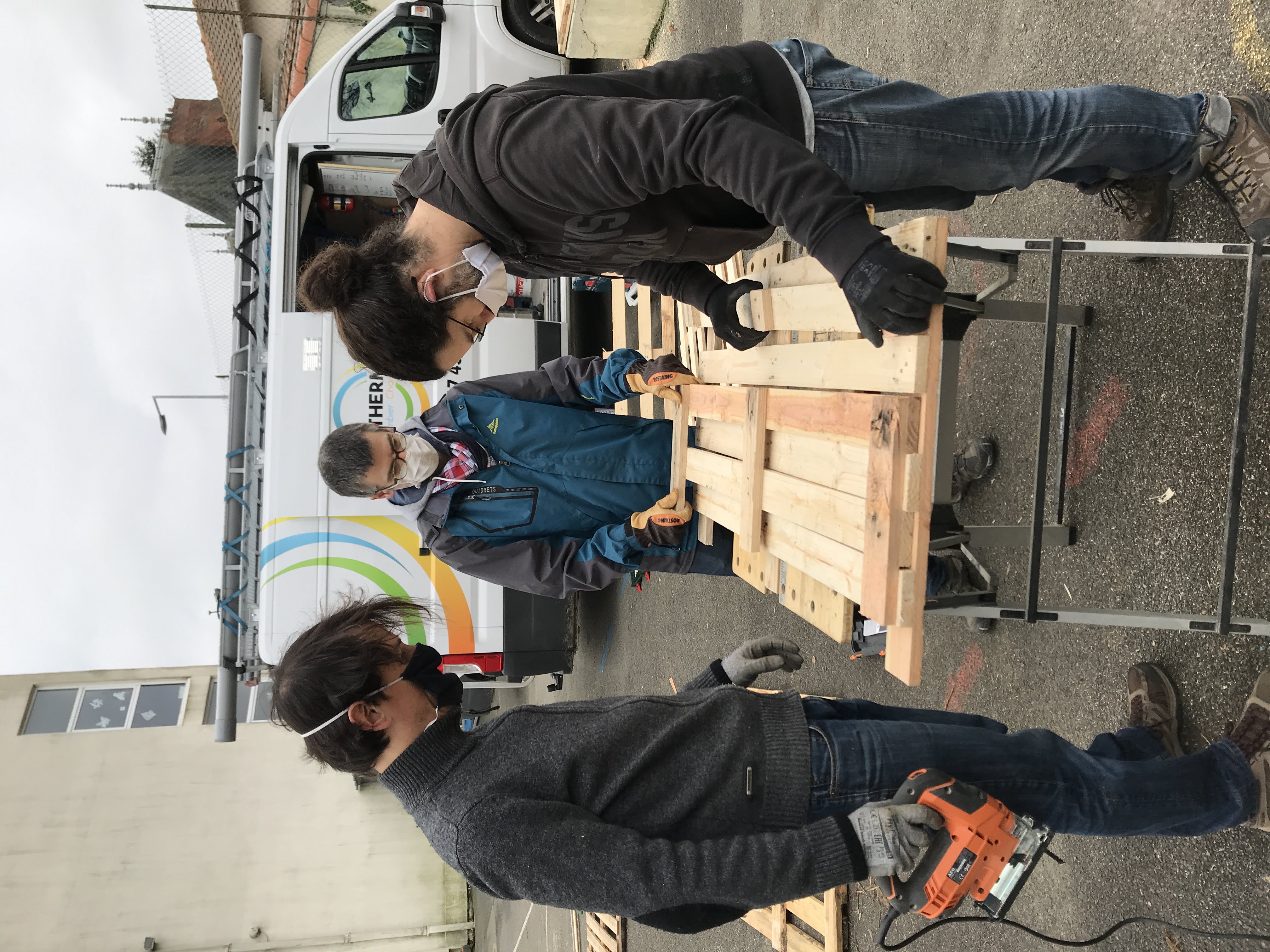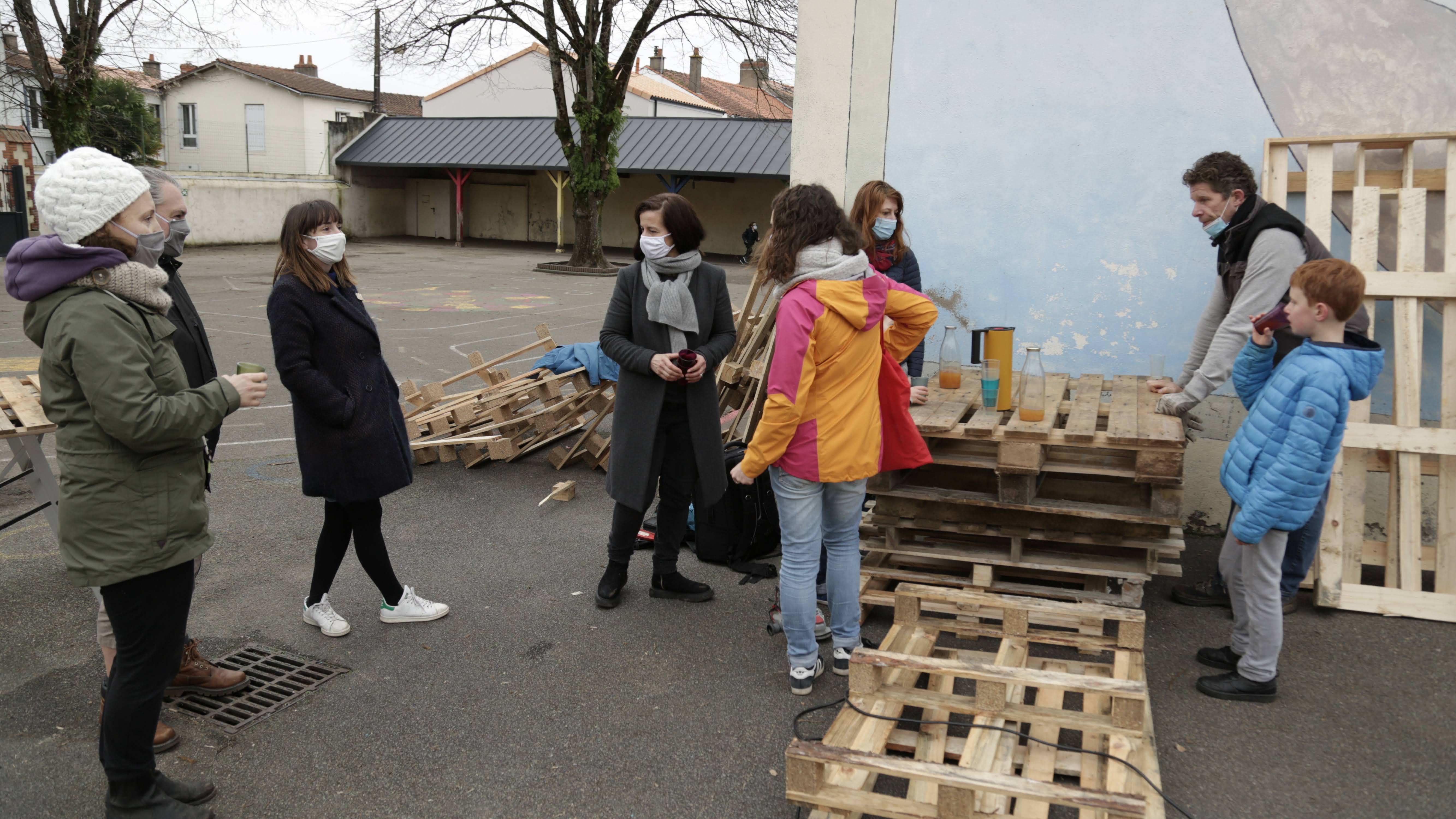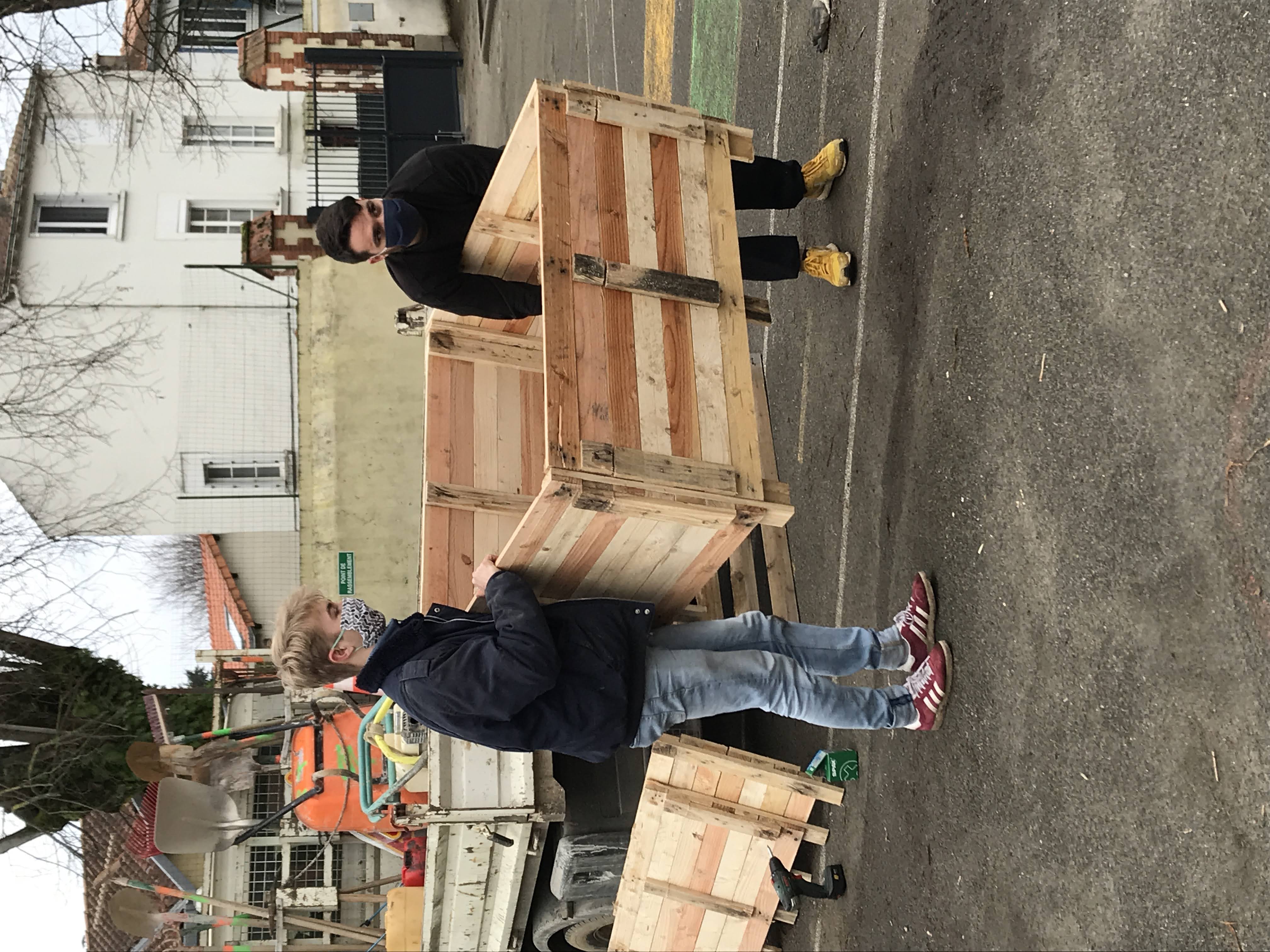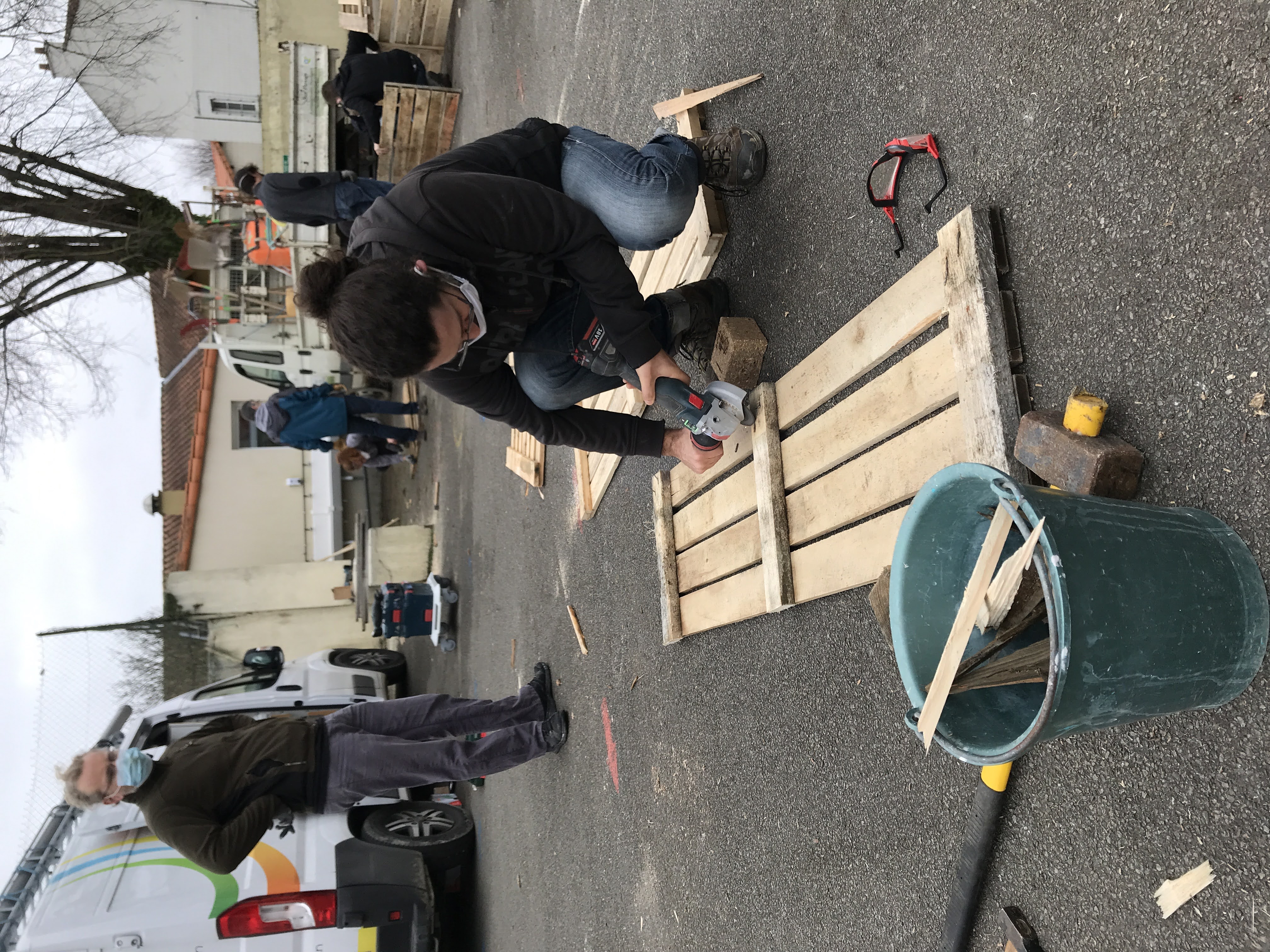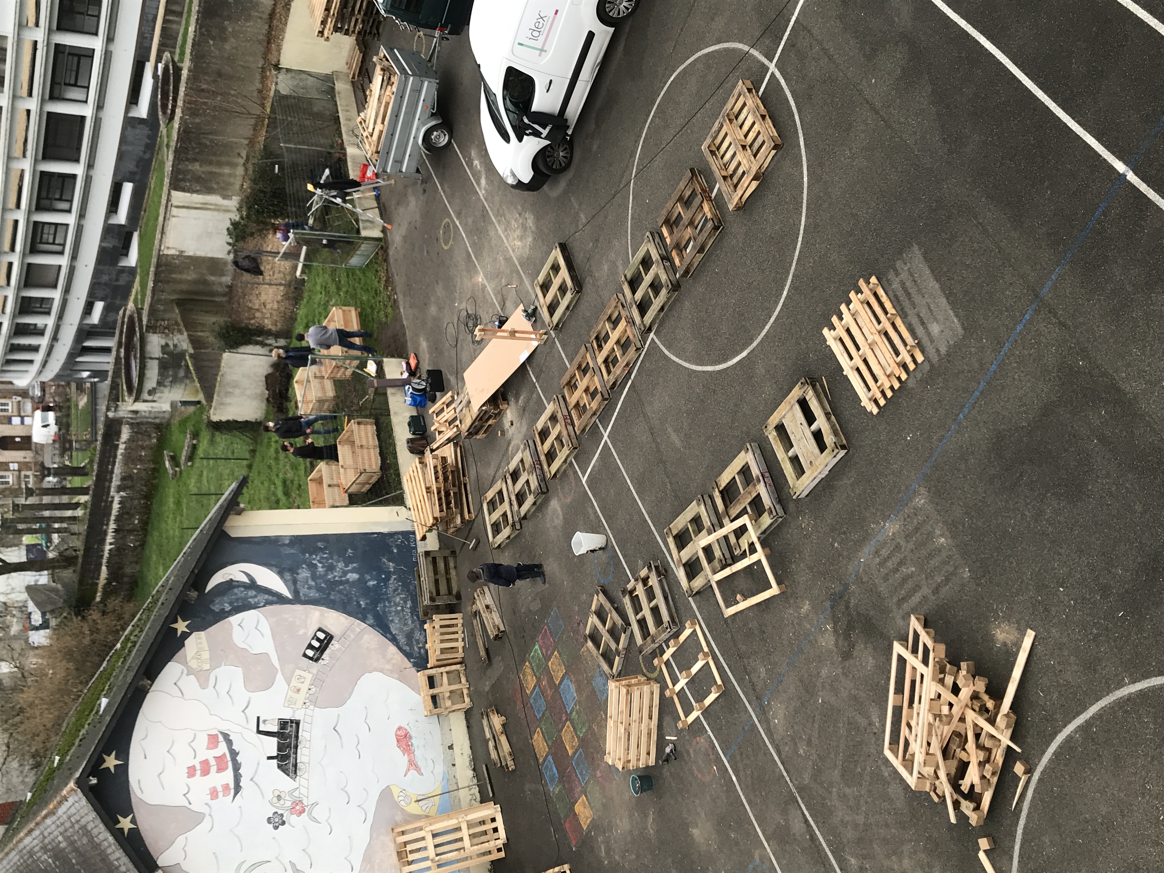 Vous vous souvenez? Il y a un peu plus de 3 semaines, nous avons fait appel à vous pour du matériel et de la main d’œuvre, afin d’installer un récupérateur d’eau et construire des carrés de jardins avec du bois de récupération (palettes). Vous avez répondu présents!! Et c’est une équipe de parents ultra-motivés, outillés et enthousiastes qui s’est retrouvée sur la cour de l’école ce samedi matin 6 février. Nous avons suivi les consignes de 3 étudiants en agriculture urbaine à Nantes qui nous accompagnent et nous conseillent: Titouan, Ronan et Mathieu. Merci à vous pour tout votre travail!
