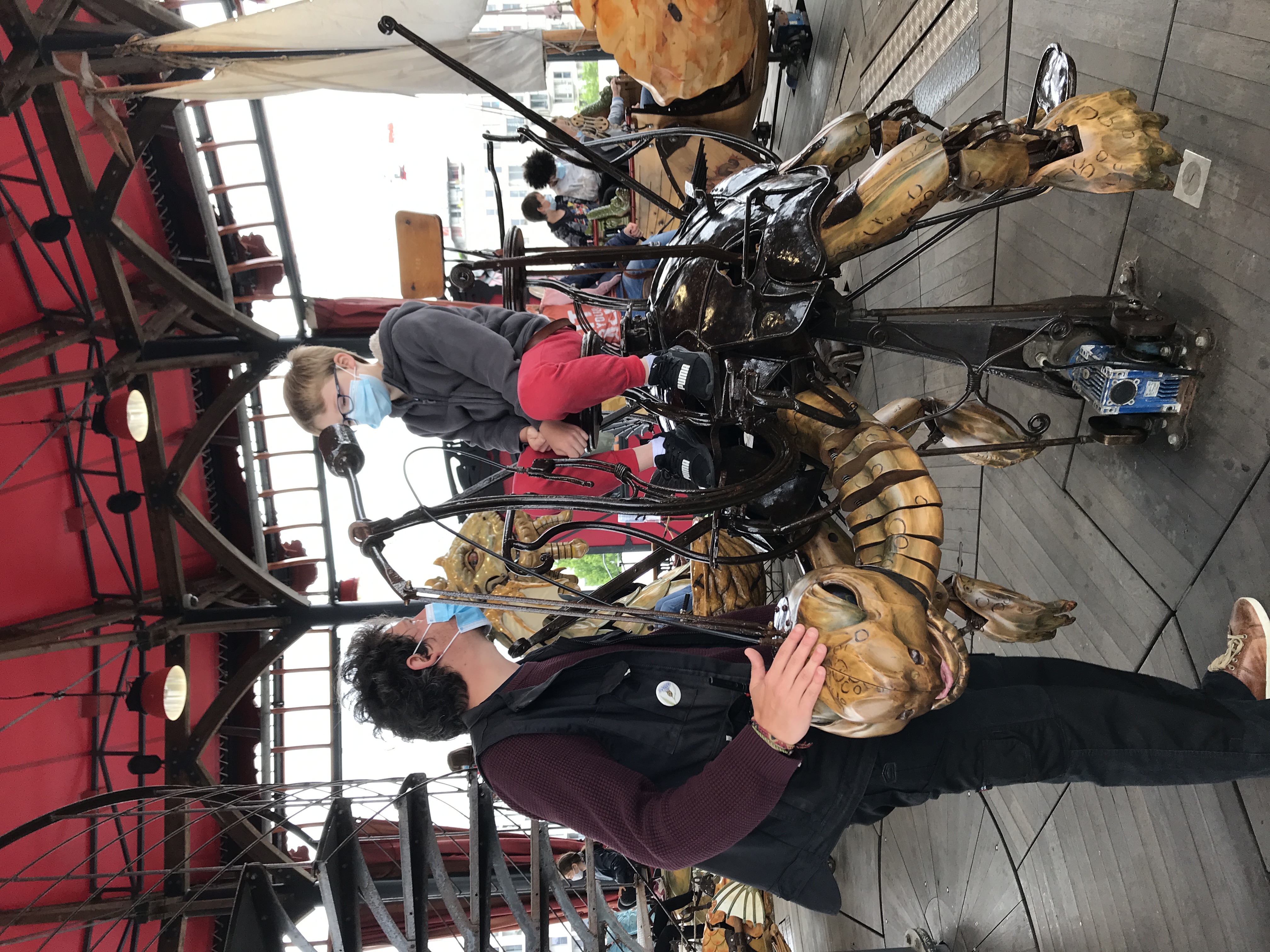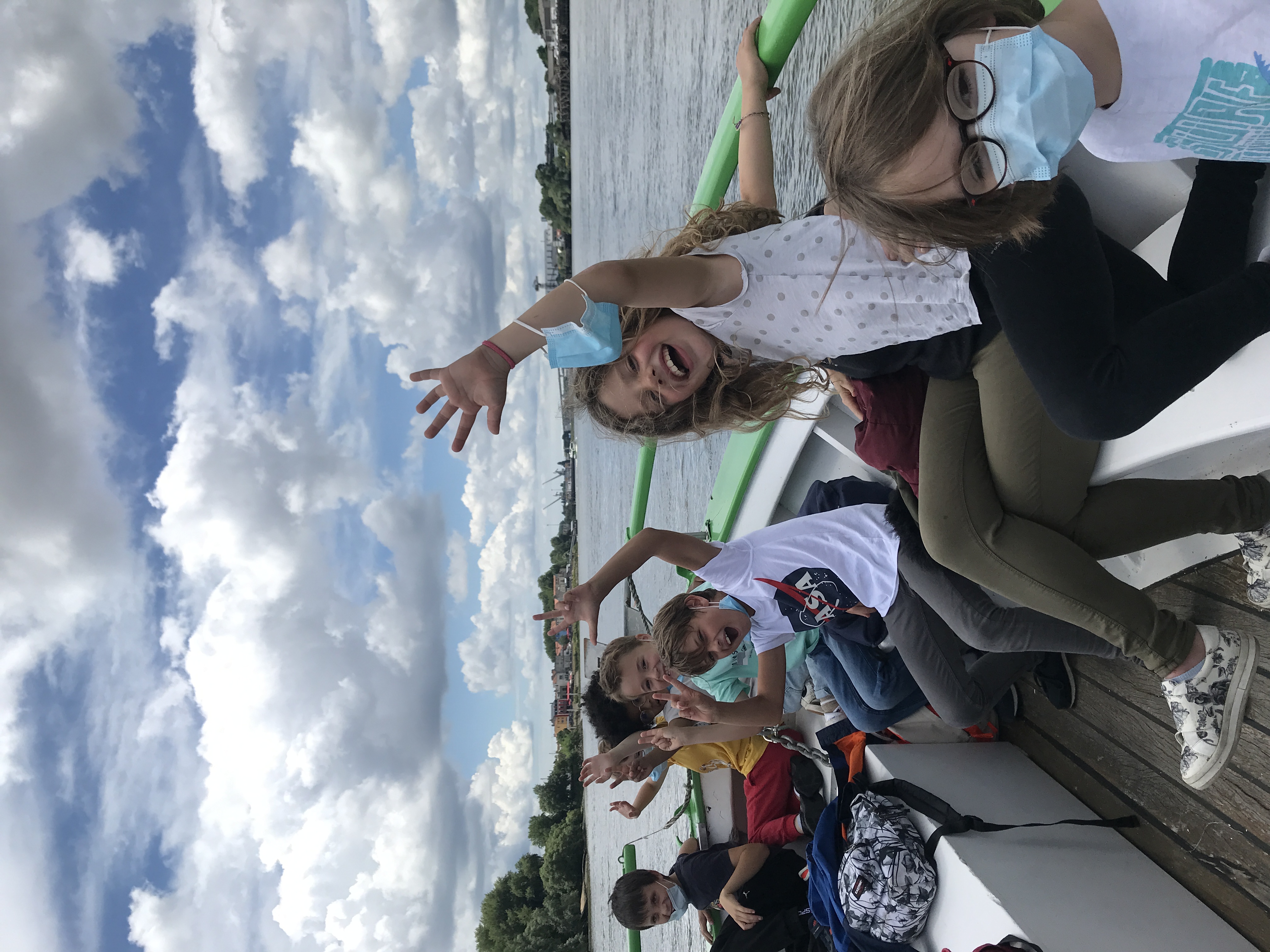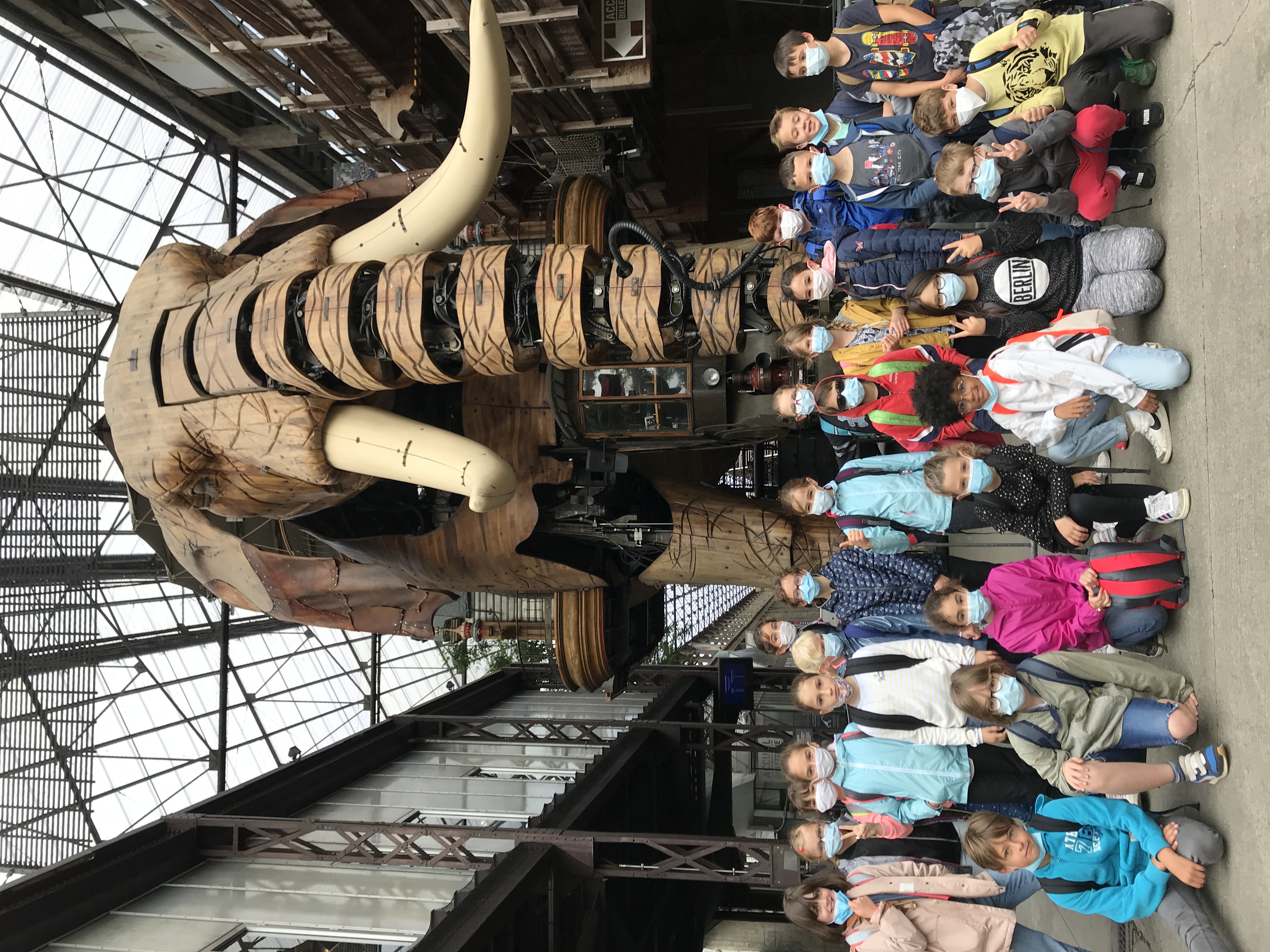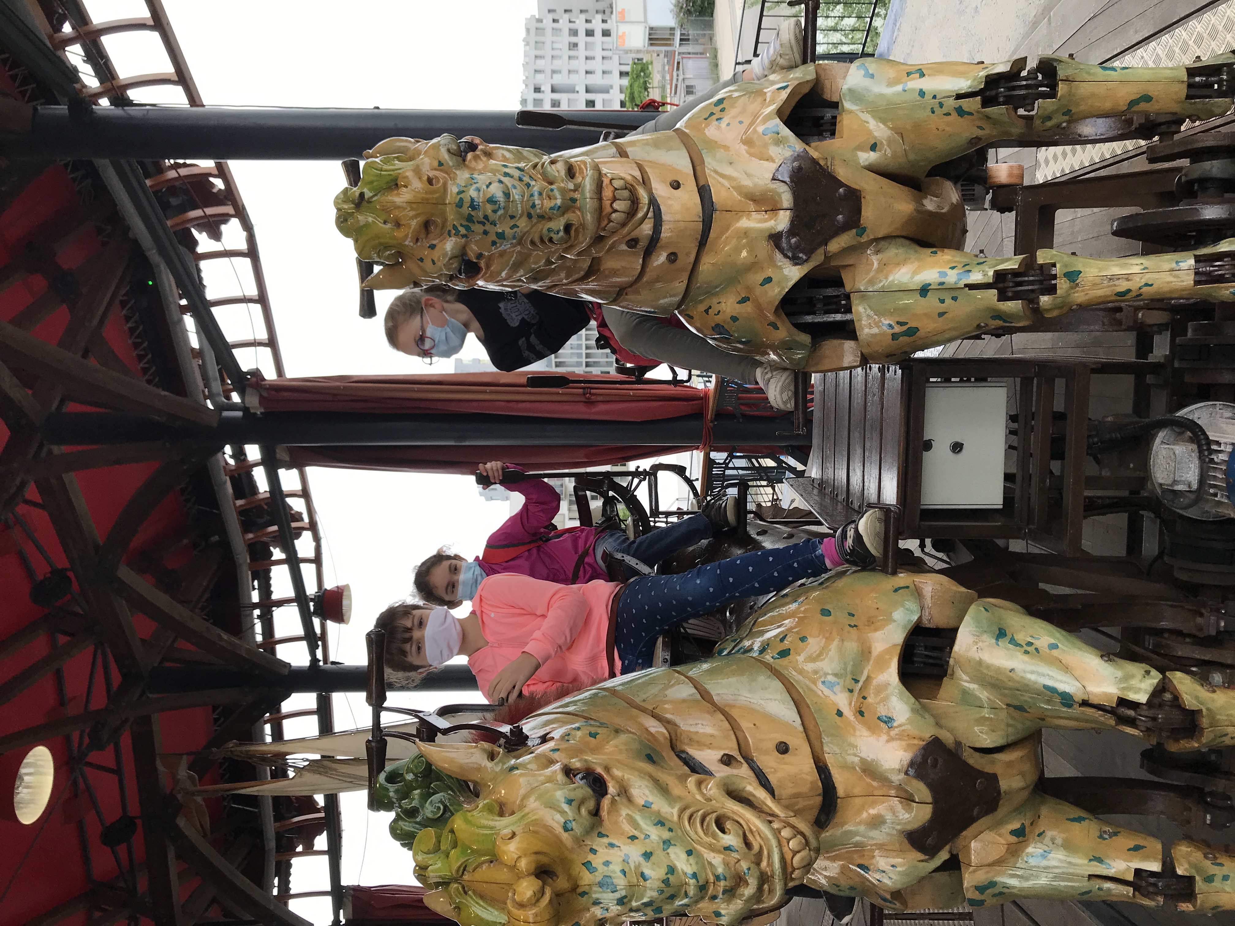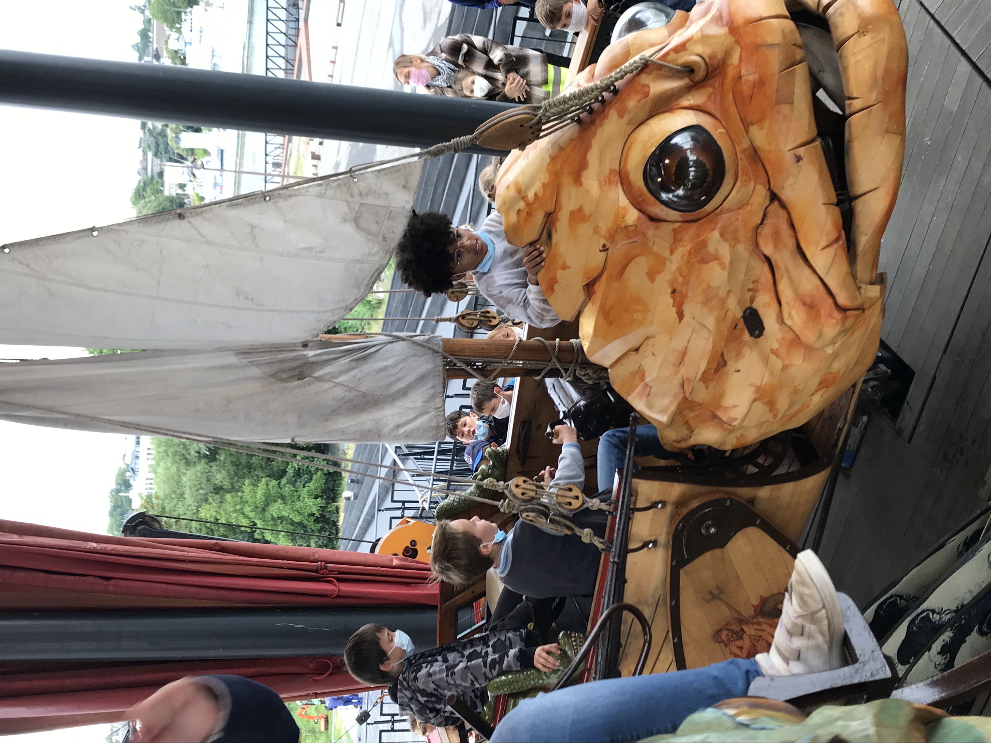 Quelle belle journée nous avons passée mardi 29 juin pour notre sortie scolaire! Le soleil s’était invité et nous a accompagnés du début à la fin. Nous avons emprunté toutes sortes de transports en commun: bus, tram et navibus. Après avoir salué le majestueux éléphant, nous sommes partis à notre rendez-vous de 10h au Carrousel des Mondes Marins pour une visite guidée, suivie d’un tour dont petits et grands se sont délectés! Puis, ce fut au tour de la galerie des Machines où Tiphaine, Amandine et Sarah ont eu la chance d’en faire fonctionner quelques-unes. Après un passage dans la serre tropicale et un tour très instructif aux ateliers de fabrication, nous sommes partis dévorer notre pique-nique sur les bords de Loire et sauter sur les trampolines de la « Lune »! Sous la Titan grise, nous avons ensuite emprunté la nouvelle ligne de Navibus vers Chantenay. Et c’est le nez au vent que nous avons fait route jusqu’au LAB, puis suivi la ligne verte jusqu’au Jardin Extraordinaire. Nous avons encore pu jouer un bon moment avant de naviguer à nouveau sur la Loire et prendre le bus à Trentemoult jusqu’à l’école, enchantés par cette magnifique journée!