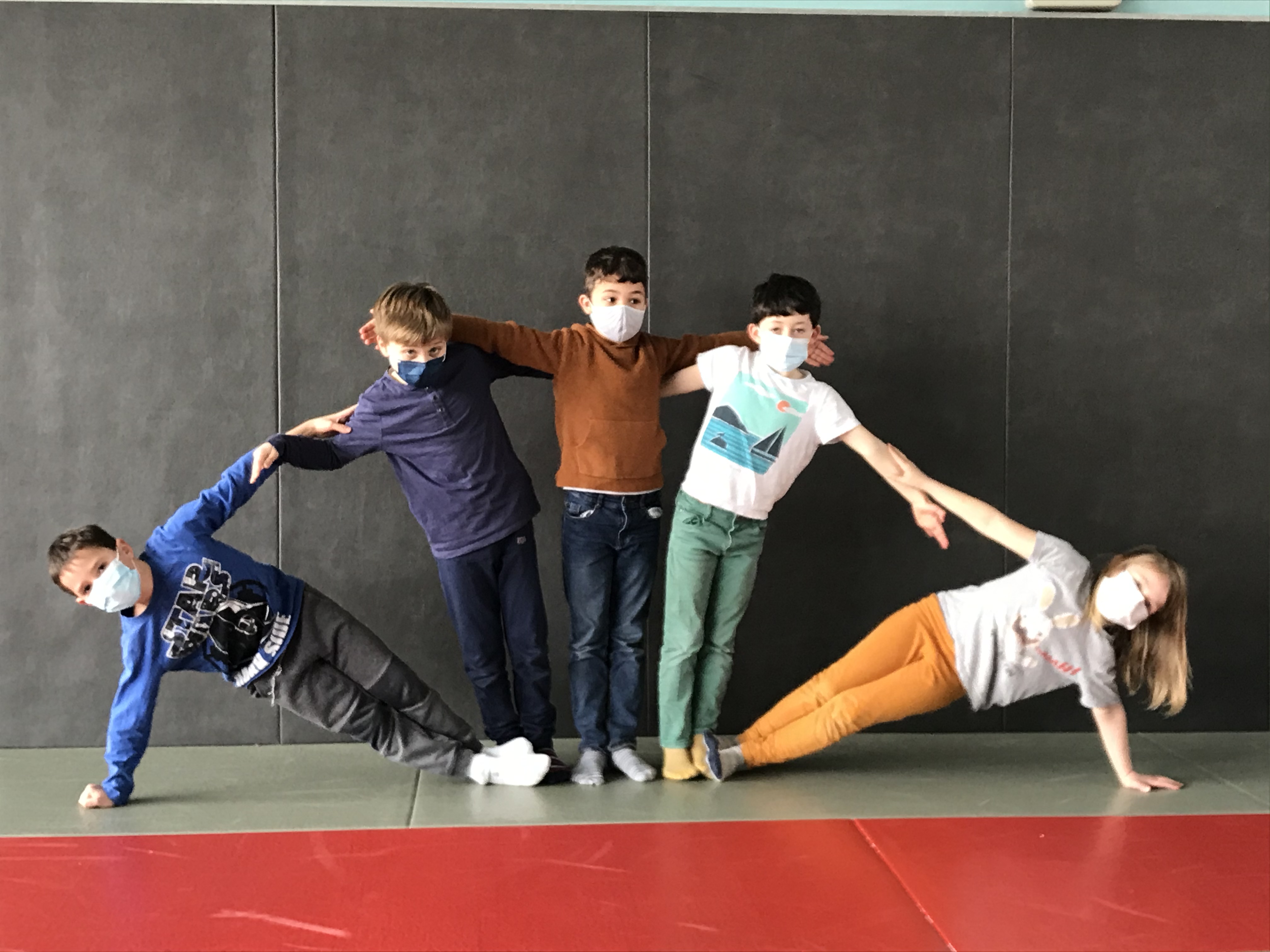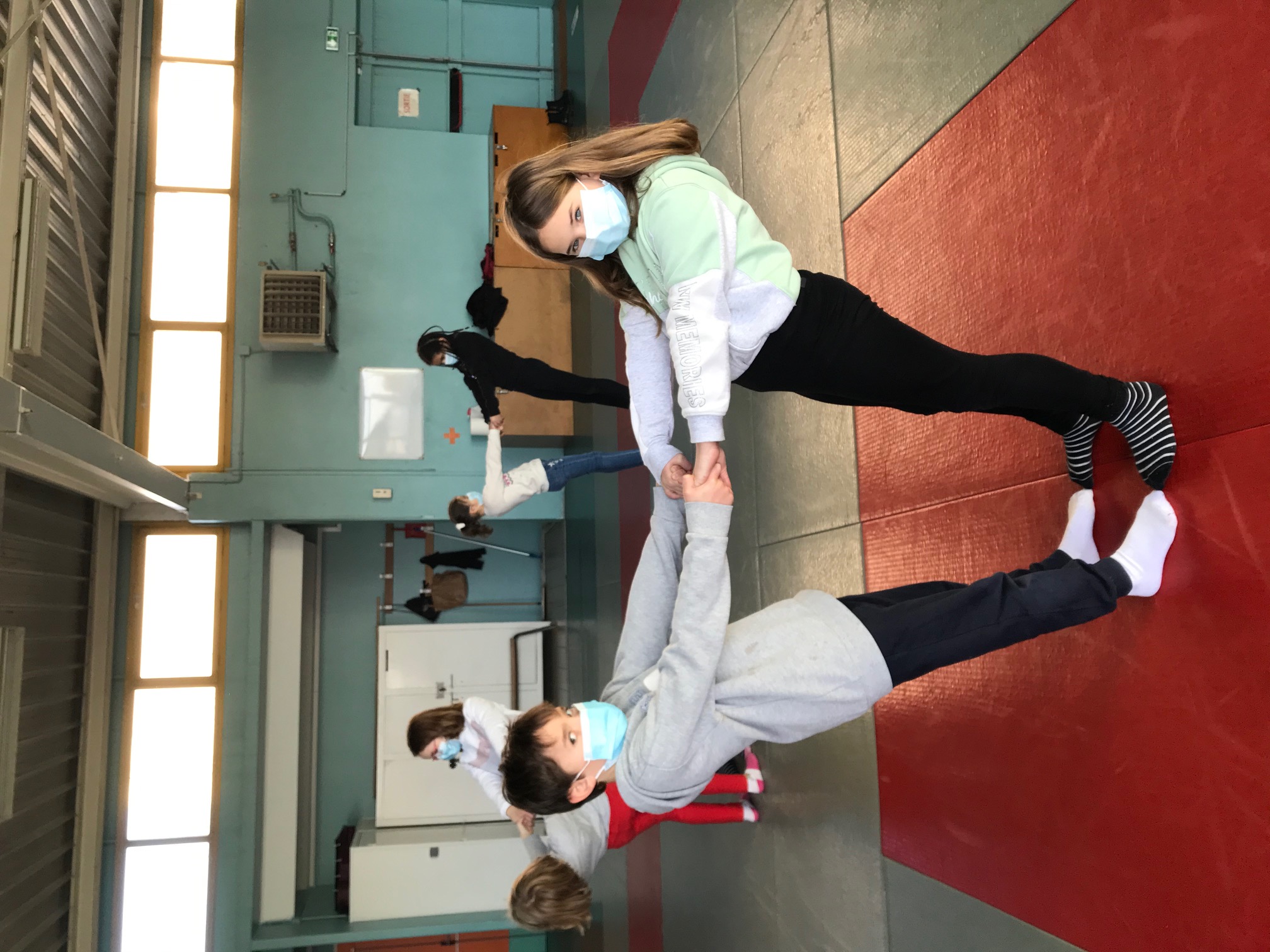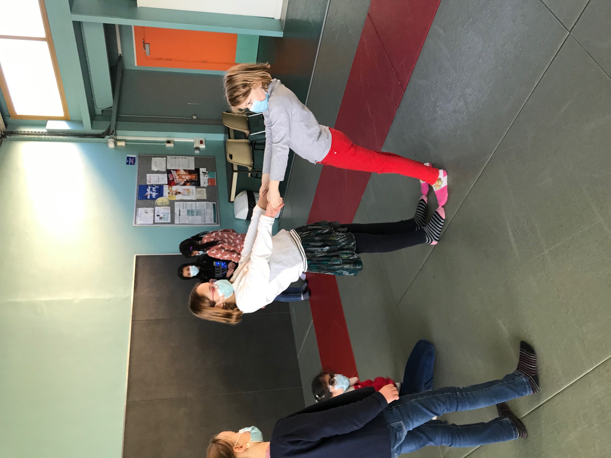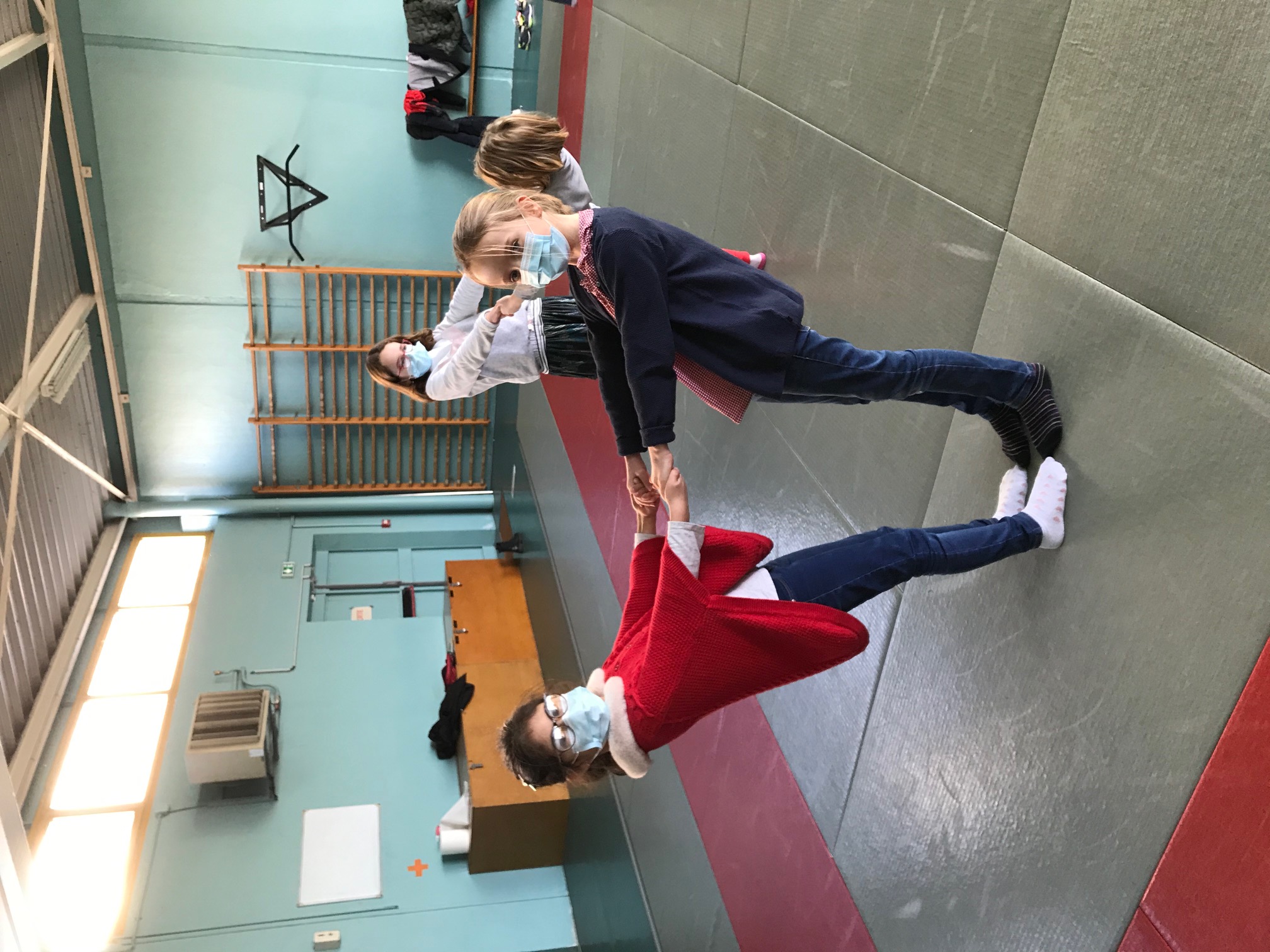 Tous les vendredis matins, pendant toute la troisième période, les CE2 se rendent au dojo de la Trocardière afin de découvrir l’acrosport! Même masqués, c’est un vrai plaisir d’éprouver les sensations de déséquilibre et d’équilibre (parfois fragile) dans des postures plus ou moins complexes. C’est à pied, avec une belle marche dynamique que nous nous rendons jusqu’à la salle, en traversant le parc de la Cité Radieuse. Les séances commencent toujours par un échauffement mesuré des principales articulations sollicitées. Cette discipline demande à chacun d’être à l’écoute de ses sensations et de faire confiance à son ou ses partenaires: c’est donc aussi un apprentissage en éducation morale et civique, comme souvent en sport! (respect de soi et des autres, respect des règles et des lieux, équité filles/garçons…)