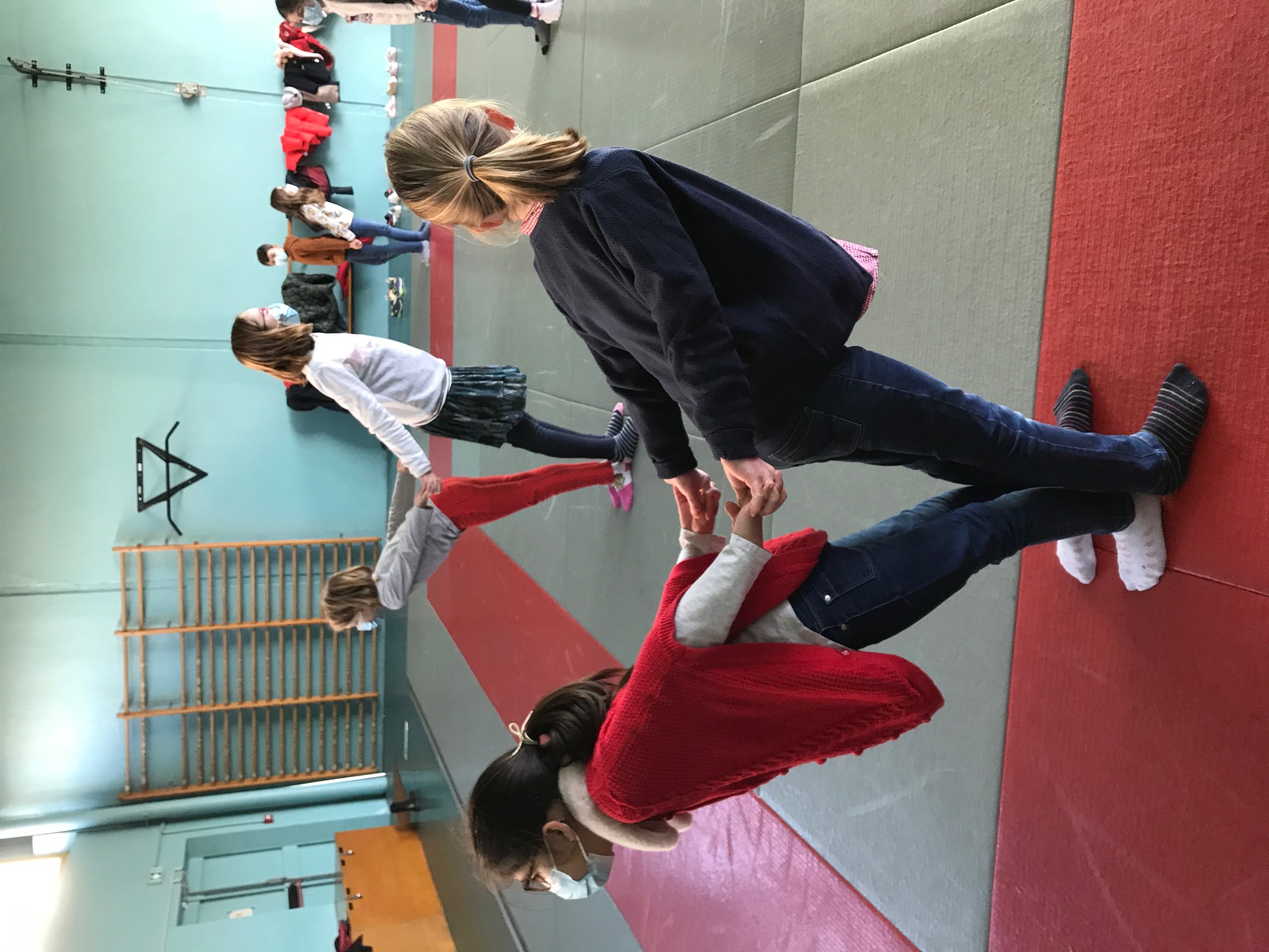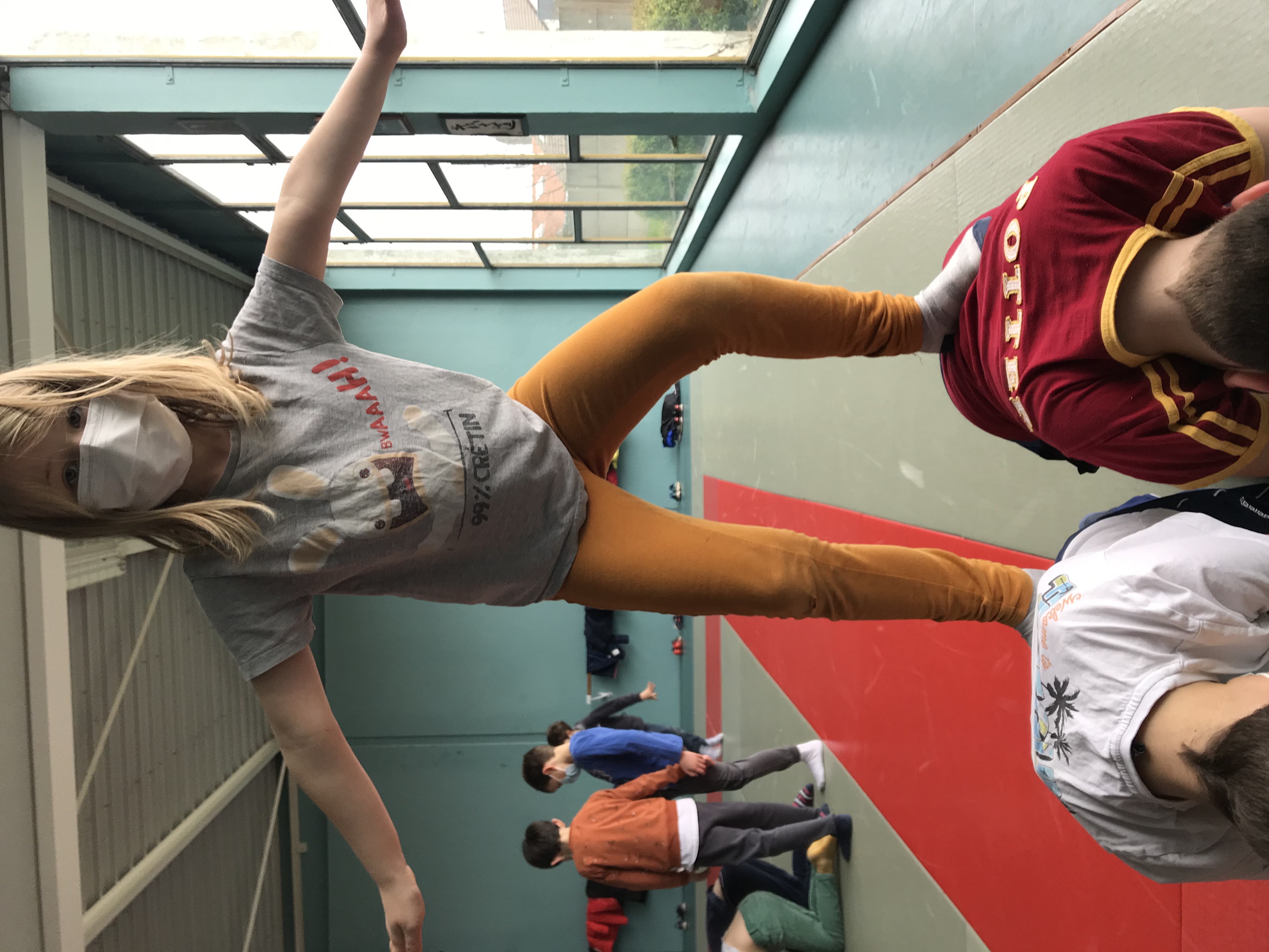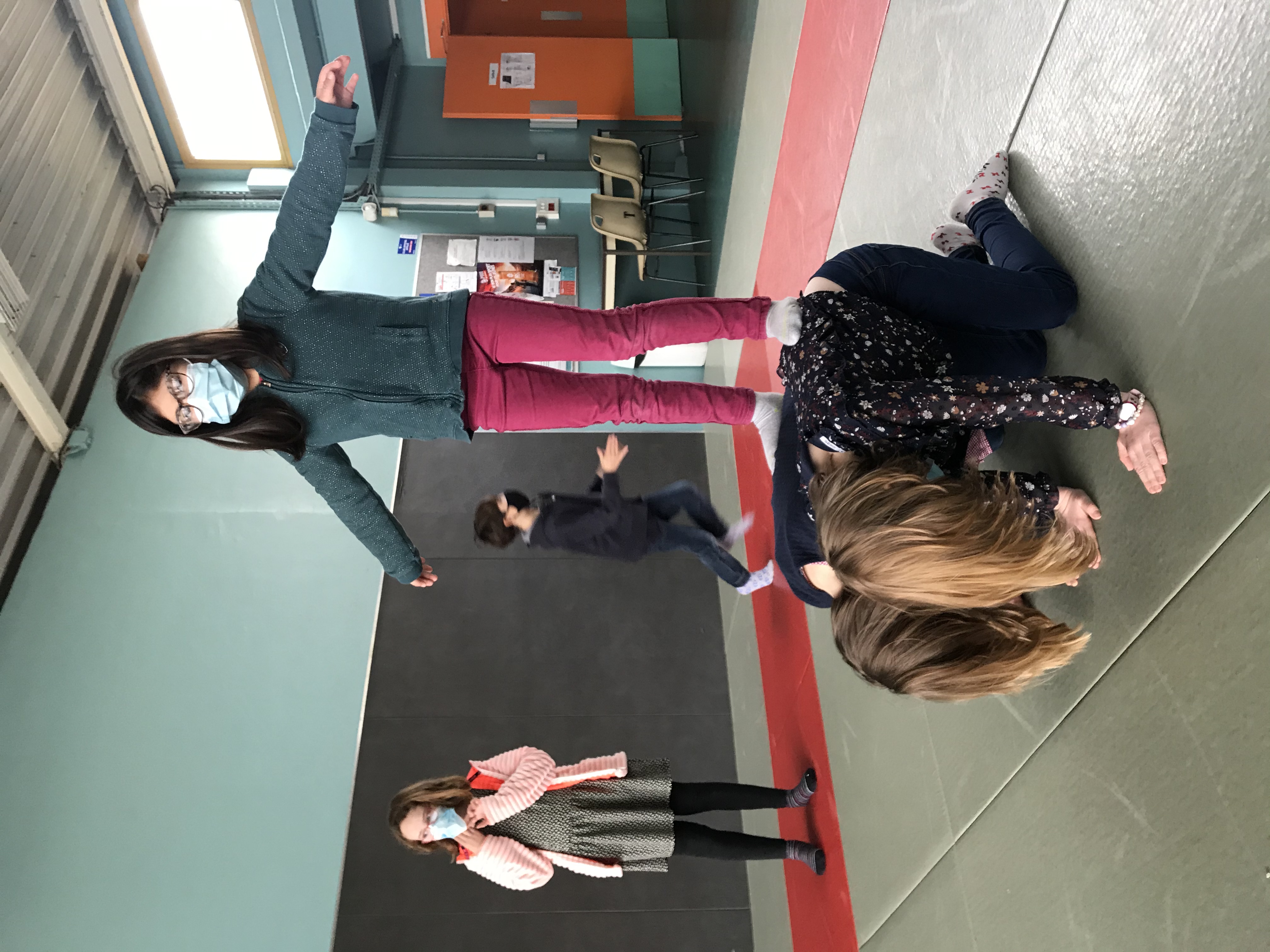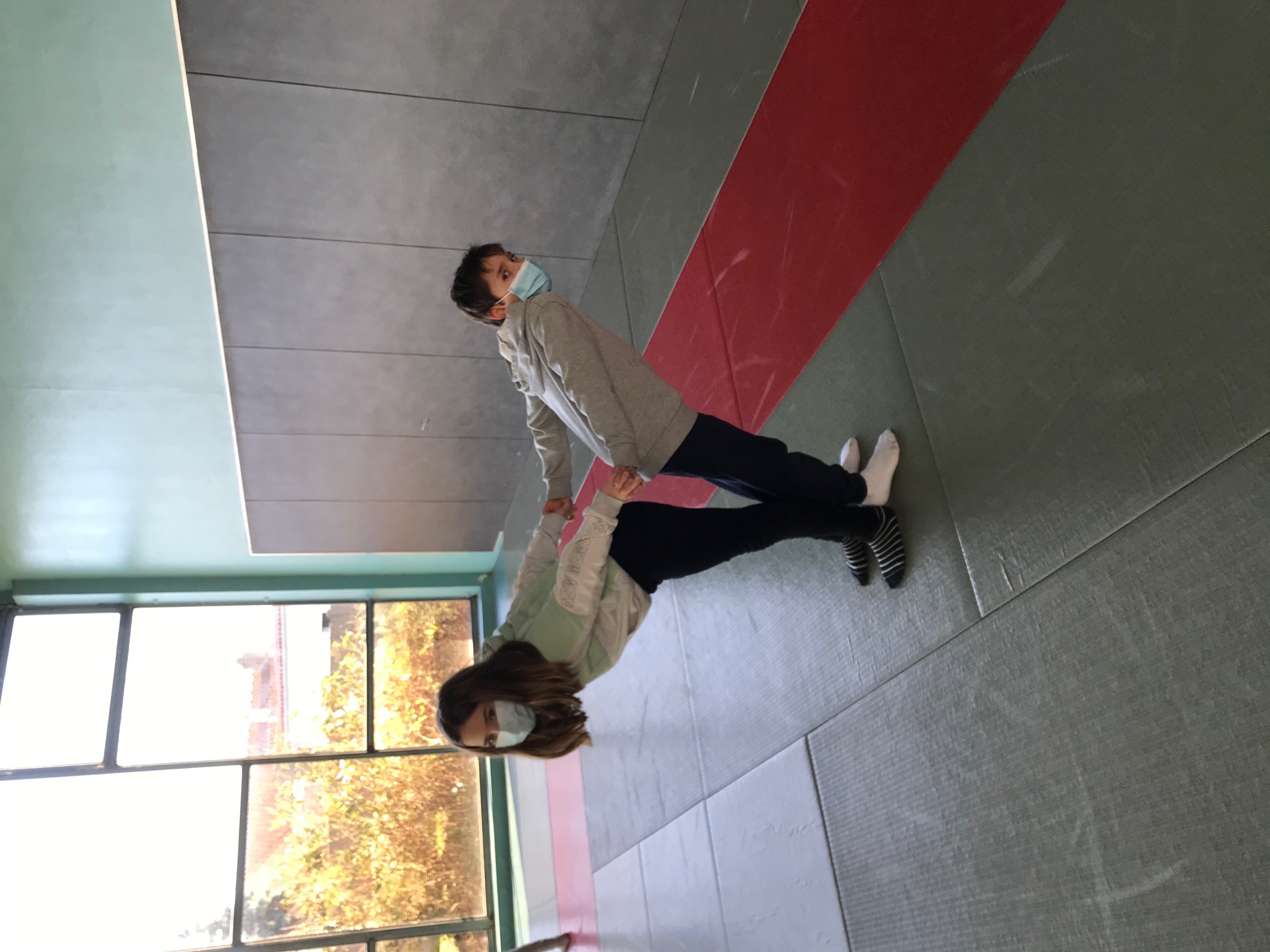 Tous les vendredis matins, pendant toute la troisième période, les CE2 se rendent au dojo de la Trocardière afin de découvrir l’acrosport! Même masqués, c’est un vrai plaisir d’éprouver les sensations de déséquilibre et d’équilibre (parfois fragile) dans des postures plus ou moins complexes. C’est à pied, avec une belle marche dynamique que nous nous rendons jusqu’à la salle, en traversant le parc de la Cité Radieuse. Les séances commencent toujours par un échauffement mesuré des principales articulations sollicitées. Cette discipline demande à chacun d’être à l’écoute de ses sensations et de faire confiance à son ou ses partenaires: c’est donc aussi un apprentissage en éducation morale et civique, comme souvent en sport! (respect de soi et des autres, respect des règles et des lieux, équité filles/garçons…)