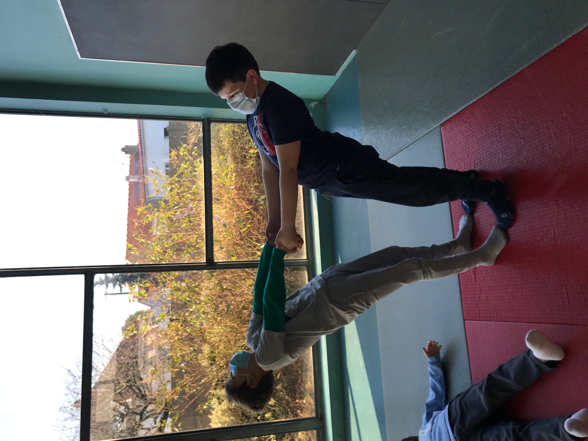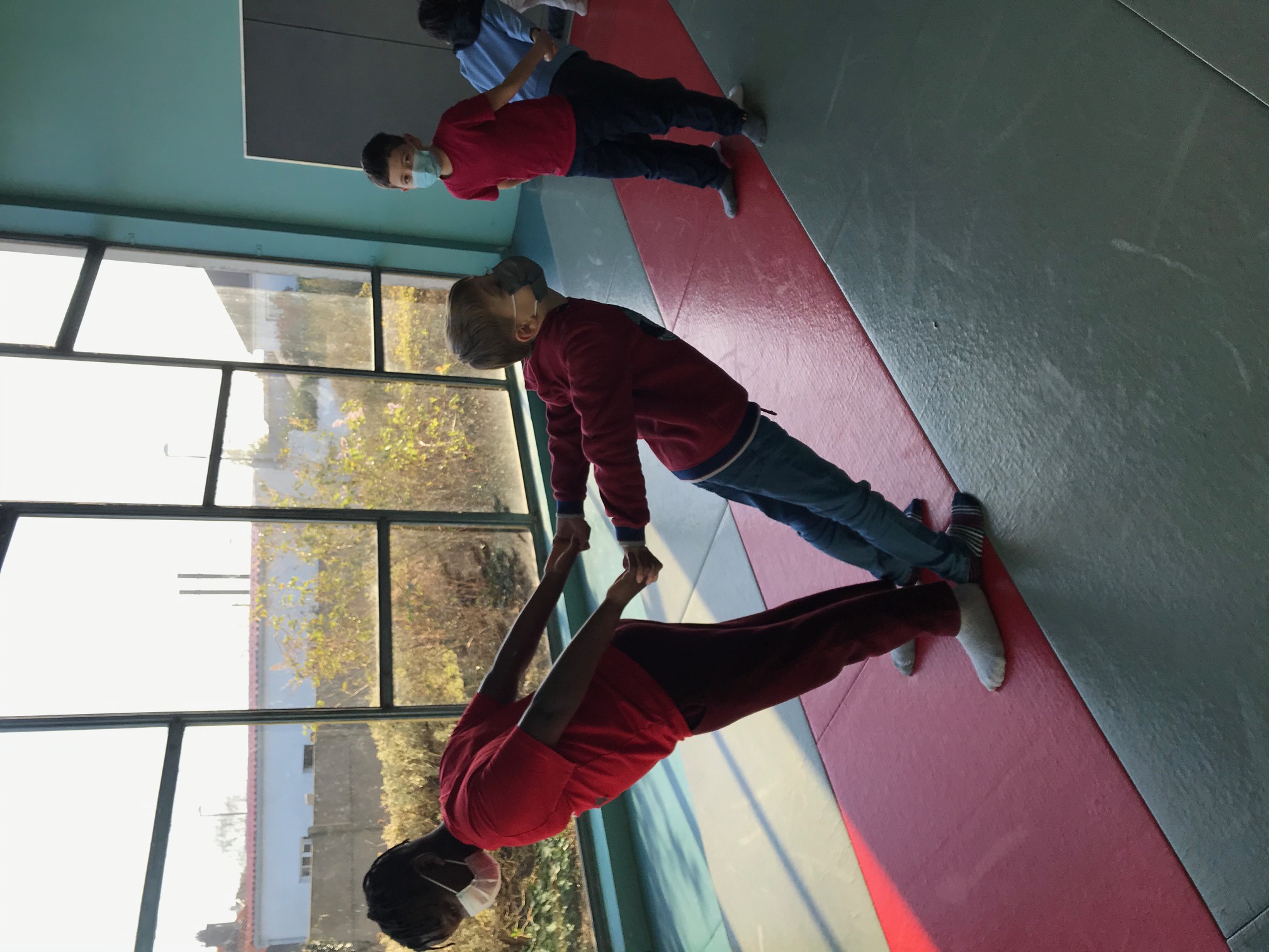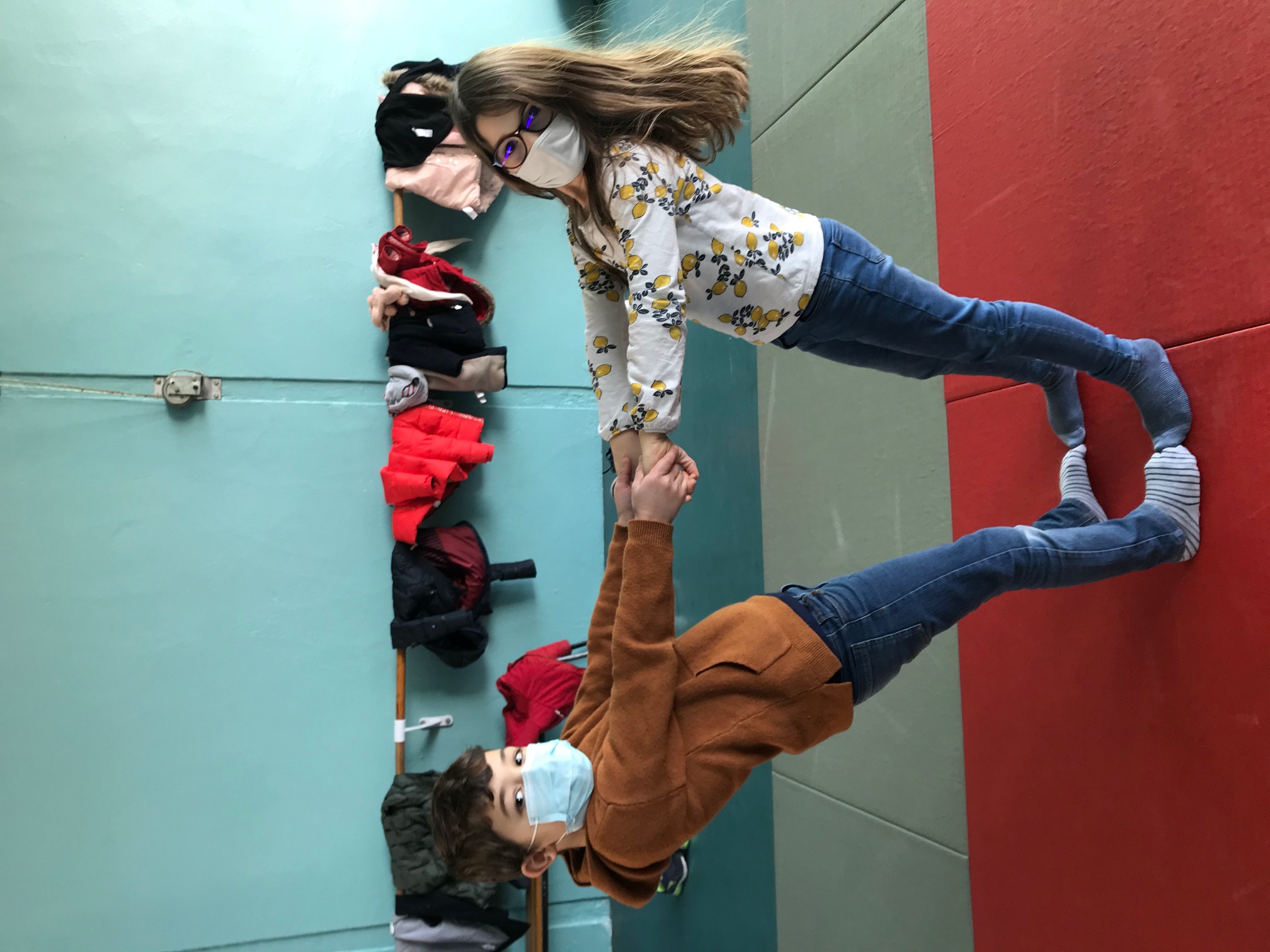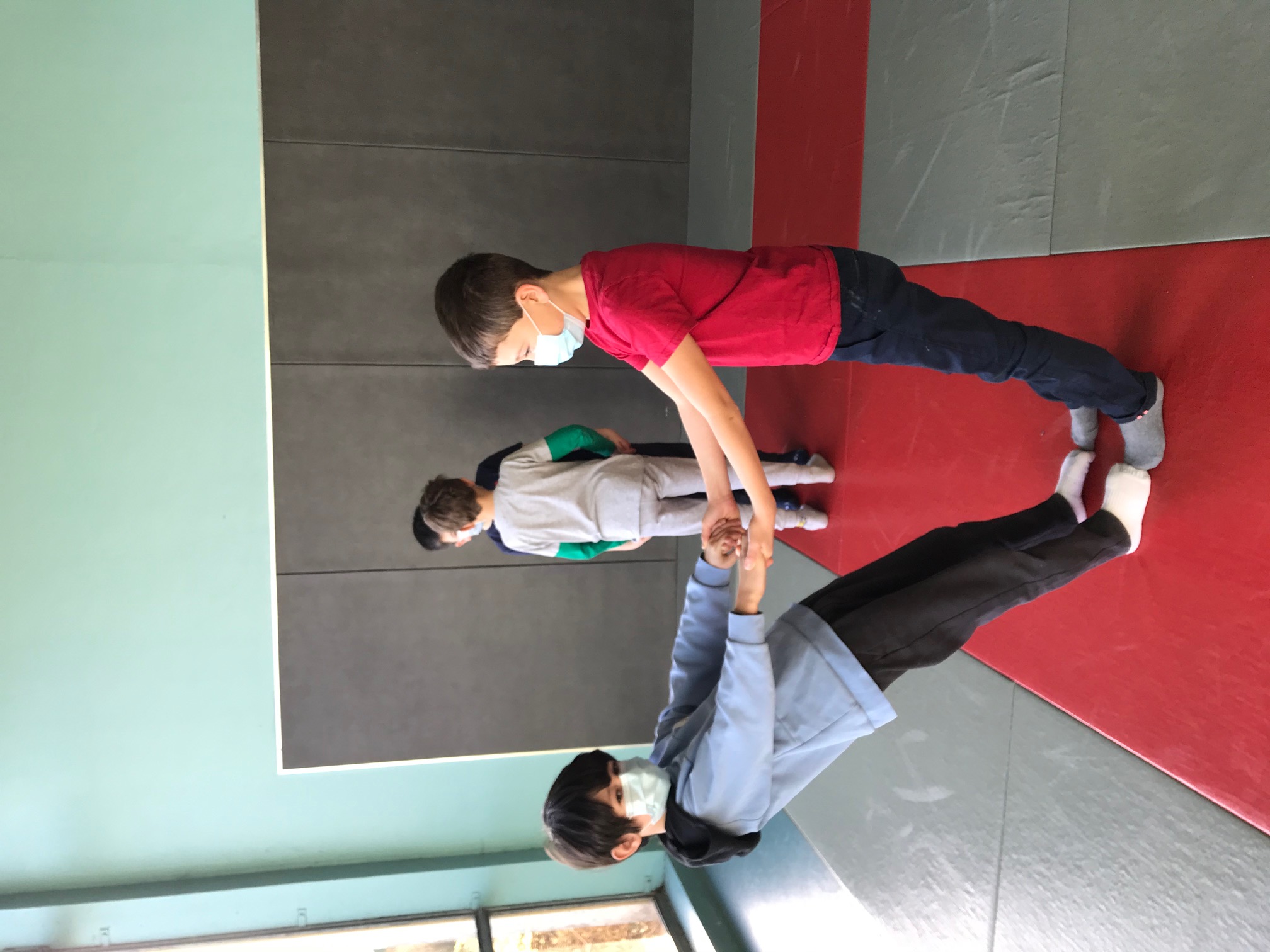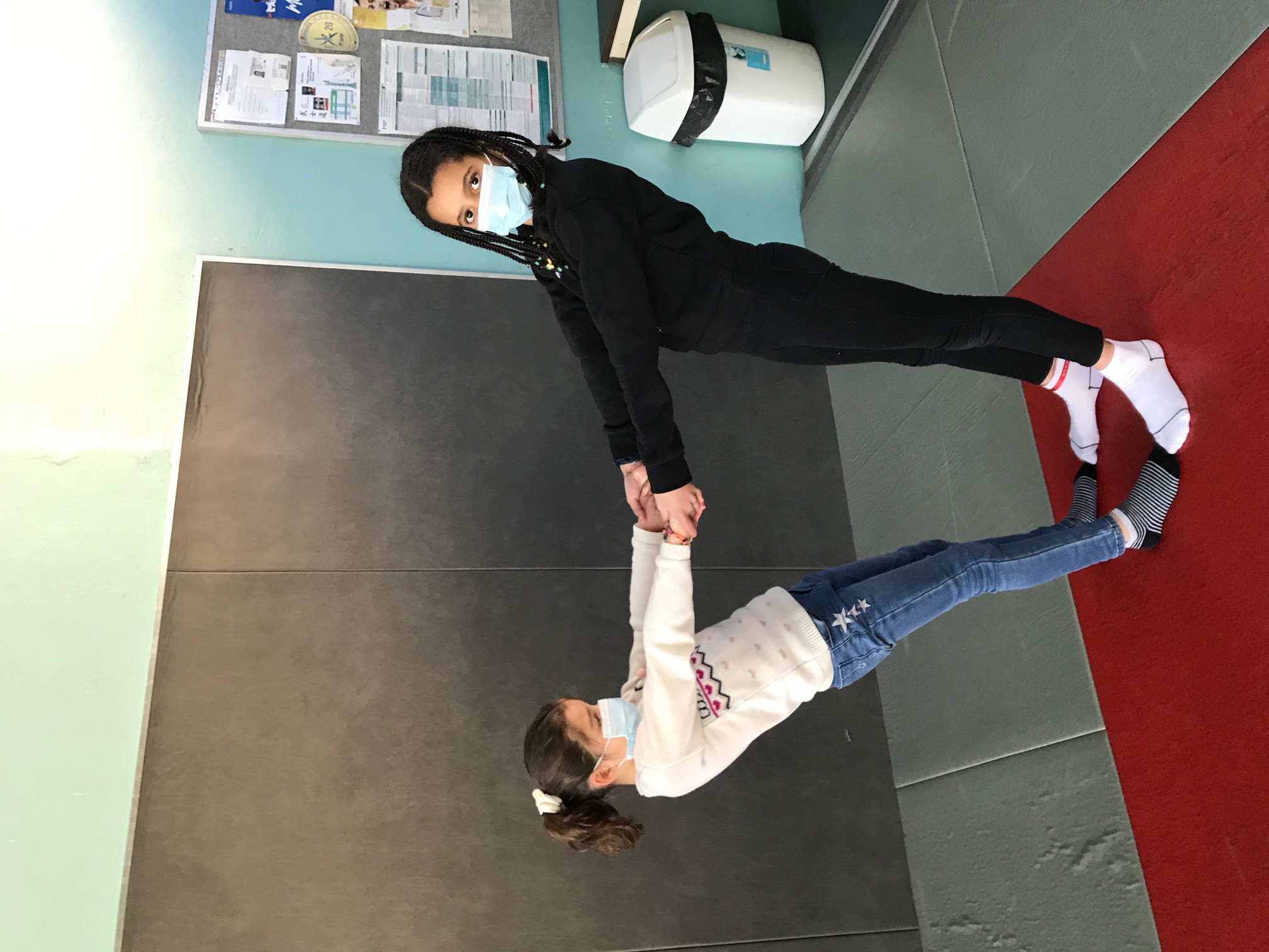 Tous les vendredis matins, pendant toute la troisième période, les CE2 se rendent au dojo de la Trocardière afin de découvrir l’acrosport! Même masqués, c’est un vrai plaisir d’éprouver les sensations de déséquilibre et d’équilibre (parfois fragile) dans des postures plus ou moins complexes. C’est à pied, avec une belle marche dynamique que nous nous rendons jusqu’à la salle, en traversant le parc de la Cité Radieuse. Les séances commencent toujours par un échauffement mesuré des principales articulations sollicitées. Cette discipline demande à chacun d’être à l’écoute de ses sensations et de faire confiance à son ou ses partenaires: c’est donc aussi un apprentissage en éducation morale et civique, comme souvent en sport! (respect de soi et des autres, respect des règles et des lieux, équité filles/garçons…)