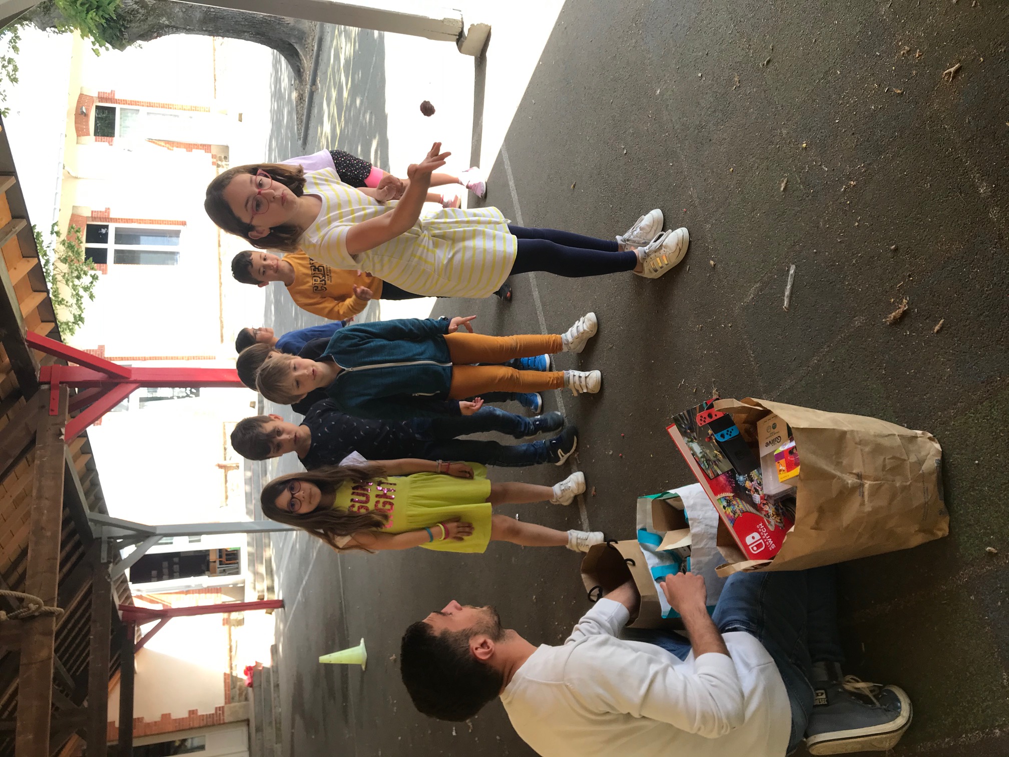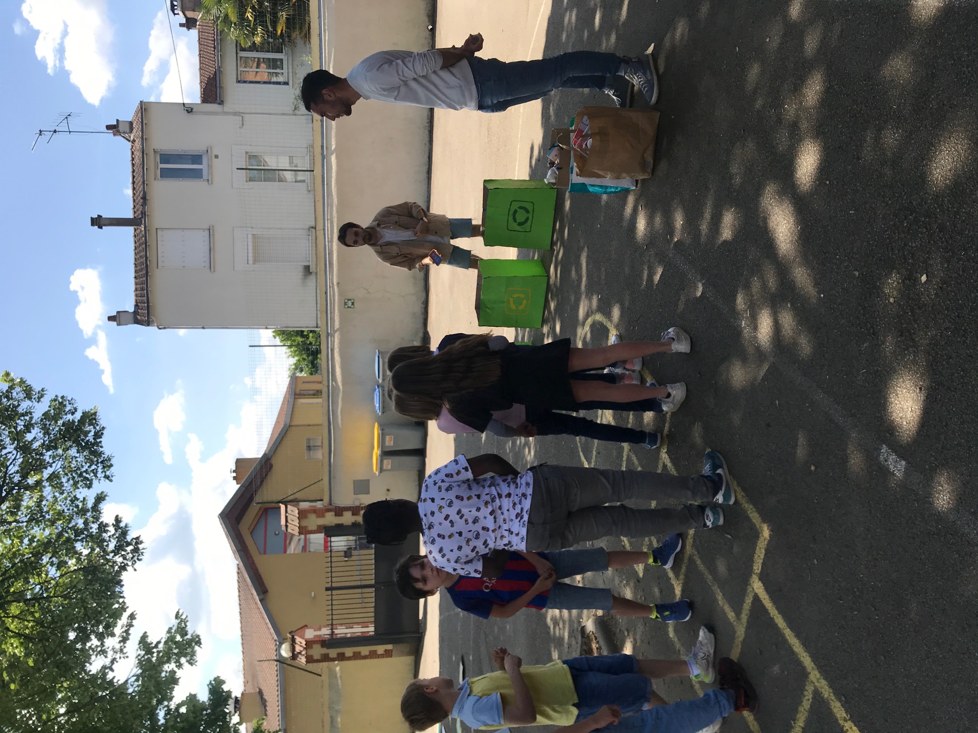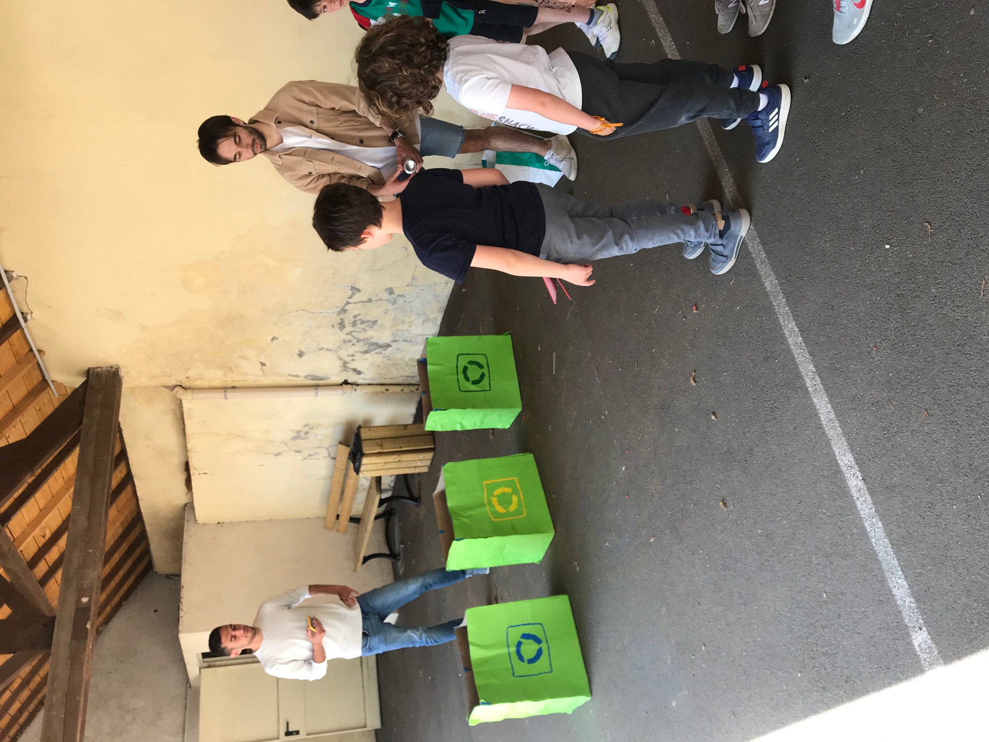 – un basket’tri ( 3 poubelles avec des logos différents et un grand sac de déchets secs pour apprendre à trier et recycler) (sur la cour)