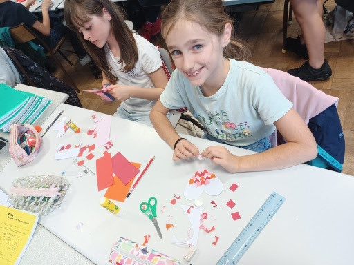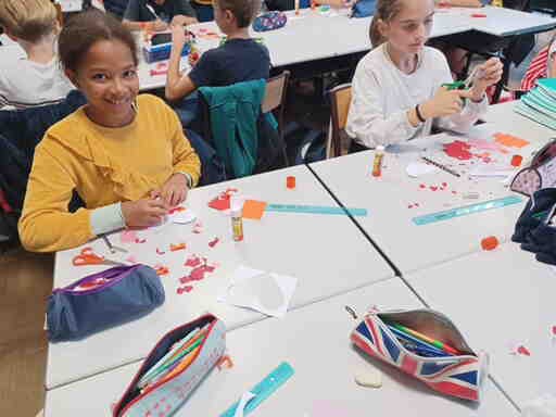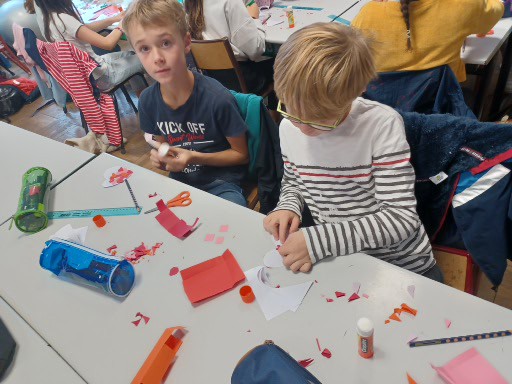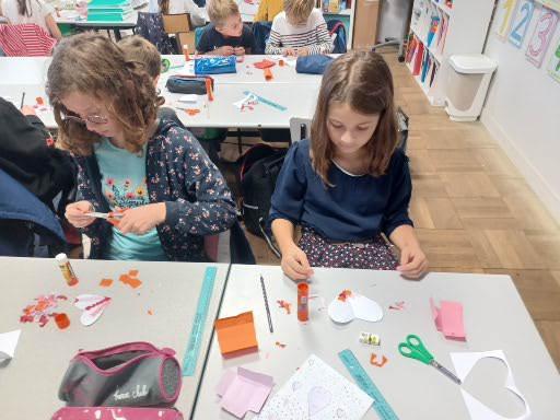 Afin de préparer notre assemblée d’enfants du 29 septembre, nous avons, comme nos camarades de toute l’école, confectionné des petits cœurs en papier qui ont dans un premier temps orné nos pulls et gilets avant d’être collés sur 8 grands cœurs collectifs (un par classe, que vous pouvez également admirer dans l’article concernant l’assemblée).