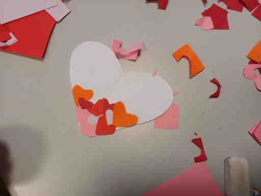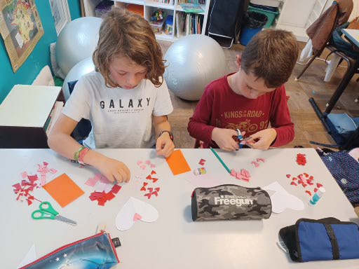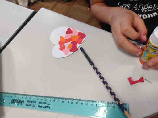 Afin de réaliser nos petits cœurs, il a d’abord fallu en découper des minuscules dans du papier de couleur. Cela nous a pris un peu de temps, la patience et la minutie furent indispensables. A la fin, nous étions très fiers de nos cœurs !