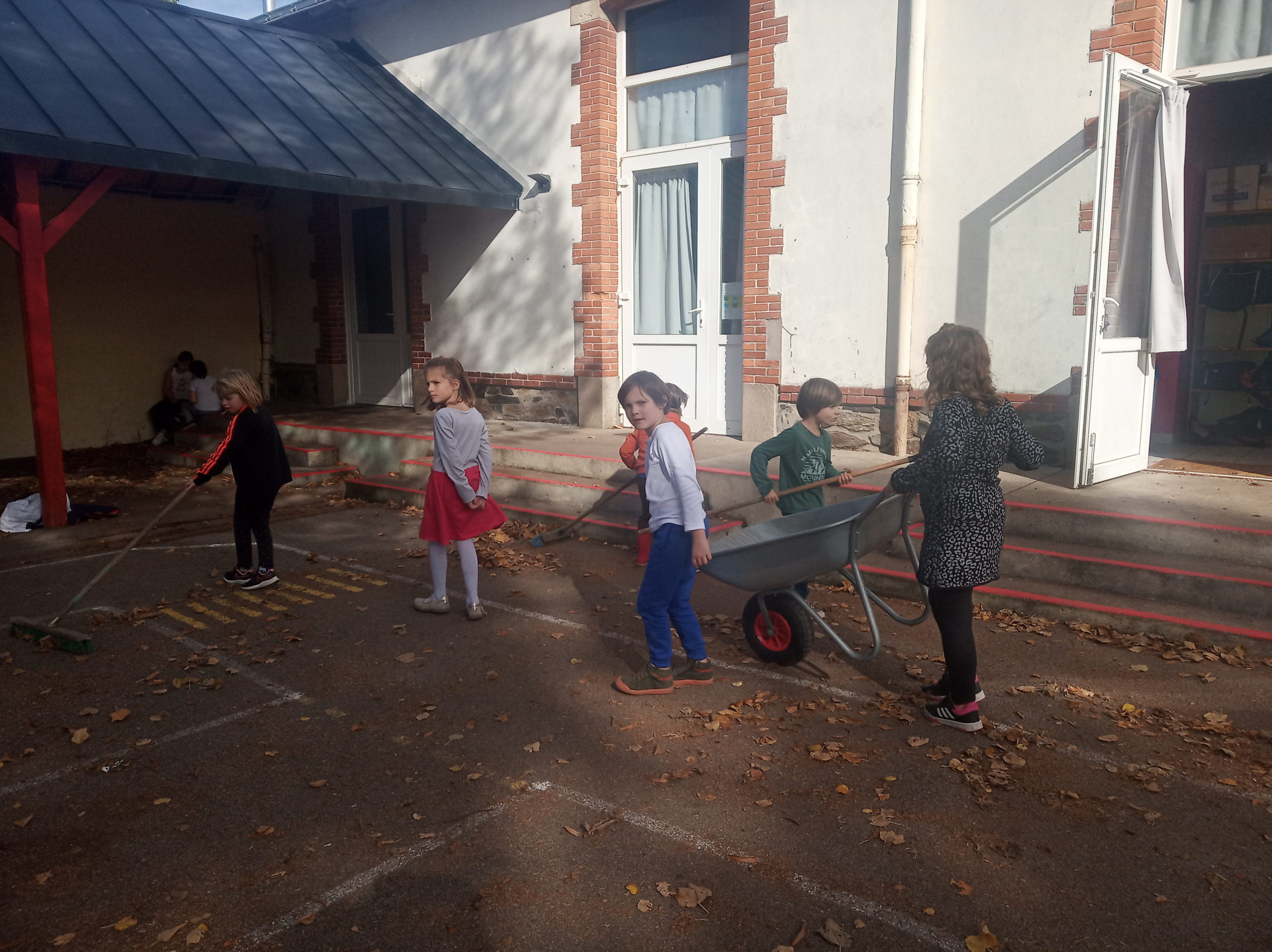 L’automne est bien là ! Les feuilles tombent sur notre cour. Dès que les portes des classes s’ouvrent pour la récréation, des enfants filent vers les balais et la brouette pour commencer leur service: le ramassage des feuilles. Une fois leur brouette pleine, direction le composteur du jardin. Bravo les enfants !