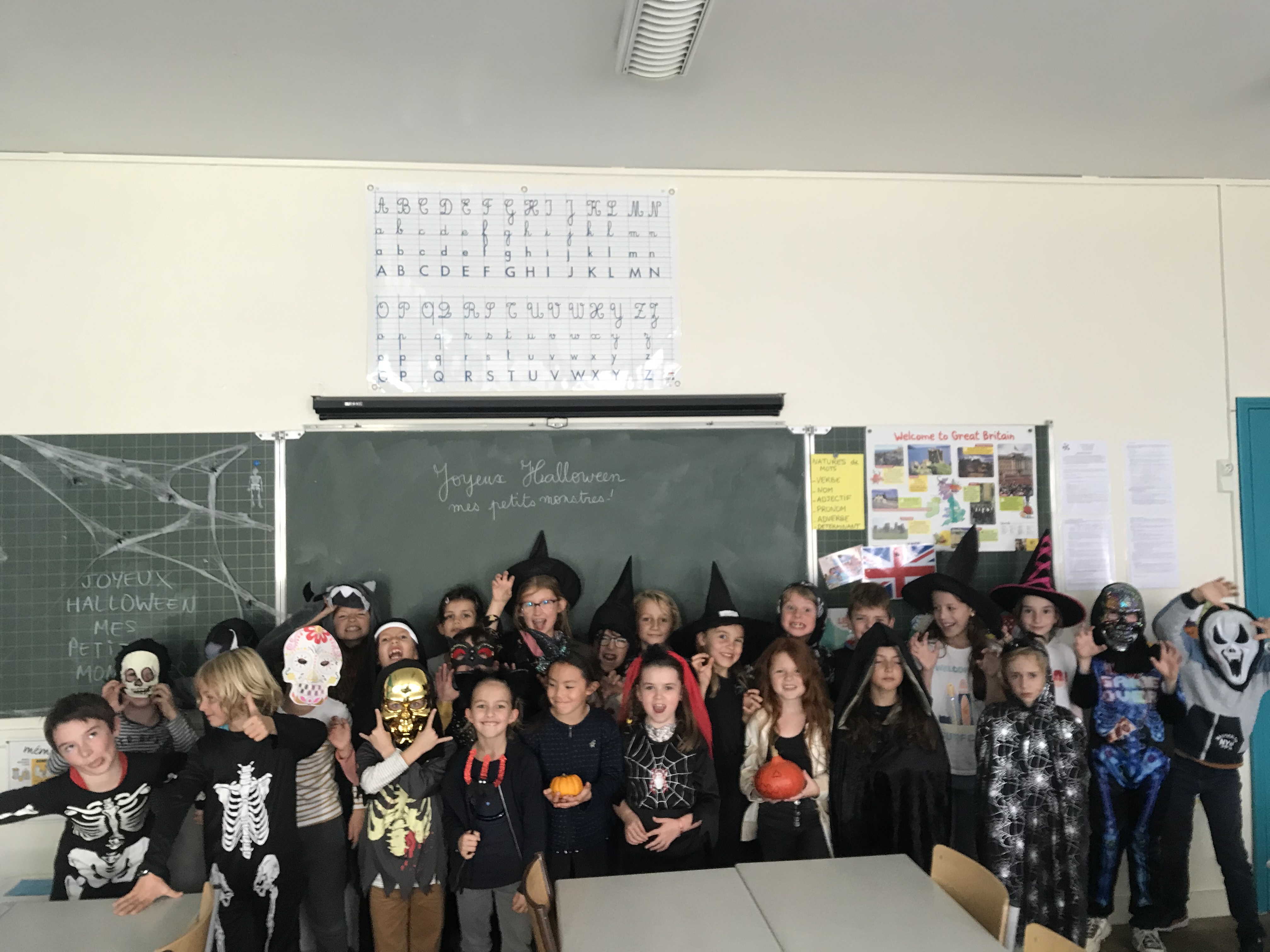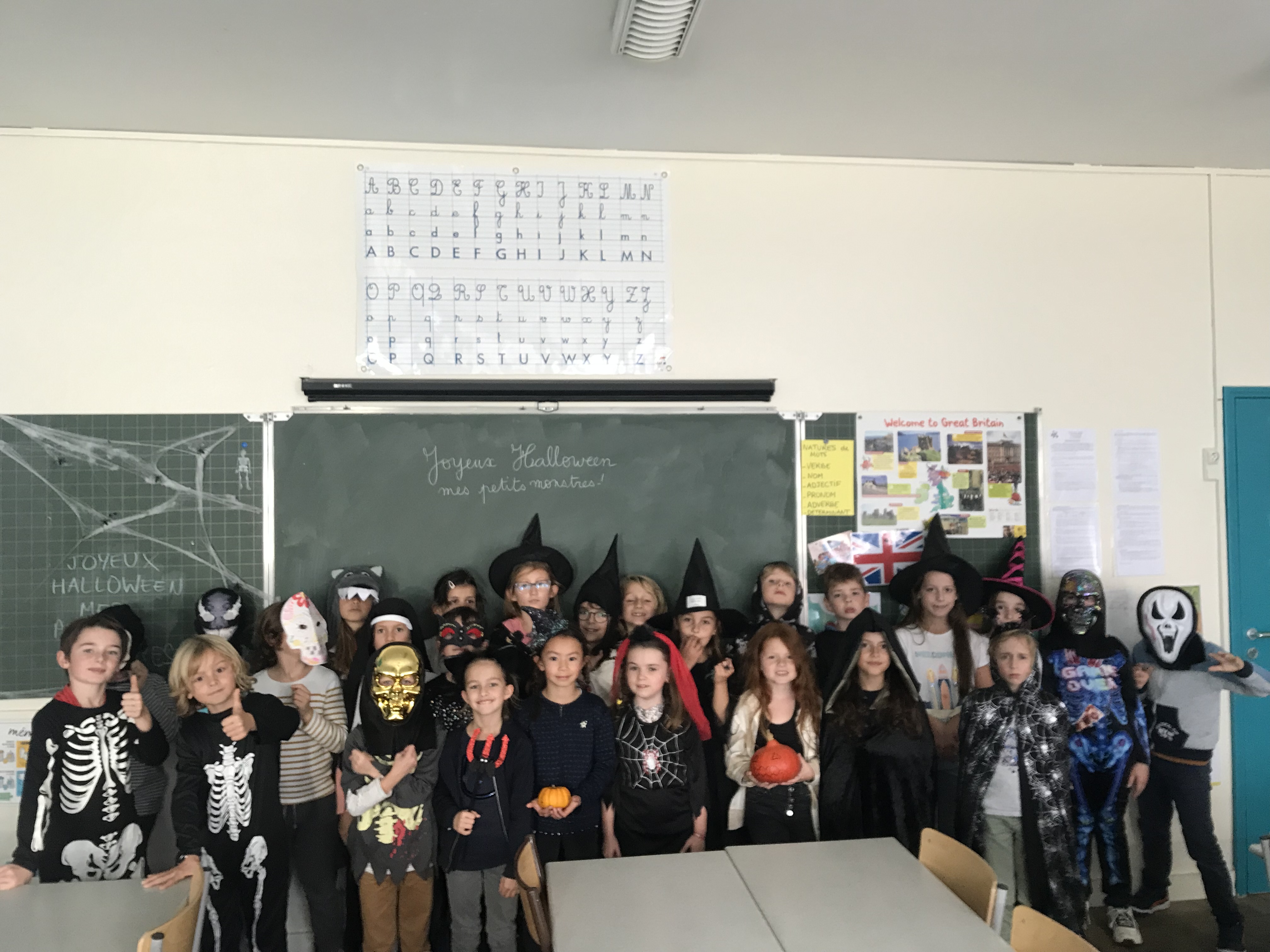 La maitresse nous a aussi expliqué l’origine de cette fête de Halloween, devenue commerciale, ancienne fête celtique païenne apportée par les Irlandais aux USA. Nous avons aussi compris le lien avec la fête chrétienne de la Toussaint, sur laquelle nous avons pu lire ensemble quelques informations.