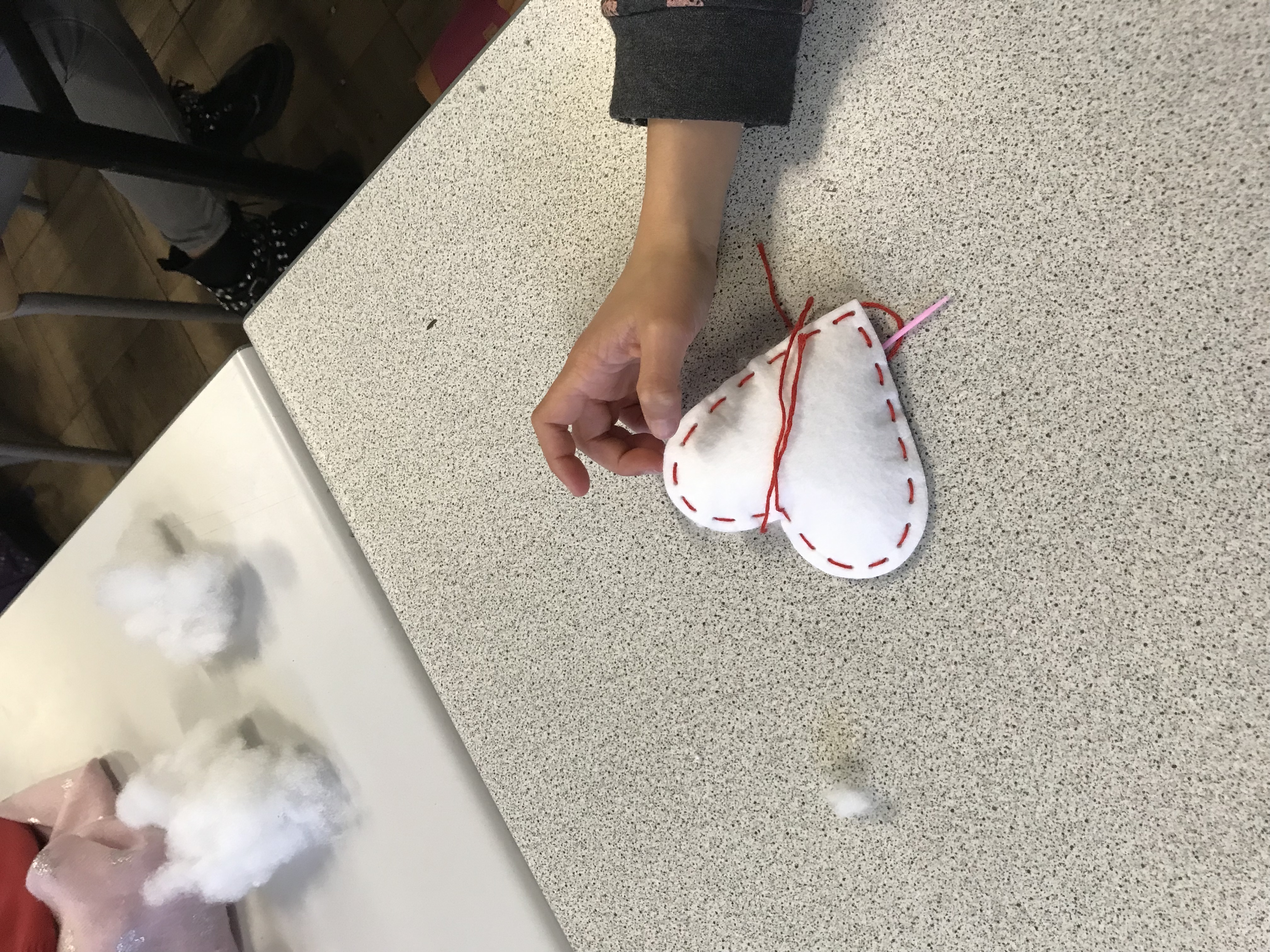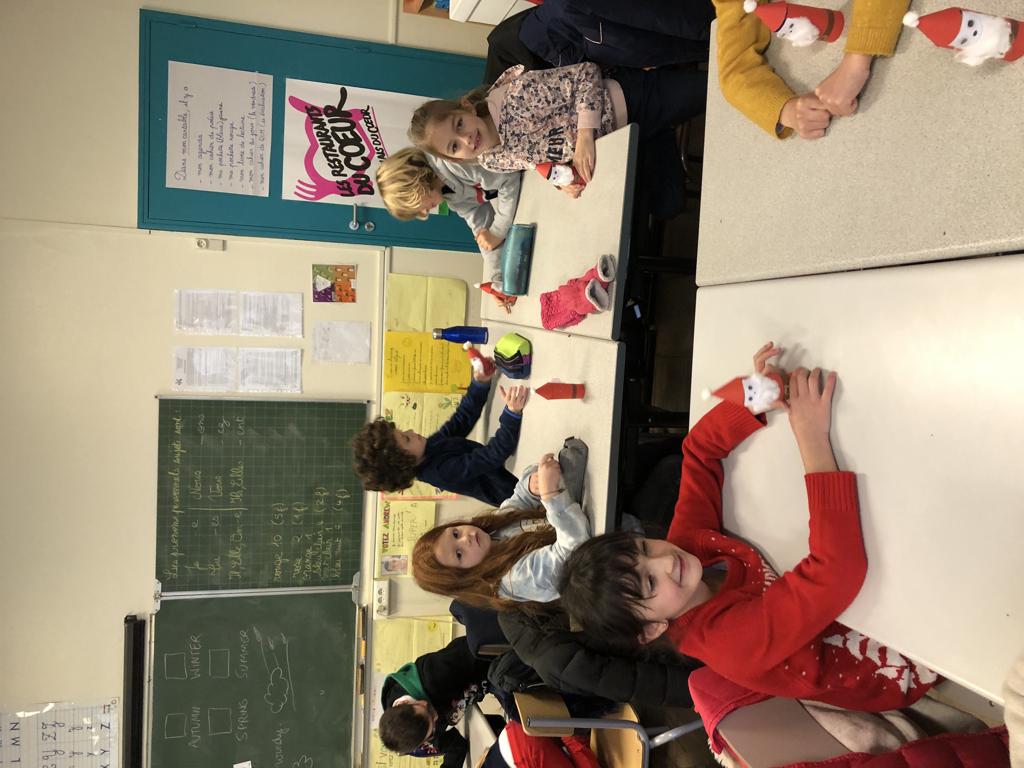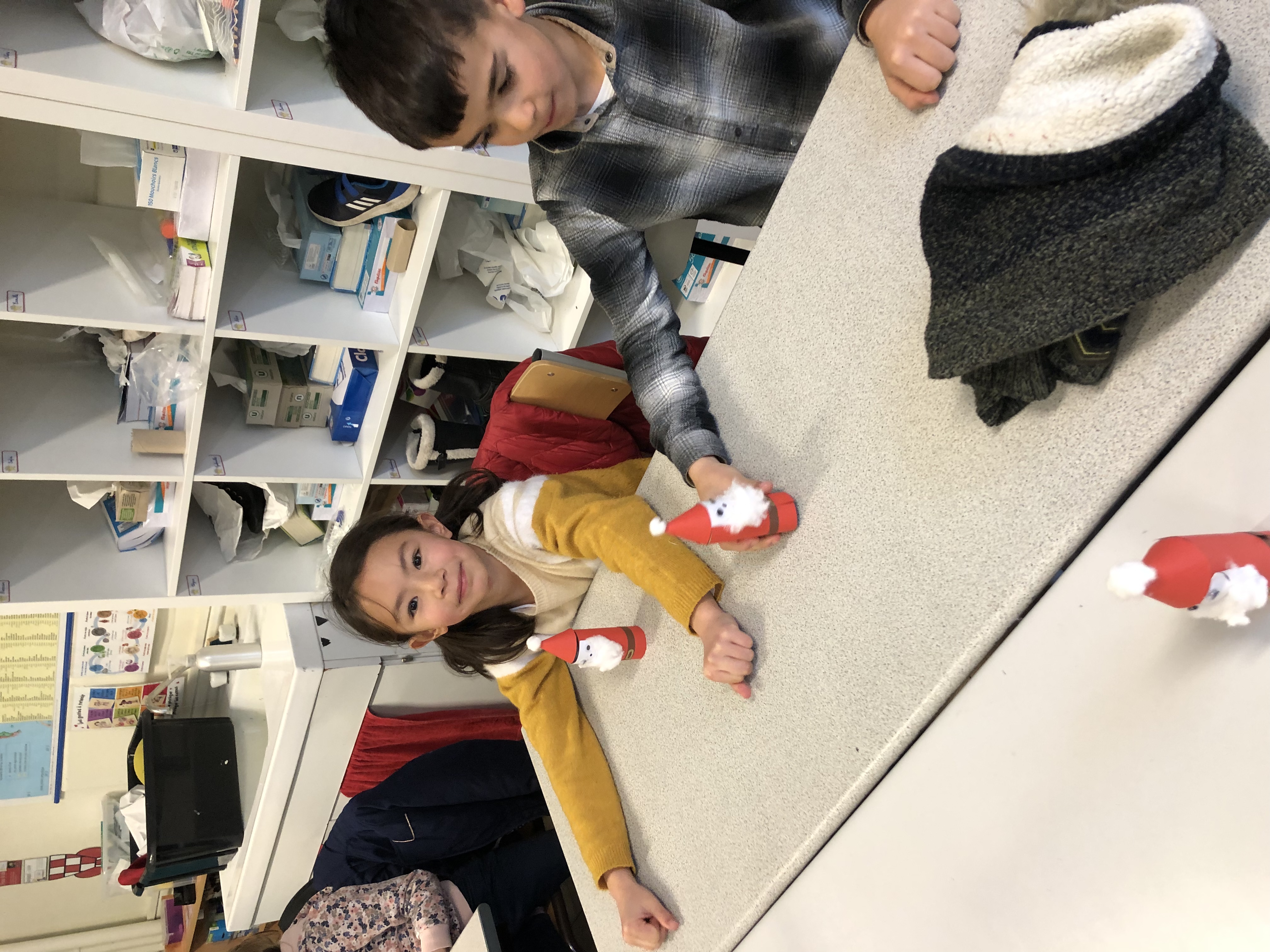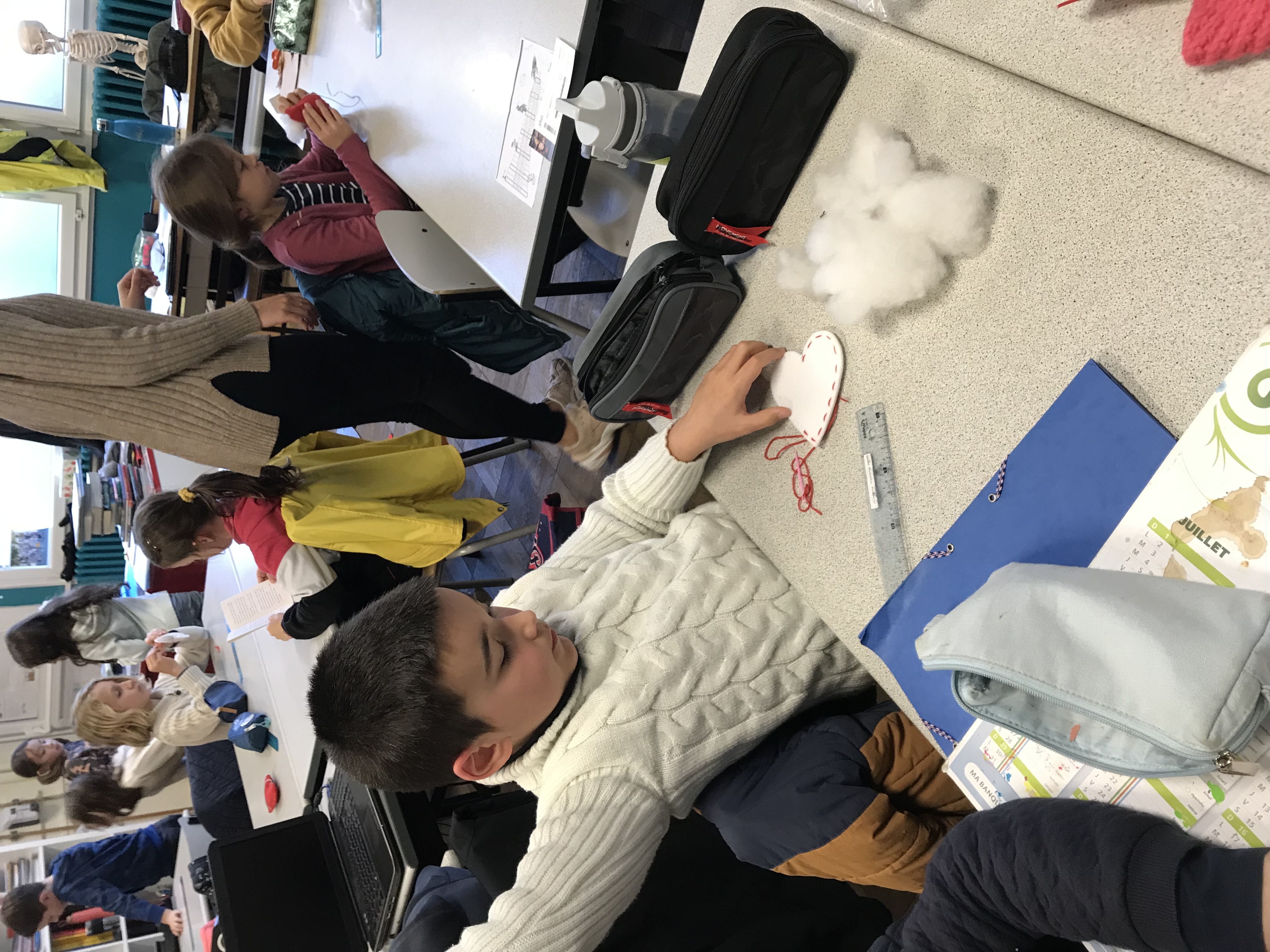 En CE2, c’est avec un plaisir non dissimulé que les élèves ont confectionné des coeurs en feutrine rembourrés pour décorer la maison ou le sapin, ainsi que de jolis pères Noël (avec les explications de Clara, stagiaire professeur des écoles, qui nous accompagne pendant un mois). Merci aussi à Lise, employée par l’OGEC, pour son aide pendant l’atelier de fabrication!