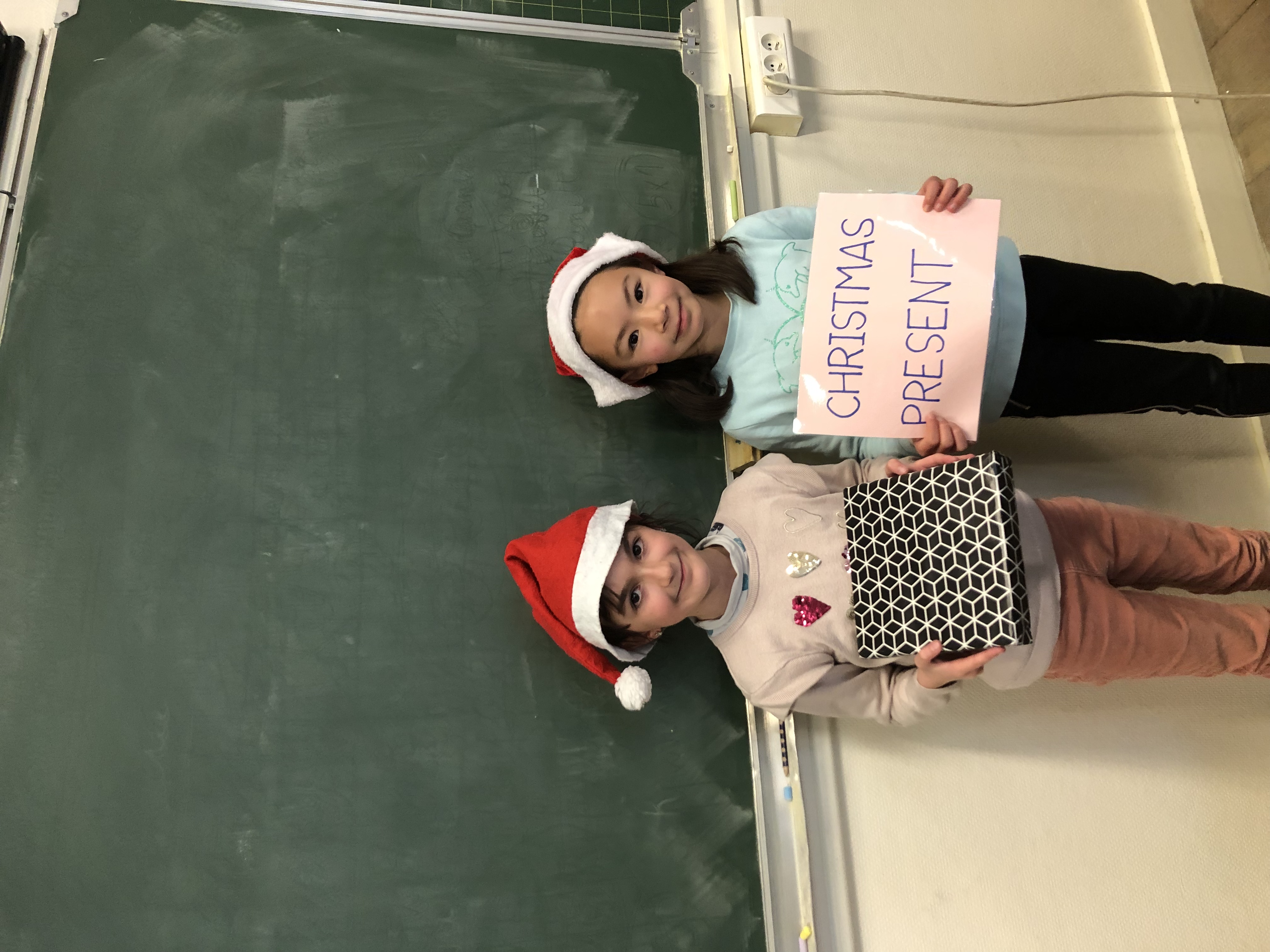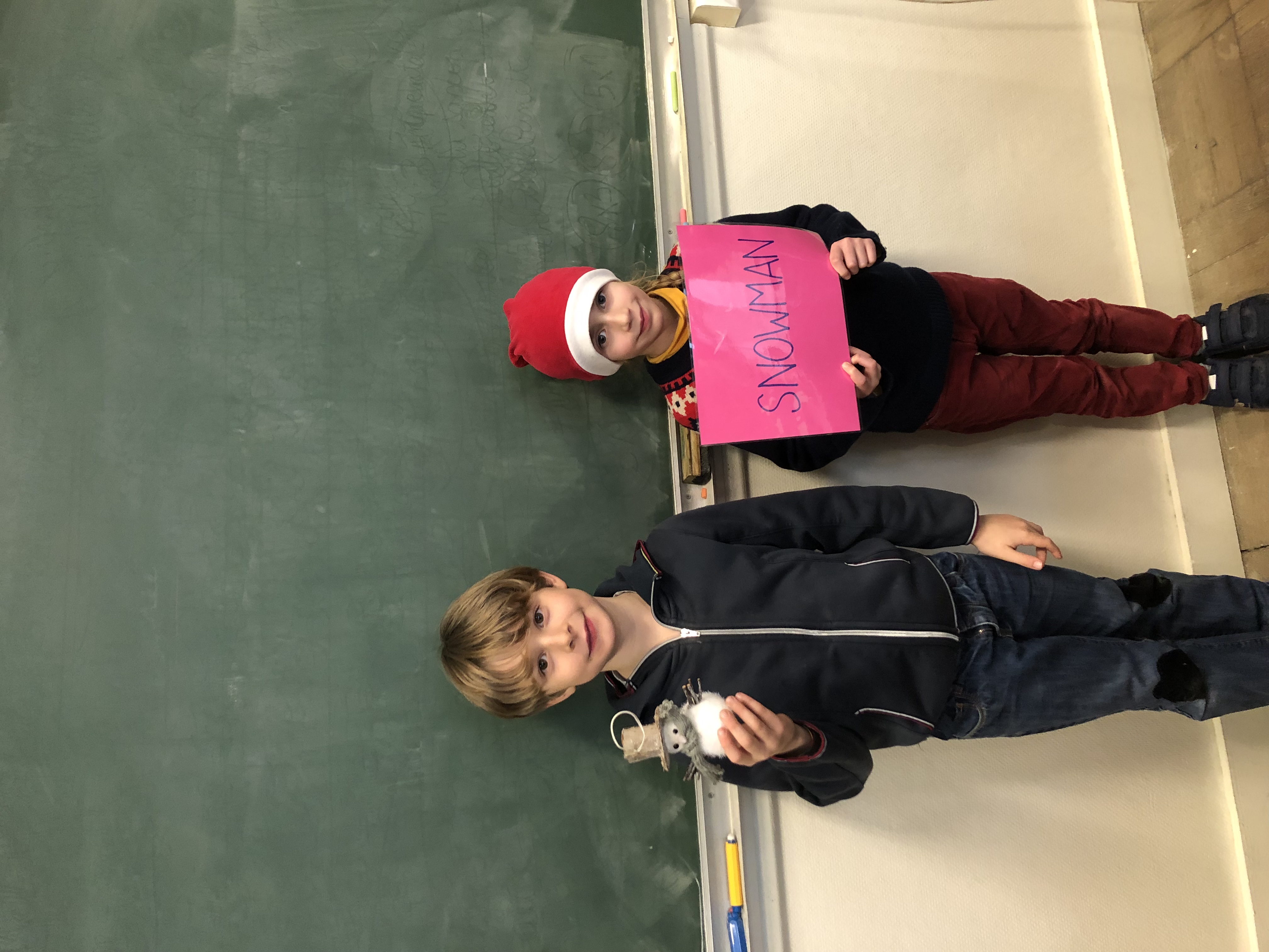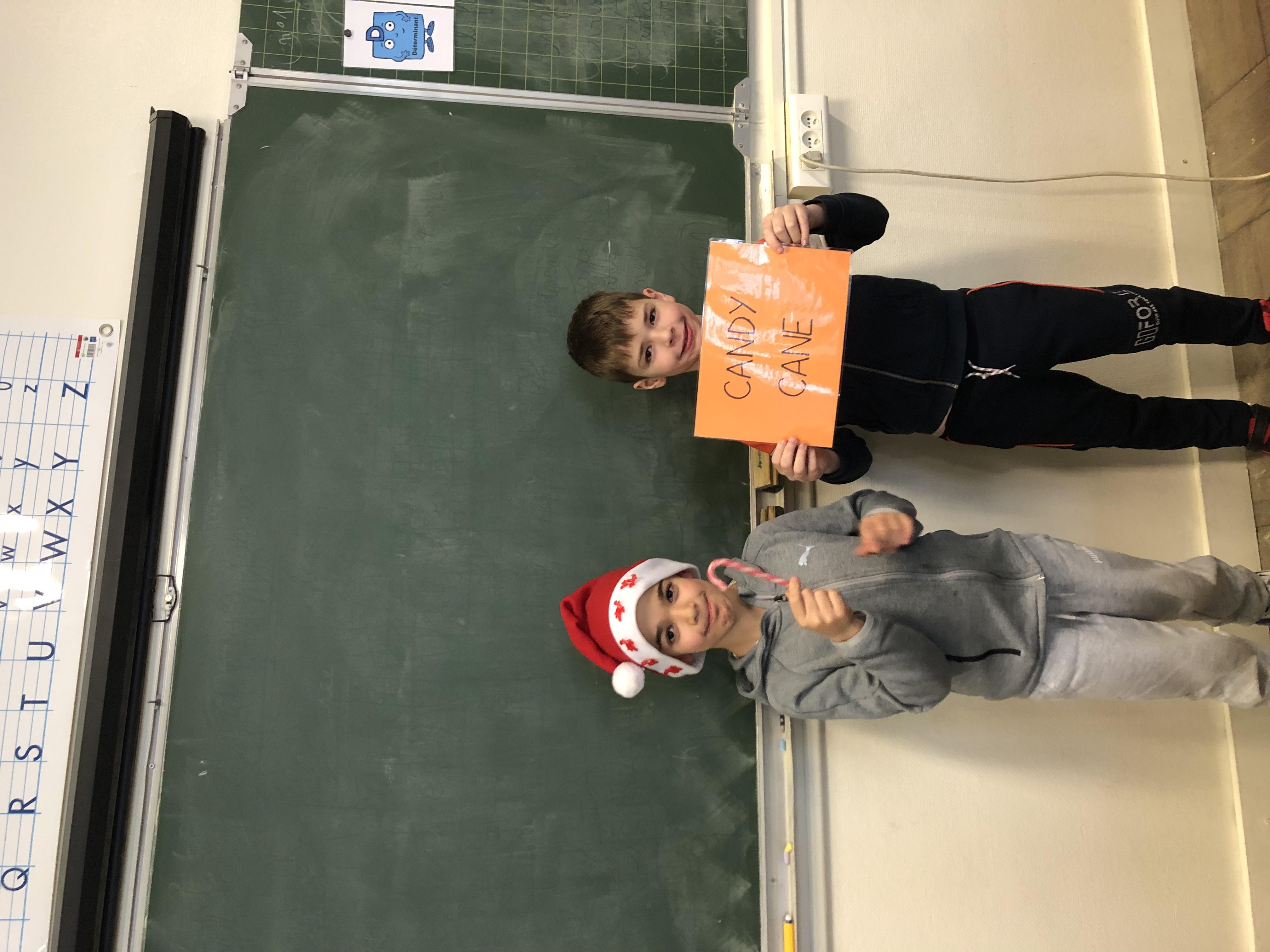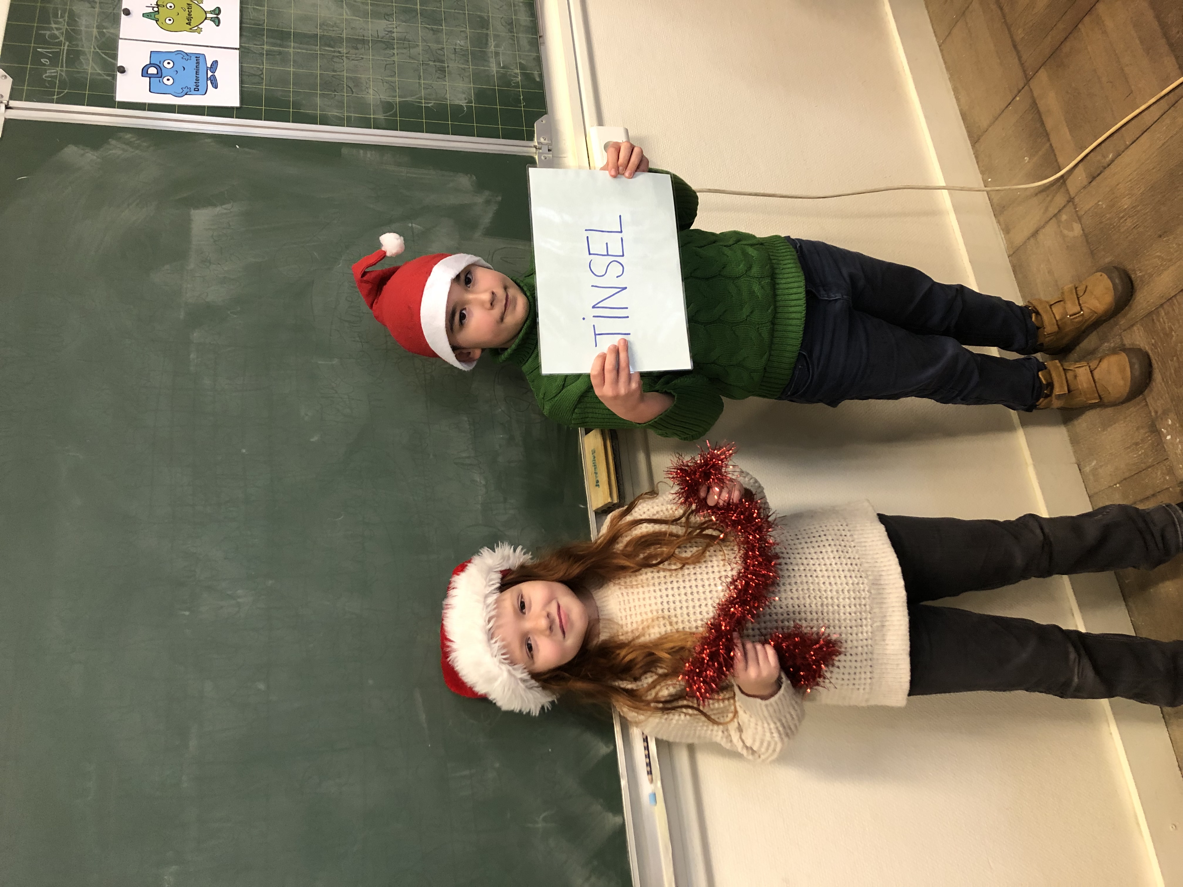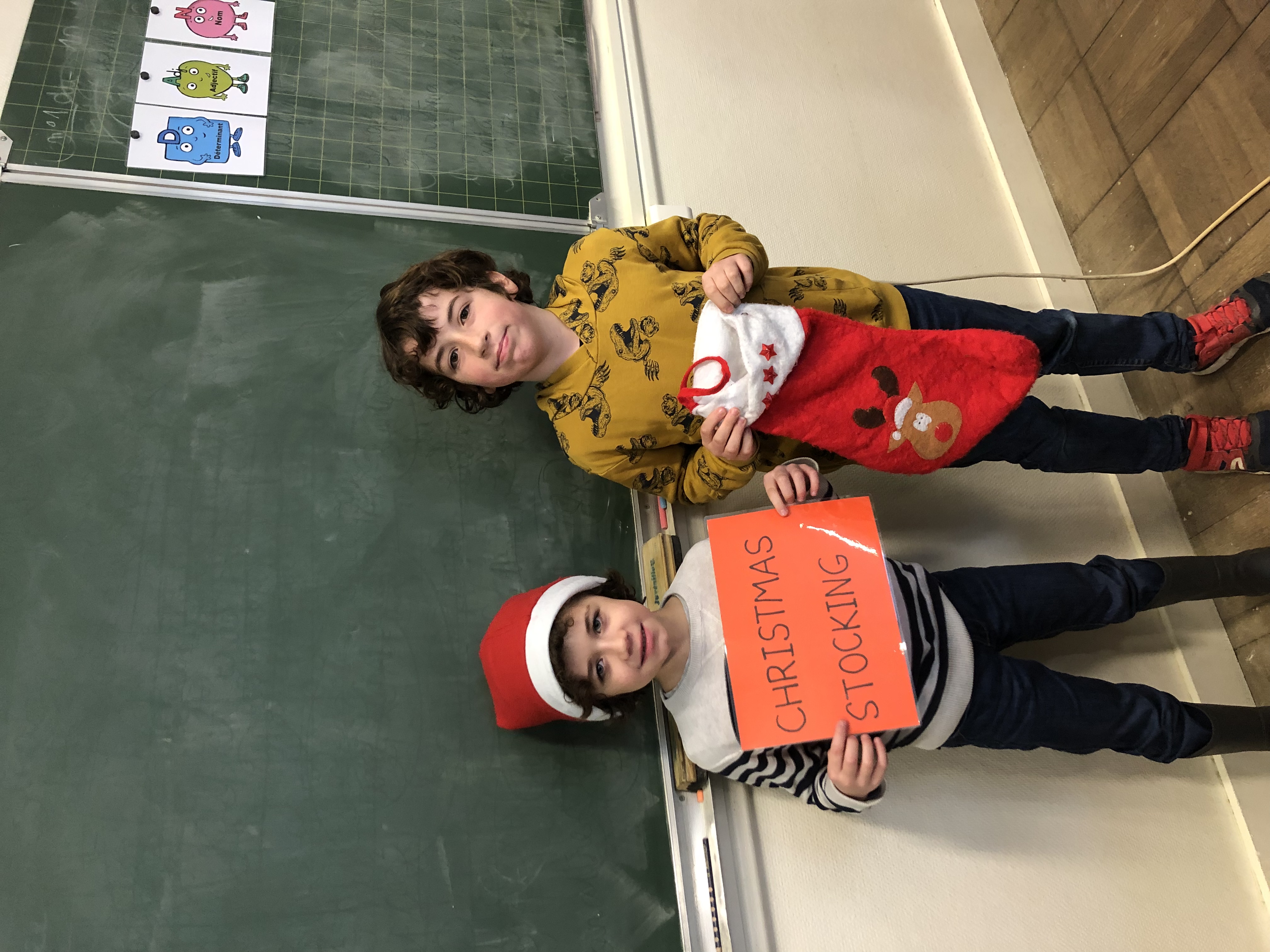 Avec tout leur coeur, les CE2 ont préparé une présentation du vocabulaire de Noël en anglais appris en classe et destinée à l’assemblée d’enfants de l’école. Coiffés de leur bonnet rouge et blanc, ils ont présenté par binôme l’objet (ou le chant 😉 ) pour accompagner leur phrase et leur affiche du mot. What a success!